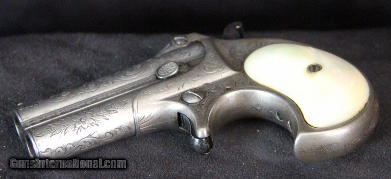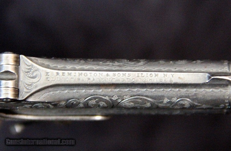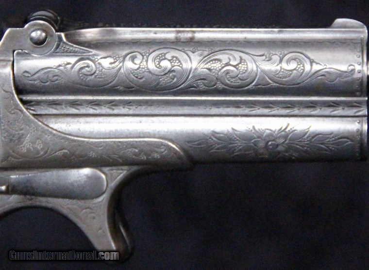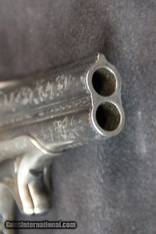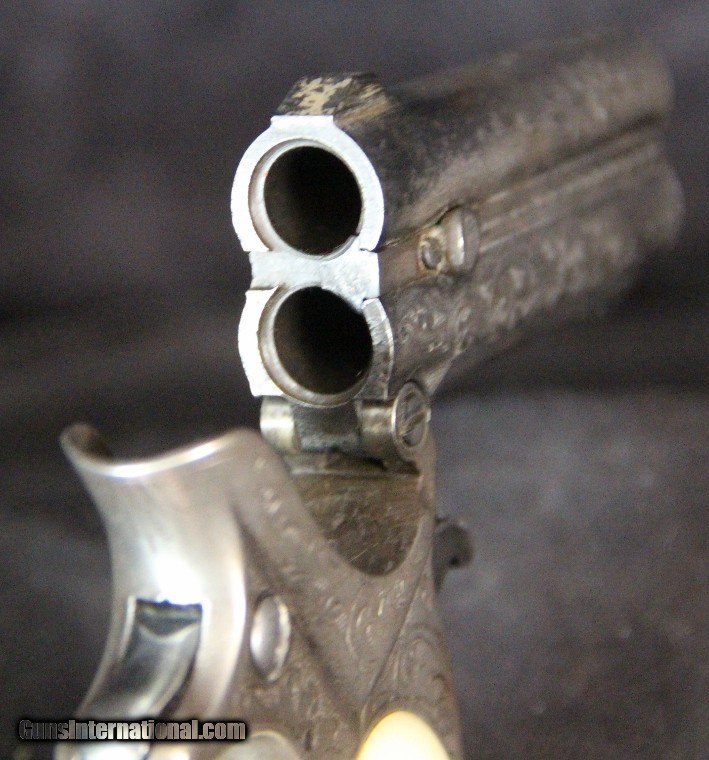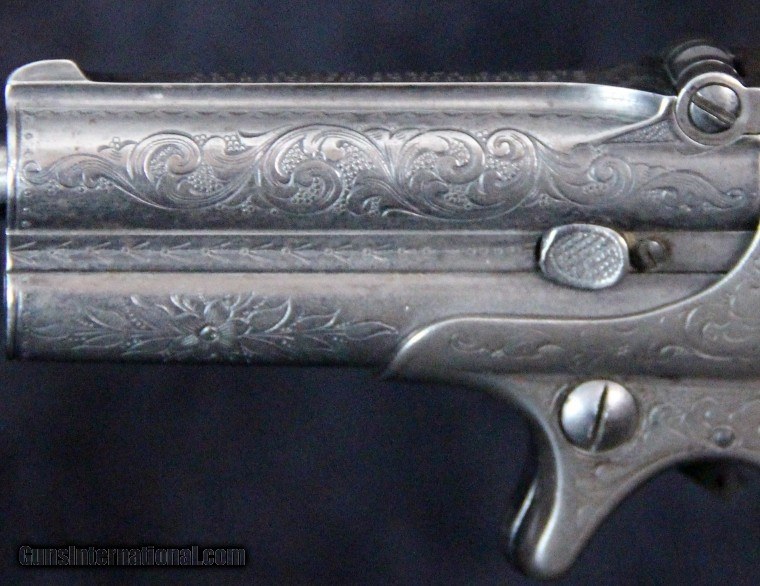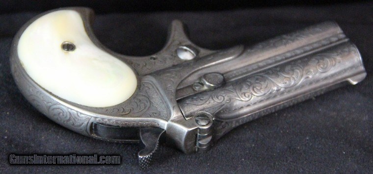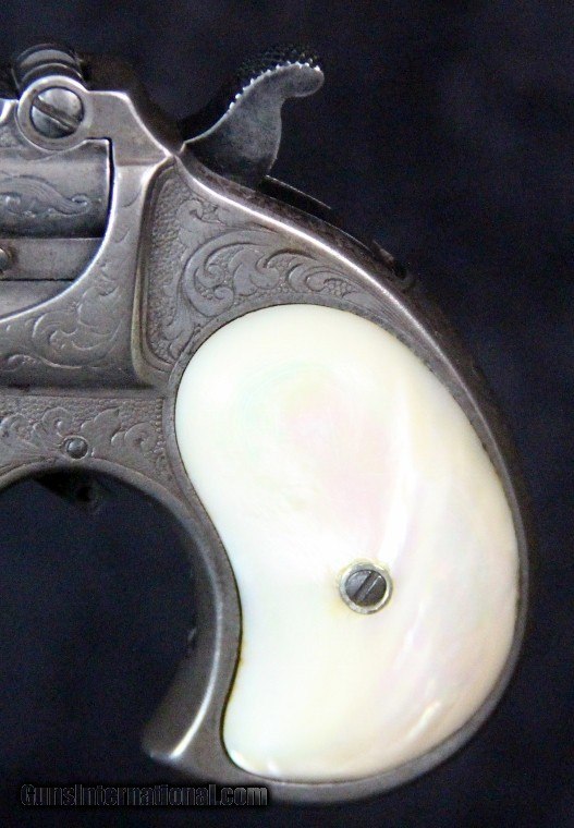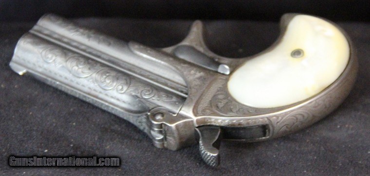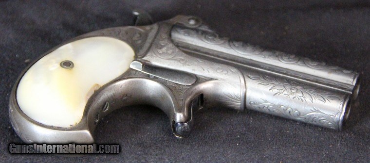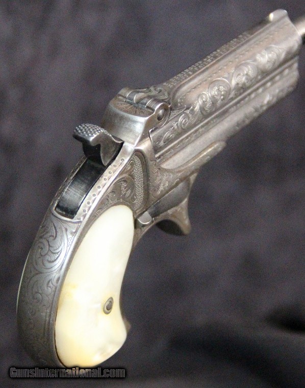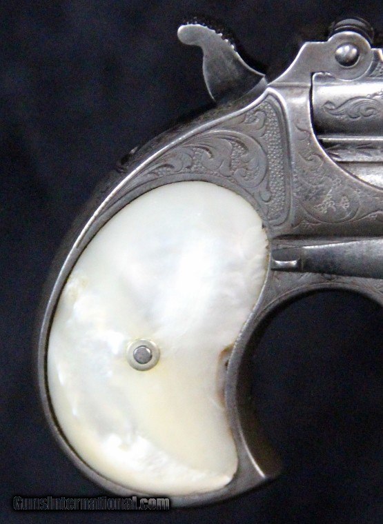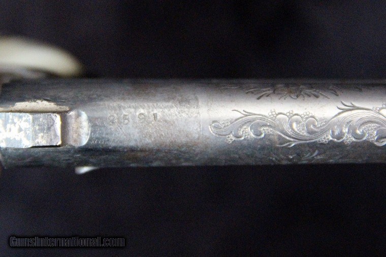 Description: .41rf, short, #2691, 3 inch barrels, nickel finish, New York style engraving, 2 piece pearl grips, 2 line barrel address, 1870's. Condition: very good strong rifling, smooth gray gun metal patina overall, excellent grips, excellent mechanically, excellent marks. Antique: Yes Price: $2,750.00 Contact Seller |