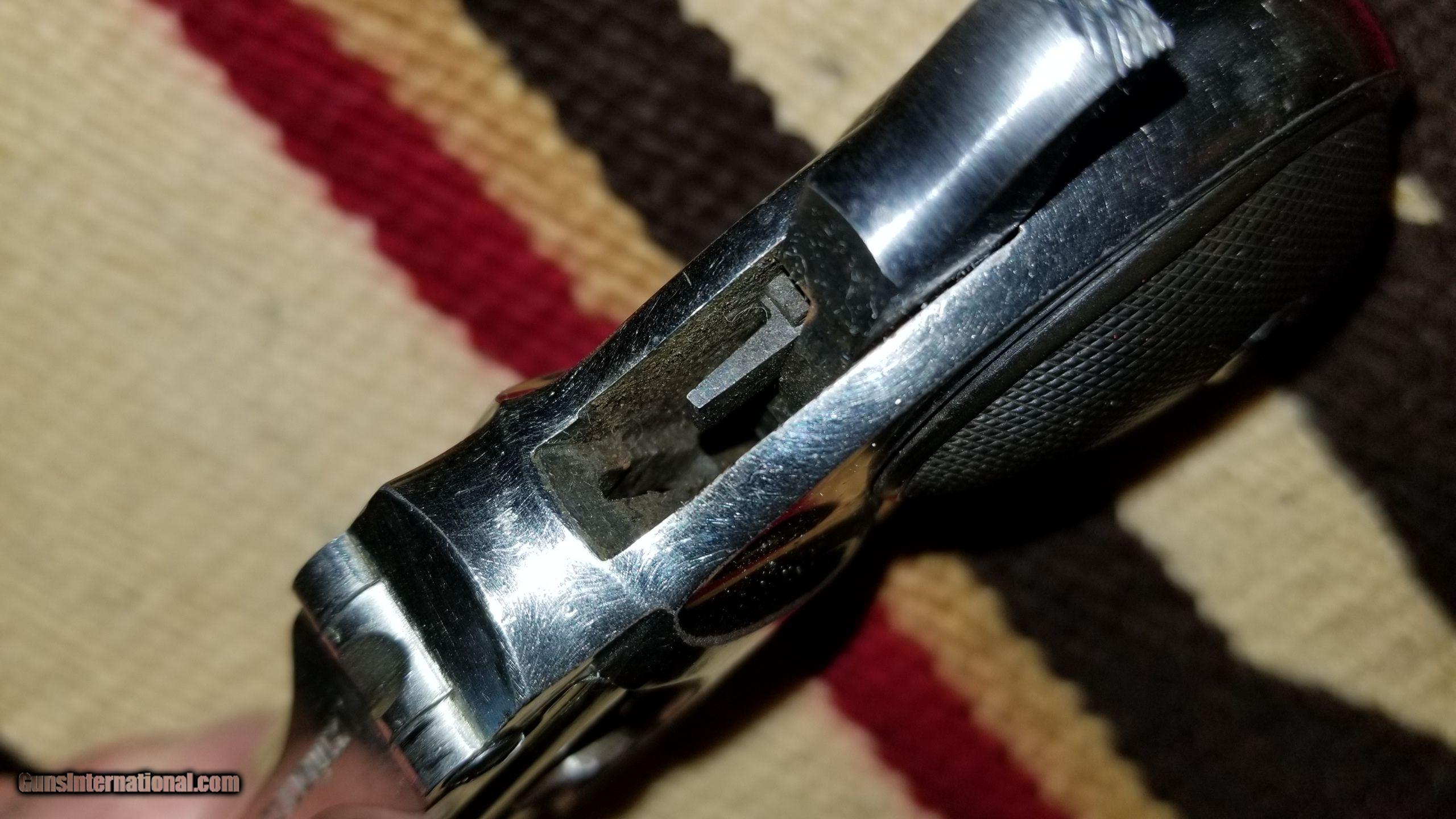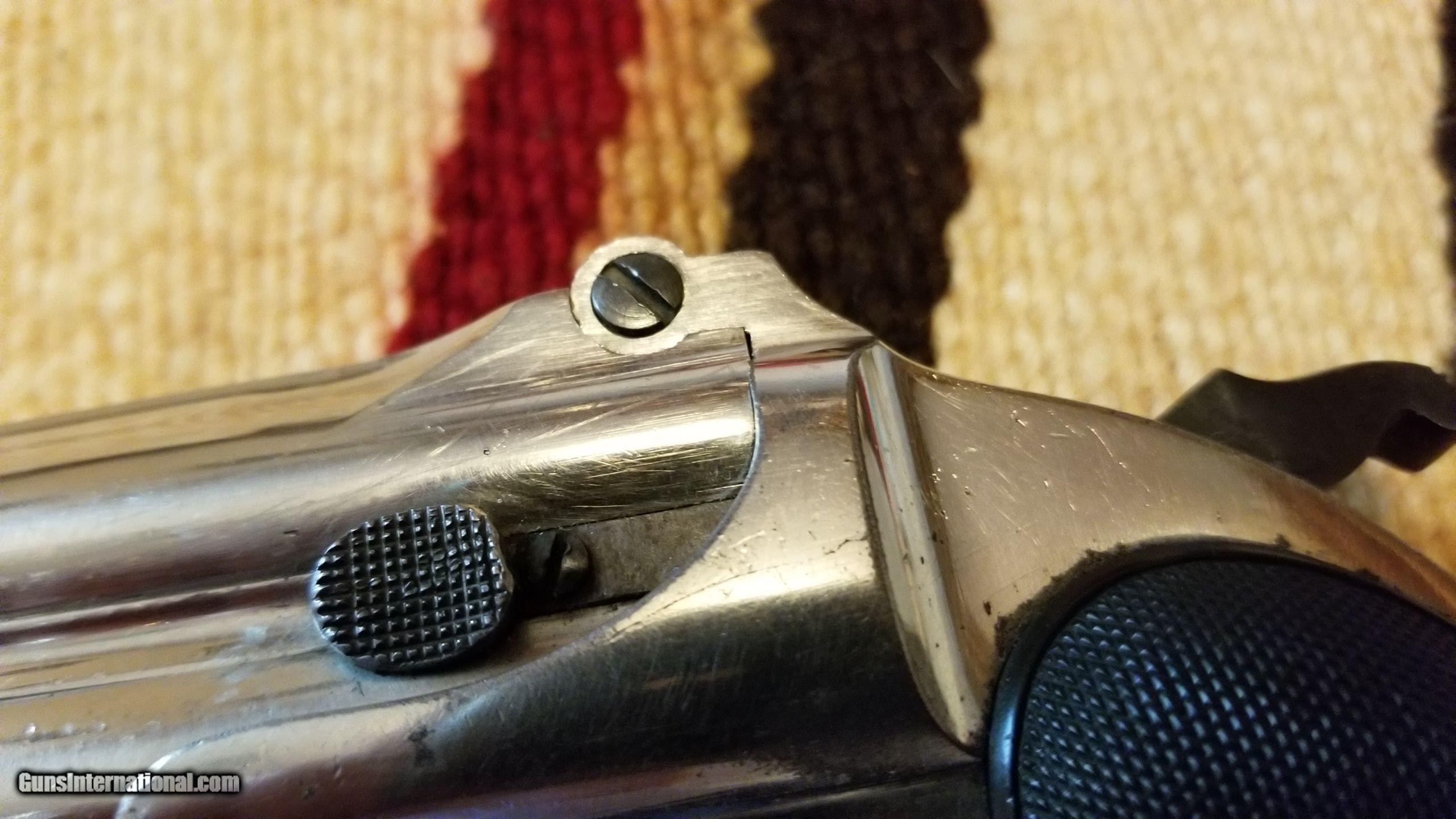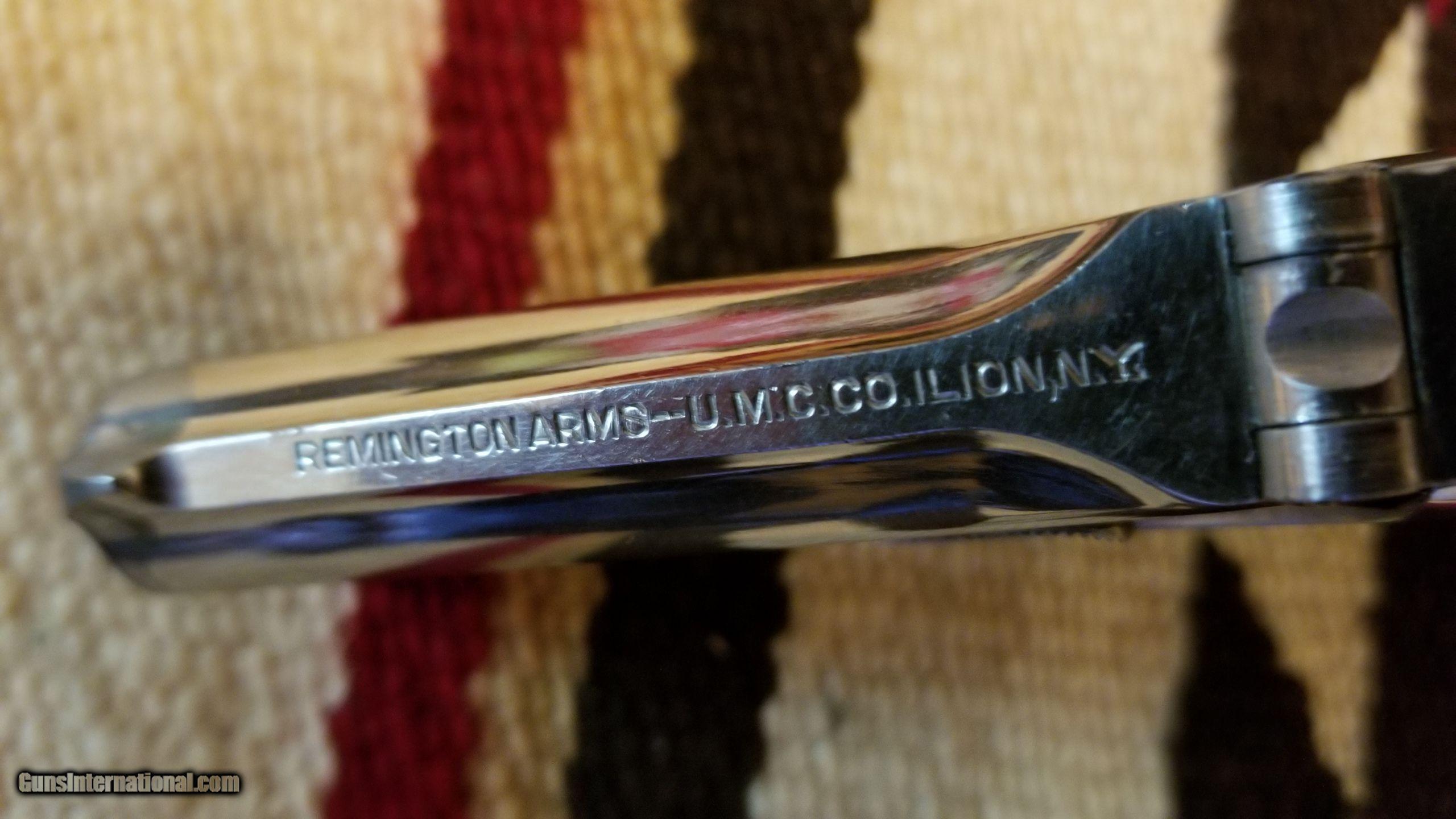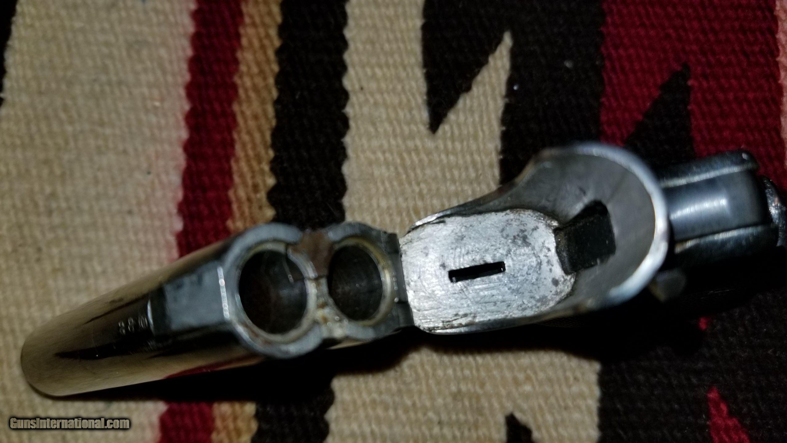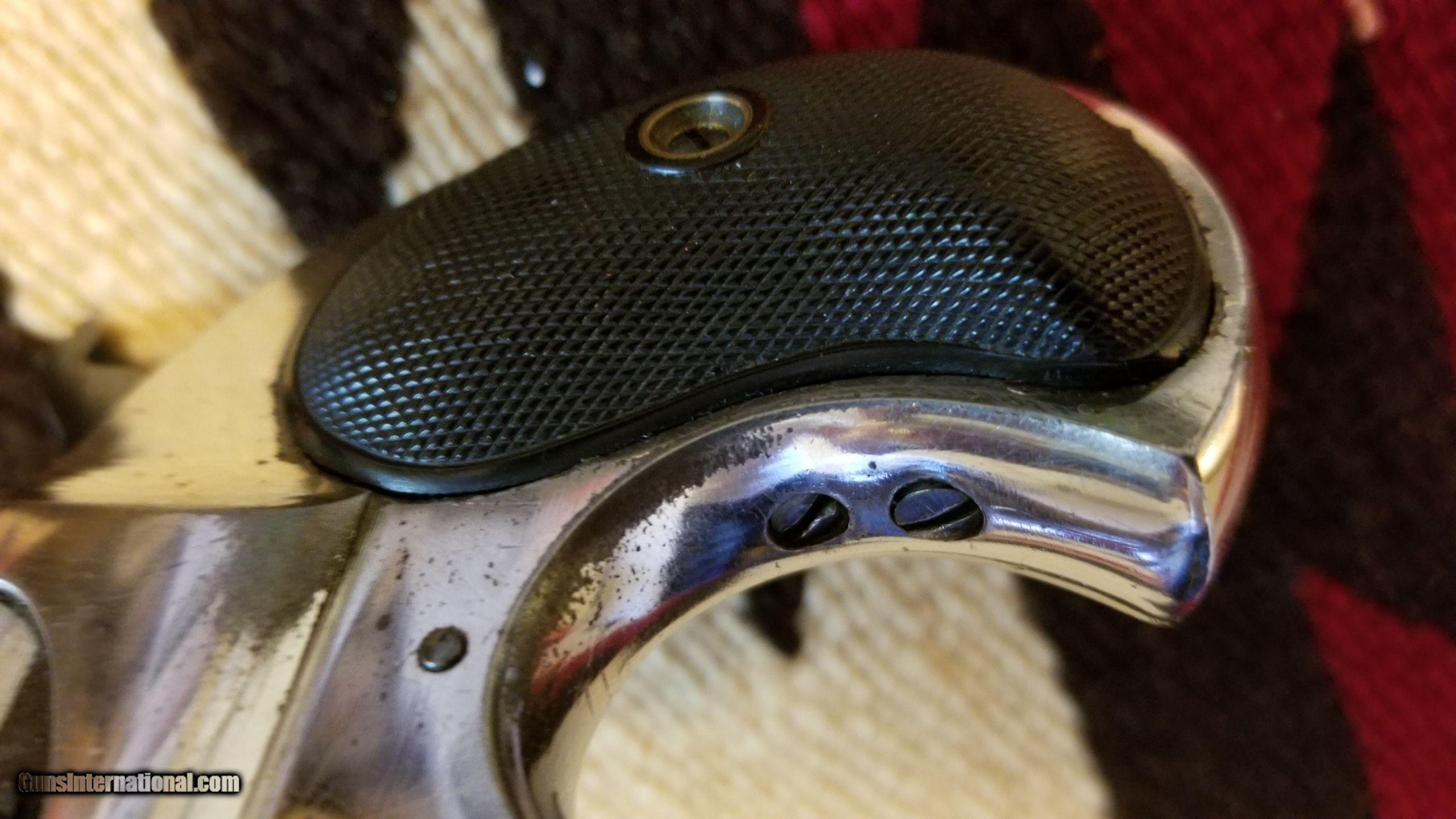 Description: Up for sale is a Remington-UMC 4th Model First Issue over under .41RF Derringer in scarce Nickel finish in fine condition. Nickel is 90% with some loss at the end of the barrels and in front of the trigger. Action is excellent, bores are Very Good. Grips are fine with a small chip out of the front of the right grip. Much blue on screws, takedown lever, hammer, and trigger. Hinges solid. Nice example of scarce pistol. Money orders preferred, shipping USPS Priority insured. FFL/C&R required on this late one. Thanks for looking. Check my feedback on under "paladin47" and Ebay under "Shadrack". SOLD Curio/Relic: Yes |