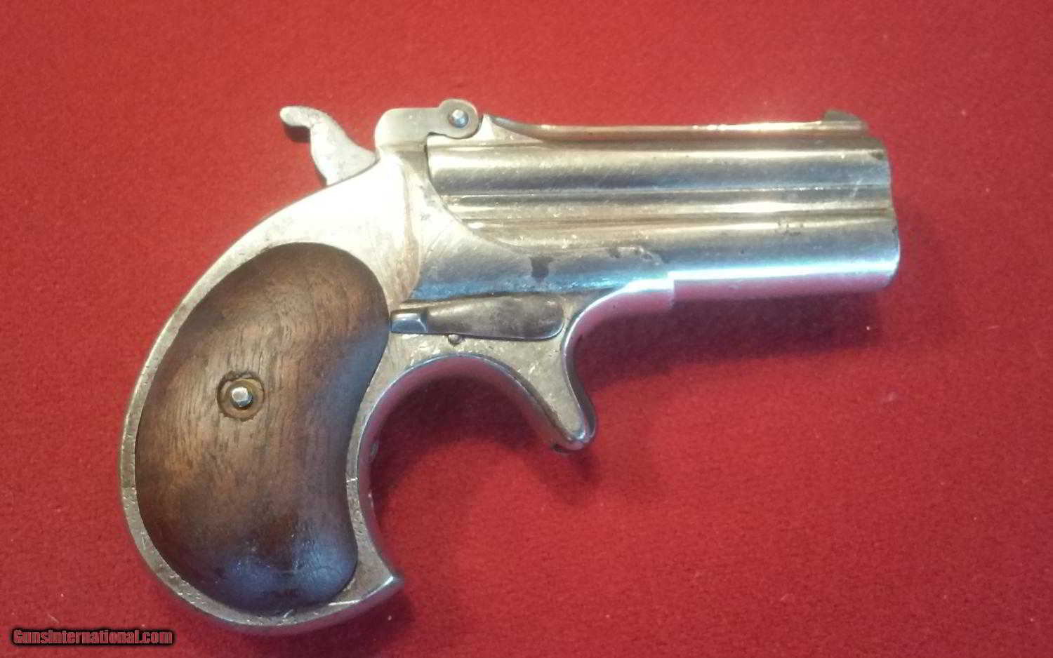 Description: Shows an old re-nickel. Hinge has been repaired. Action is crisp. Bores are fair to poor. Nice original wooden grips. Partial address. You can make out REMINGTON and Y at the end. SOLD Antique: Yes Manufacturer: Remington Model: Over/Under Derringer Serial Number: non visible Caliber Info: .41 |