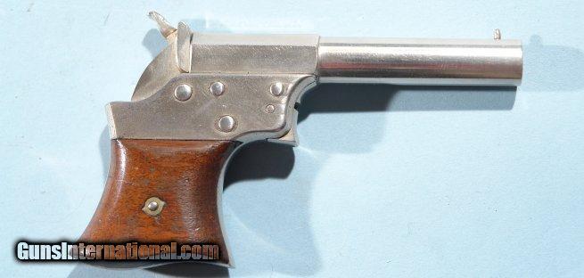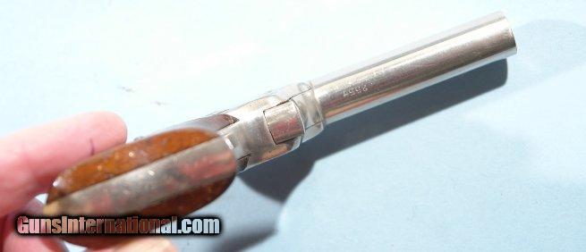 Description: REMINGTON SAW HANDLE VEST POCKET .41 RF CAL. DERRINGER CA. LATE 1860’S. 4” barrel crisply addressed “REMINGTON’S. ILION. N.Y./PAT OCT. 1. 1861 NOV. 15. 1864” Original example with all the original parts and excellent screws. 95% nickel finish and excellent walnut grips with the original finish. Excellent working order and fine bore. Superior example. SOLD Antique: Yes |
