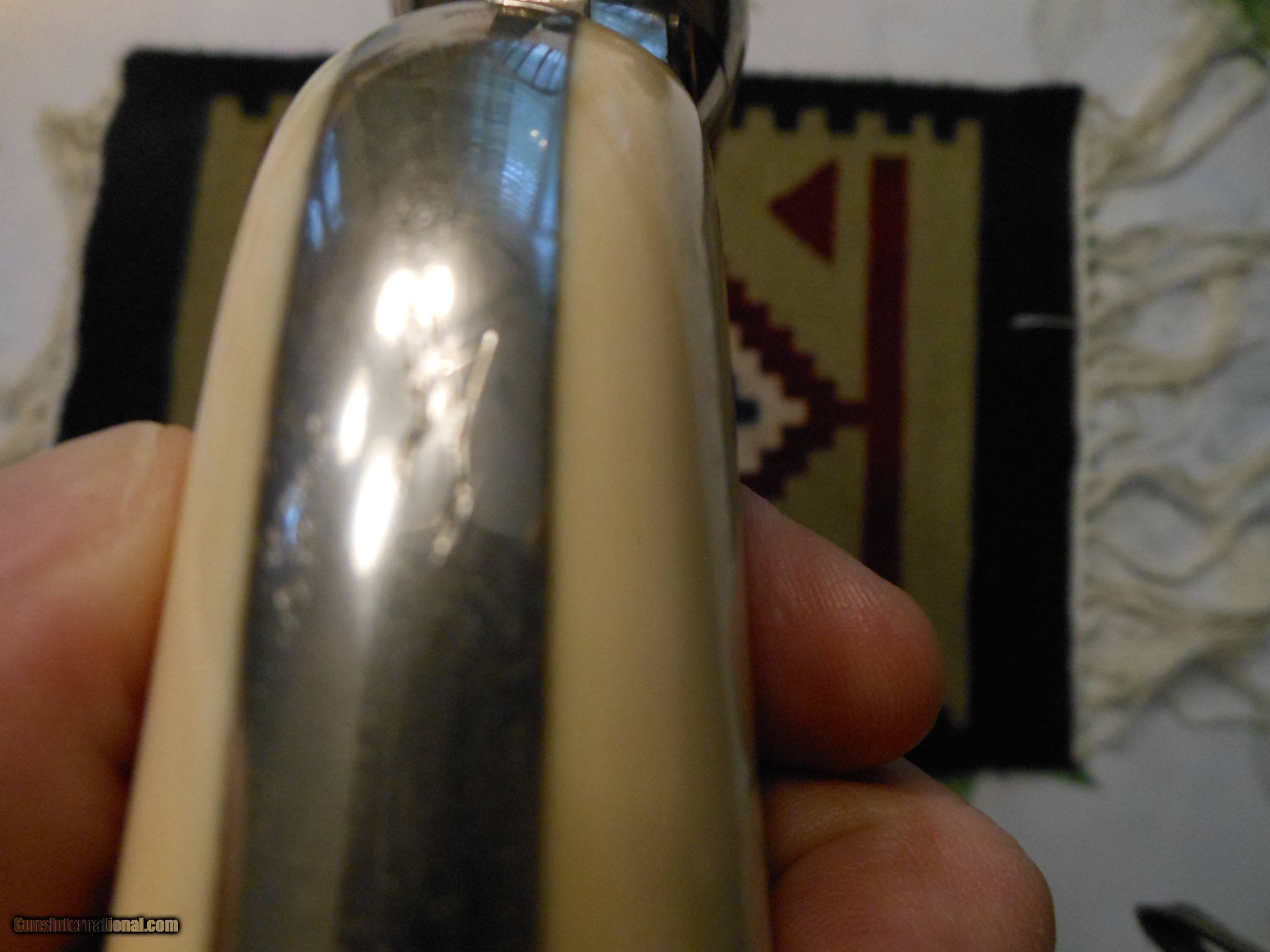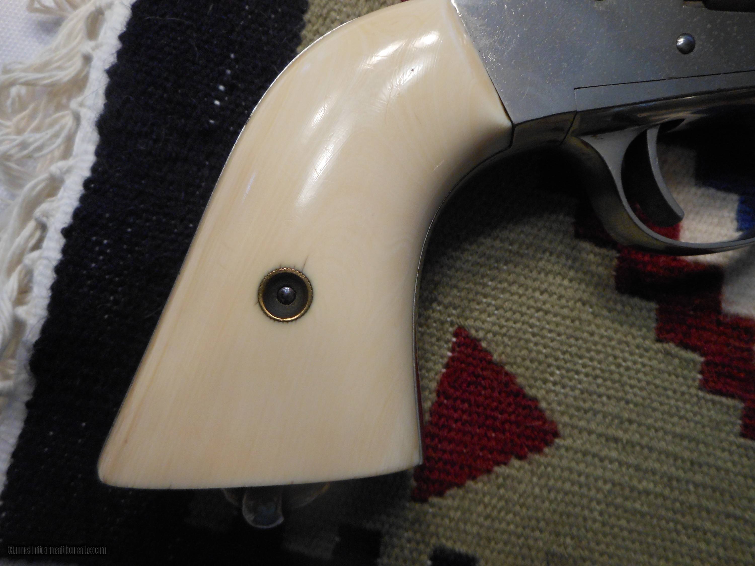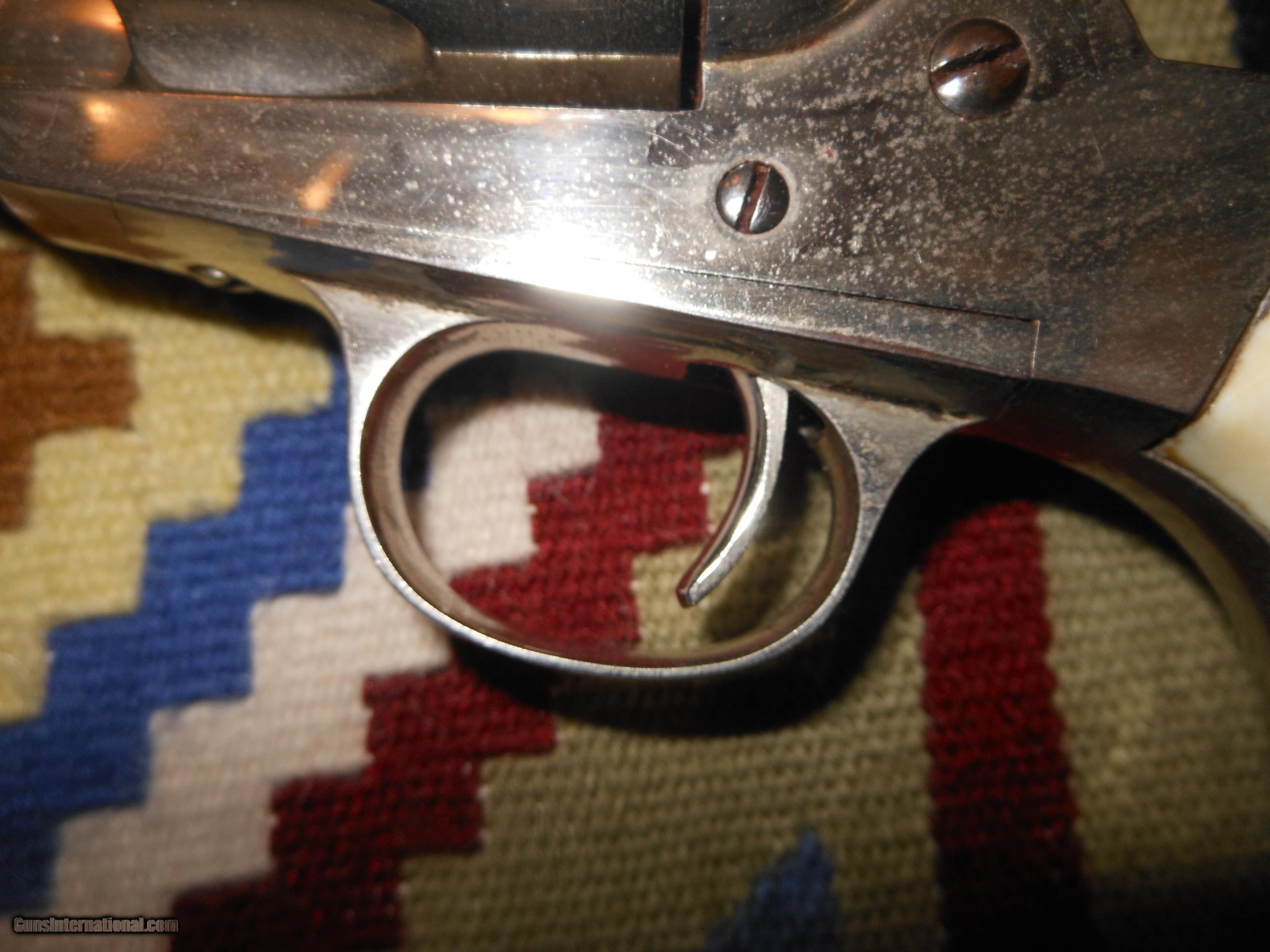 Description: I'm sorry but I don't know a thing about these. I'm selling this for a friends widow. I have never owned anthing like this. I was told it is all original. there is a ding on the back strap like it's been dropped. The grips are antique ivory. Thanks to Frank, I found the serial number ... number 26. It must be a very early gun. Please ask questions. It is chambered in 44 Remington Center Fire. No FFL required. Buyer pays insurance and I'll pay shipping. SOLD Antique: Yes Manufacturer: Remington Model: 1975 Chambers: 44 Remington Center Fire |