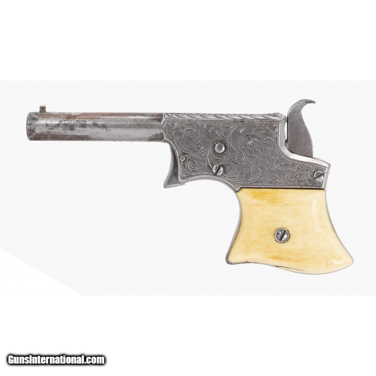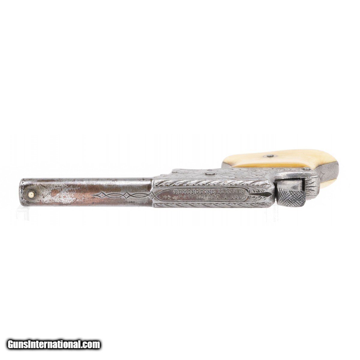 Description: " The Remington Vest Pocket (called the No. 1 by Remington) was made from circa 1865 to 1888. Also known as the ""Saw Handle Deringer"", this gun is the early type in which the hammer doubles as the breechblock. The 3.25"" octagon to round barrel is integral to the frame. It has a fair bore with roughness but with visible rifling. The top of the breech is marked ""REMINGTON,S. ILION. N."" (the Y is not present) over ""PATENT OCT. 1. 1861"". The original ivory grips are fine with a couple of age cracks on the bottom. The metal was silver plated. Traces remain on the barrel and top of the frame. The action functions correctly. The frame sides and top are factory engraved in scroll pattern. The bottom grip strap is engraved ""Chas. E. Forbes"". An internet search reveals that Charles Edward Forbes (1795 - 1881) was a lawyer, judge, and philanthropist in Northhampton, MA. A one pate write-up on and picture of Forbes is included with the gun. If you collect Remington pistols or historic guns, this one is for you! SOLD Antique: Yes |