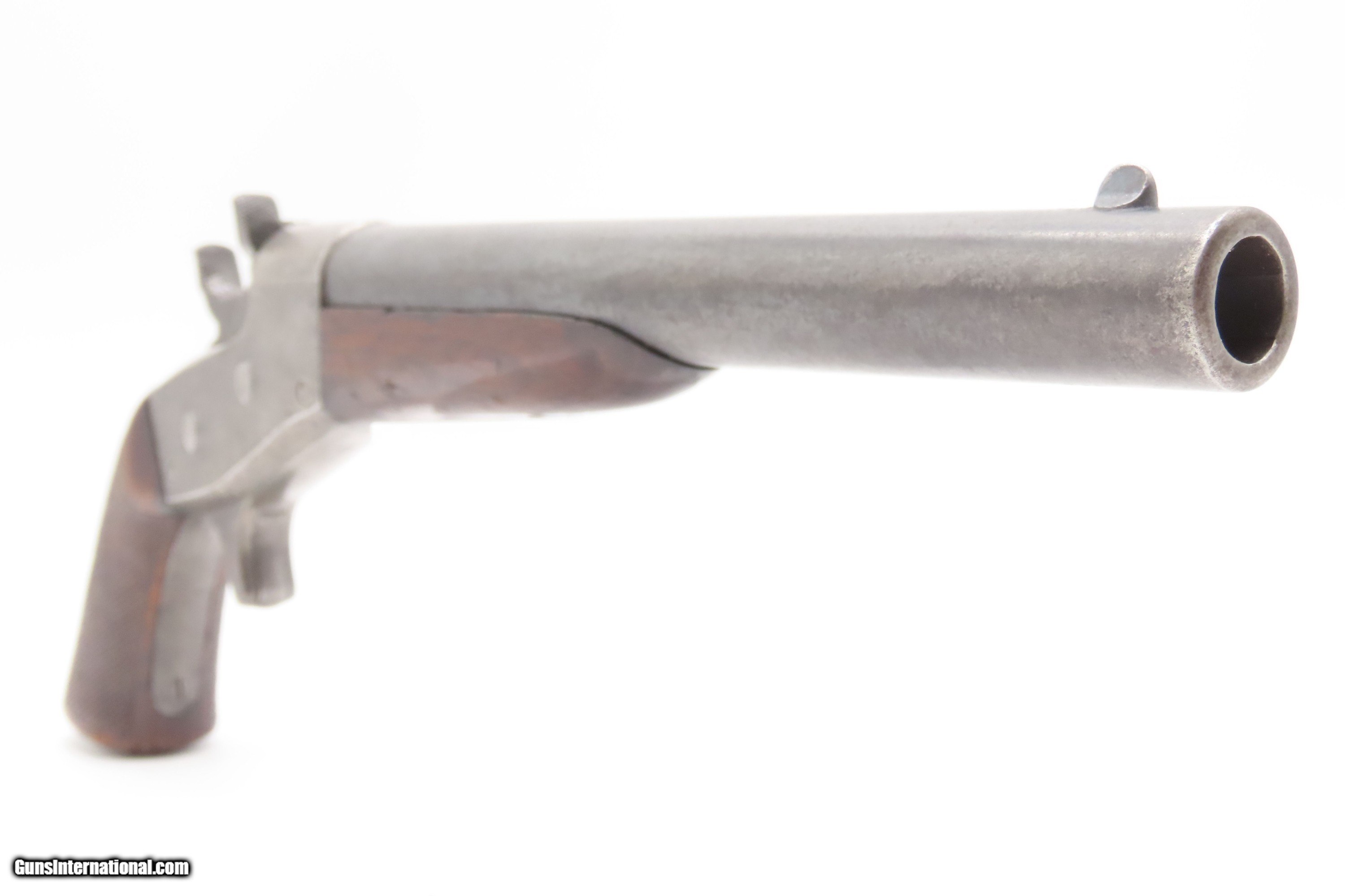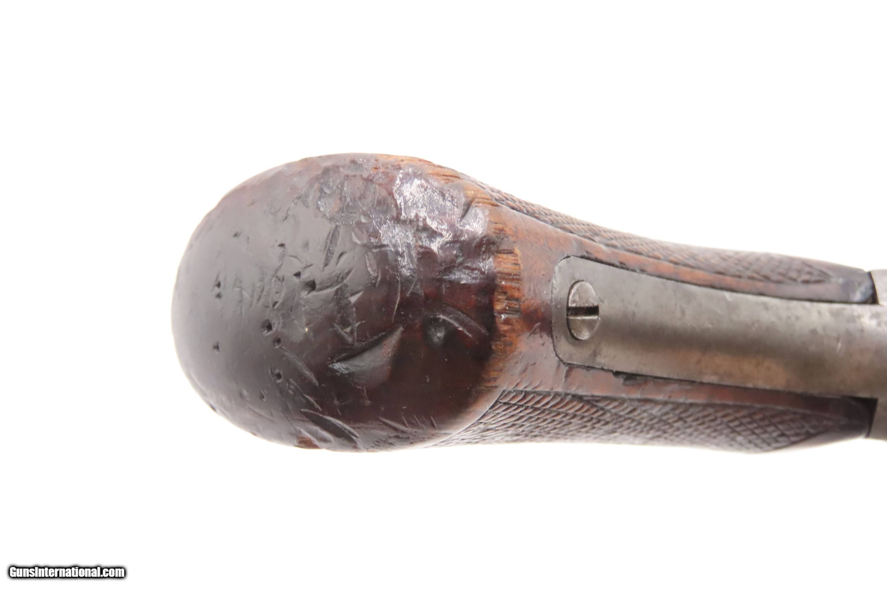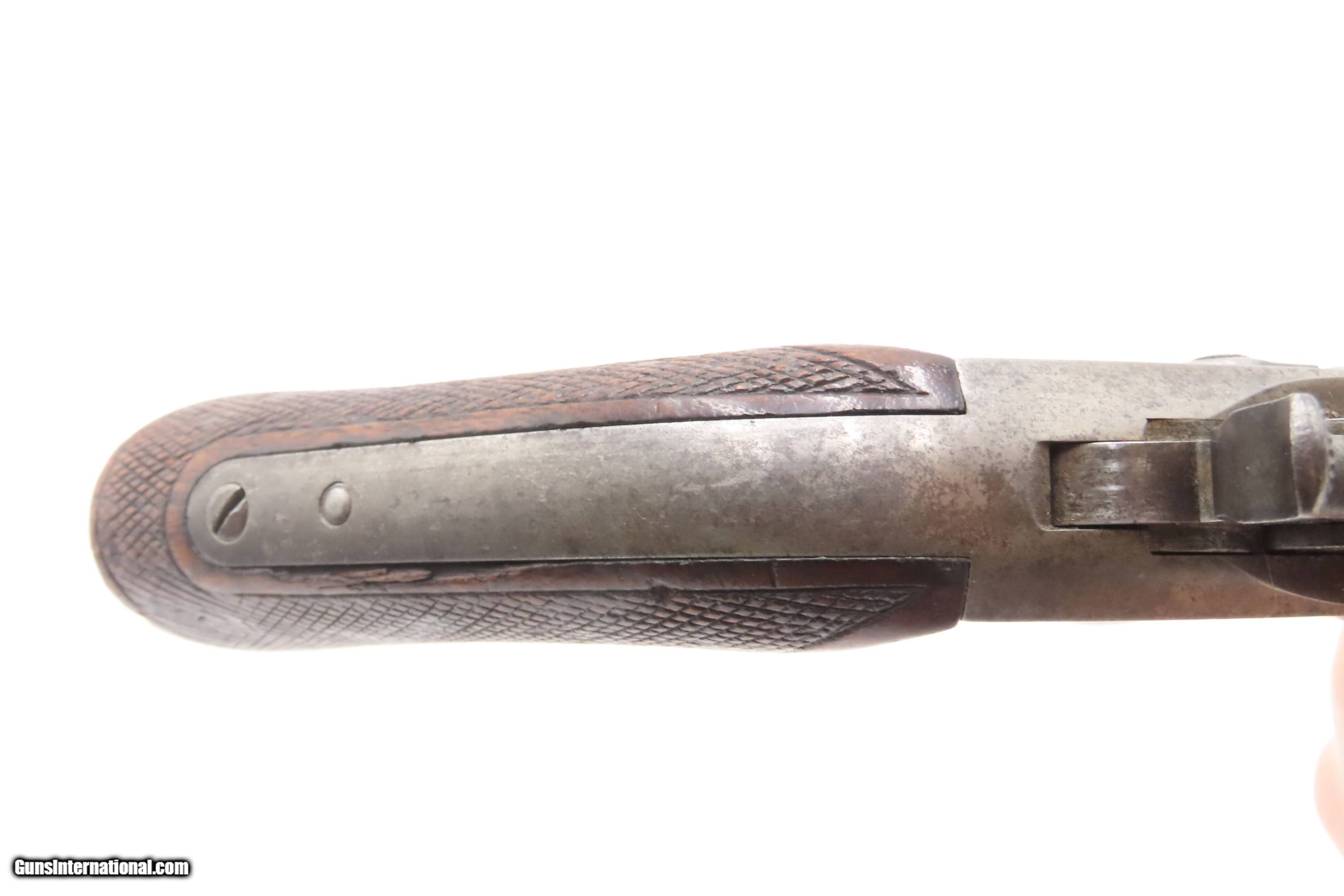 Description: Antique Commercial REMINGTON M1865 NAVY Rolling Block ANCHOR MARKED Pistol VERY SCARCE! 1 of 500 Manufactured 1866-1870 Here Ancestry Guns presents a Scarce Antique Remington Commercial Model of 1865 Navy Frame Rolling Block Pistol made in Ilion, New York circa 1866 to 1870. This pistol is essentially the civilian version of the Navy Model of 1865/1866, making it extremely rare. It is estimated by Jerry Landskrom in "Remington Rolling Block Pistols" that less than 500 of these commercial versions of the Navy pistols were made. The top of the barrel is marked with the Navy anchor but bears no other inspection marks, typical of the commercial models. The rolling block design was an evolution of the split breech carbine design of Leonard Geiger. Geiger’s intent was to design an arm using a metallic cartridge that could be cheaply and easily manufactured for use during the American Civil War. Remington manufactured about 20,000 split breech carbines in three different rimfire calibers, but most were delivered too late to be used in the war. These pistols were a strange selection for a martial pistol given the prevalence of revolvers by this time and the obvious drawbacks of single shot weapons. Nonetheless, they are powerful sidearms and are incredibly reliable, just like the Remington rolling block rifles. These had a sturdy, simple action that was relatively inexpensive and was just the ticket for shipboard weapons for the U.S. Navy, along with commercial sale, as is this example. Although Remington continues to make rolling block long guns even to this day, these rolling block pistols were made only up to about 1872, since by 1873 both Colt and Remington were free to make cartridge revolvers and the single shot pistol was abandoned as a military weapon. The overall condition is very good. Much original blue barrel finish is present. Strong action. The bore is bright with strong rifling. Light edge chipping around the forend, but overall good. The grip is nicely checkered and contains an average amount of handling wear. Markings are legible. “anchor” marked barrel. Own the original! This is a legitimate antique and not a reproduction. Barrel is 8-1/2 inches. Caliber: .50 Rimfire Overall condition as seen in photos. Very Fast. Very Safe. FREE SHIPPING WORLDWIDE. Delivered directly to your door by express mail! Guaranteed AUTHENTIC & Includes CERTIFICATE OF AUTHENTICITY. $2900 #259326 Antique: Yes Price: $2,900.00 Buy Now Pay with