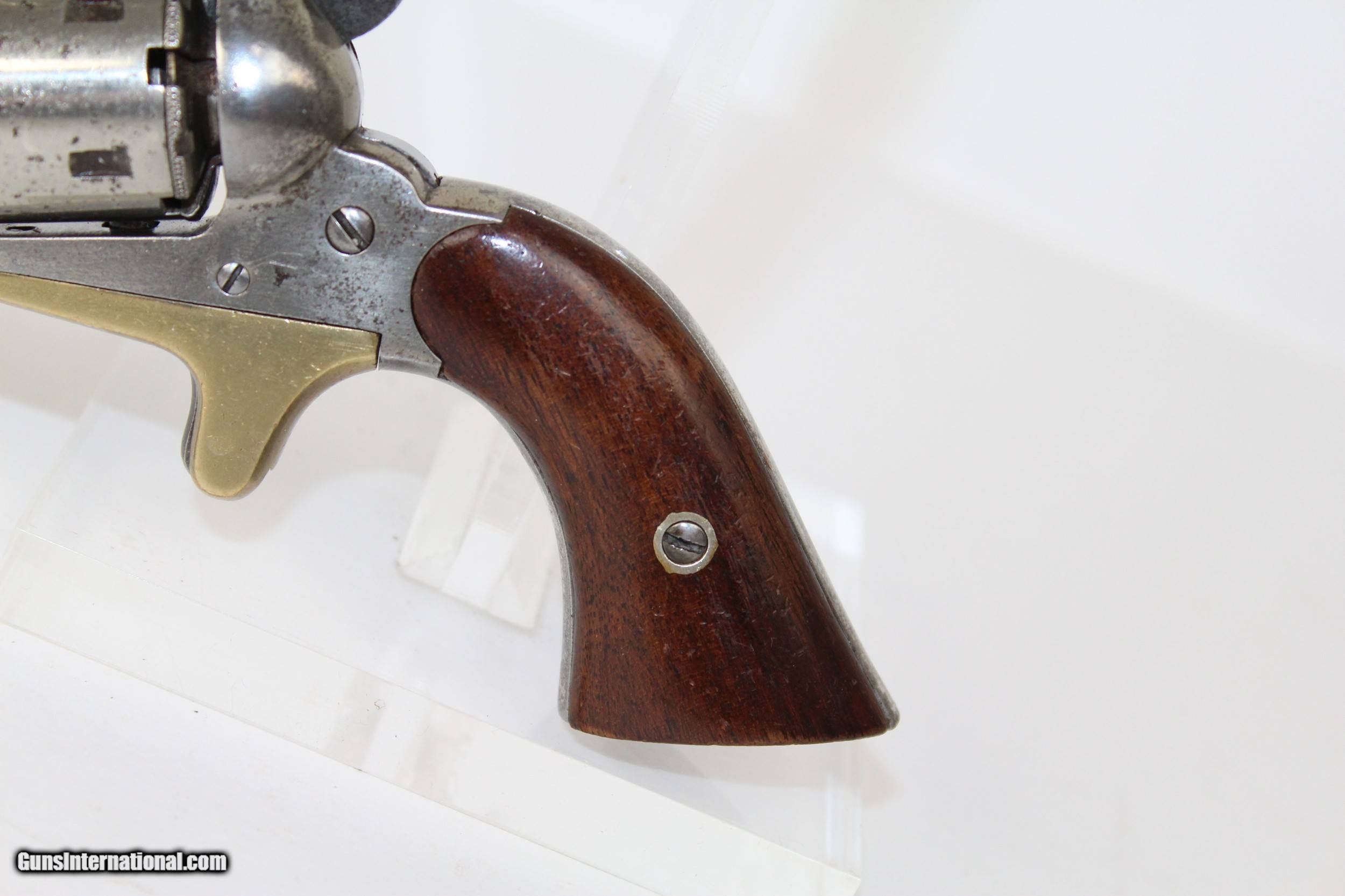 Description: CASED Antique REMINGTON New Model Revolver in BOTH .32 Rimfire & Percussion A Very Nice Set for Display! Here we present an antique Remington New Model Pocket Percussion Revolver, made circa 1873 in Ilion, New York. This revolver was designed for defensive carry and would have been equally at home in a holster, pocket or purse. These revolvers were made during a period when Smith & Wesson owned the Rollin White Patent, which turned out to be the best way to incorporate use of metallic cartridges in revolvers. Companies like Remington and Colt were relegated to continue production of revolvers with the percussion firing system until the patent expired in 1869. Once this happened, companies lost no time fitting their percussion models with various cartridge conversions or incorporating this new technology at the factory. This example of the New Model Pocket Revolver demonstrates this transition well. Here we have a Pocket Revolver that features the “Improved” technology of a cartridge cylinder, though many were sold with both a cartridge and a percussion cylinder for the same gun. This cased set has both, though the percussion cylinder comes from a reproduction revolver. This revolver is original and in great shape. The top of the barrel is marked “PATENTED SEPT.14.1858 MARCH 17.1863/E. REMINGTON & SONS ILION, NEW YORK U.S.A.” Estimates are that about 25,000 of these revolvers were made altogether, so this serial number places this piece near the very end of production. The green cloth lined walnut case is very nice and includes a later percussion cylinder, powder flask, caps, balls, a bullet mold, and an empty box of cartridges. The box also includes the key with which to lock it up. This would make a great display or ornament for your desk! The overall condition is near fine. 95% of the original nickel finish remains with a bit of speckling. The markings are clear and legible. The walnut grips are in great shape. The bore is clear and bright with good rifling. The action on this revolver is excellent. Own the original! This is a legitimate antique and not a reproduction. Barrel is 3-1/2 inches. Caliber: .32 Rimfire & Percussion Overall condition as seen in photos. Very Fast. Very Safe. FREE SHIPPING WORLDWIDE. Delivered directly to your door by express mail! Guaranteed AUTHENTIC & Includes CERTIFICATE OF AUTHENTICITY. ancestryguns $2150 #7018 SOLD Antique: Yes |