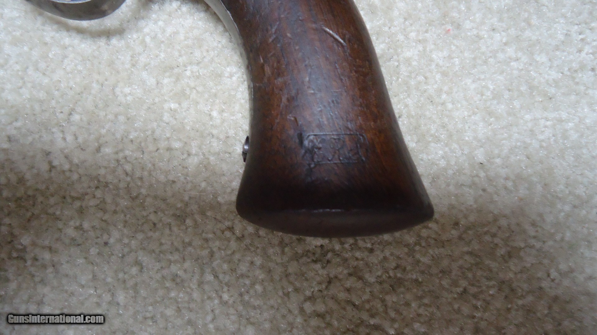 Description: EXCELLENT AND RARE REMINGTON U.S. ARMY ISSUED MODEL 1871 .50 CALIBER CENTER FIRE ROLLING BLOCK PISTOL. Approximately 6,000 of these handsome pistols were made in the 1870s with 1,000 sold on the civilian market and 5,000 issued the U.S. Government. This is one of the latter and shows a fine “CRS” in a rectangle cartouche on the left bottom grip- these almost always worn away. This example shows vivid case colors on the left side of the frame with the right side case colors still very apparent but faded darker, there is bright case color on the protected areas around the hammer, upper sides of the frame/trigger guard etc. Even the grip straps show some fading case color. Fine walnut grips without the usual dings on the butt that most seem to have from using it as a tack hammer! (Almost all of these I’ve seen have this). There is a number “53” stamped in the upper left grip side which was probably a rack or unit number. Excellent screws, MINT BORE, tight action, the hammer and breech block were finished “bright and in the white” and this example still retains the bright look with minimal spotting or staining. Exc. markings including the P and S inspector stamps on the side of the frame along with the Remington markings. These historical arms are quite scarce and this is one of the better ones I’ve seen in a long time. SOLD Antique: Yes Manufacturer: REMINGTON Model: 1871 ROLLING BLOCK U.S. ARMY PISTOL Caliber Info: .50 C.F. Condition: FINE+ Barrels: 8 |