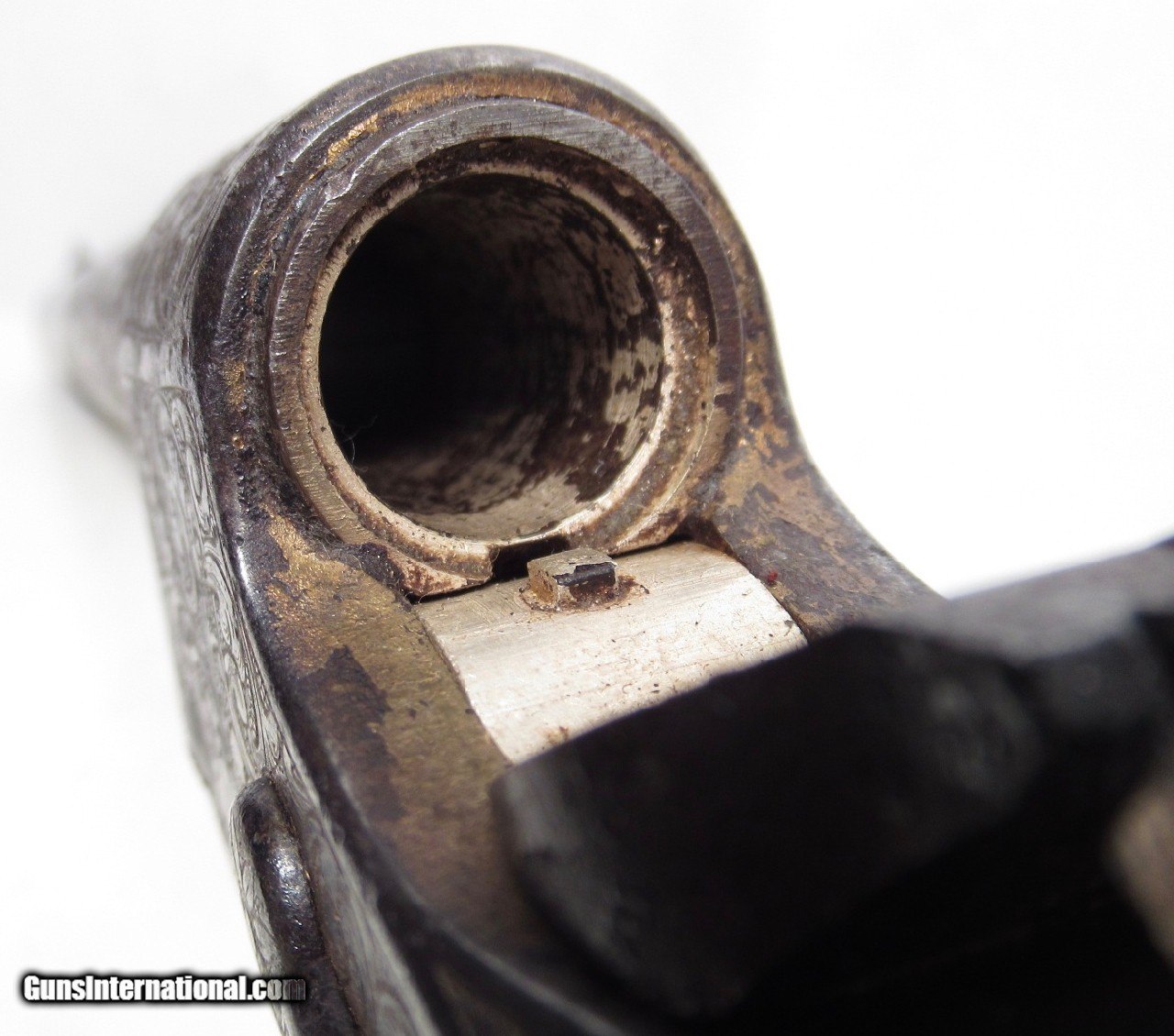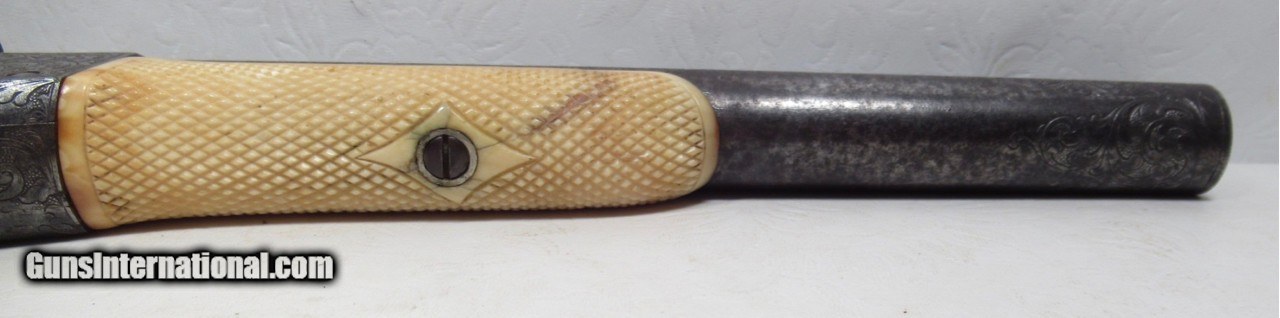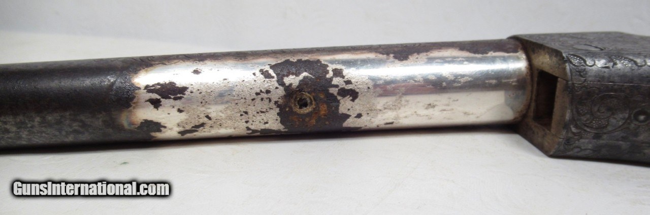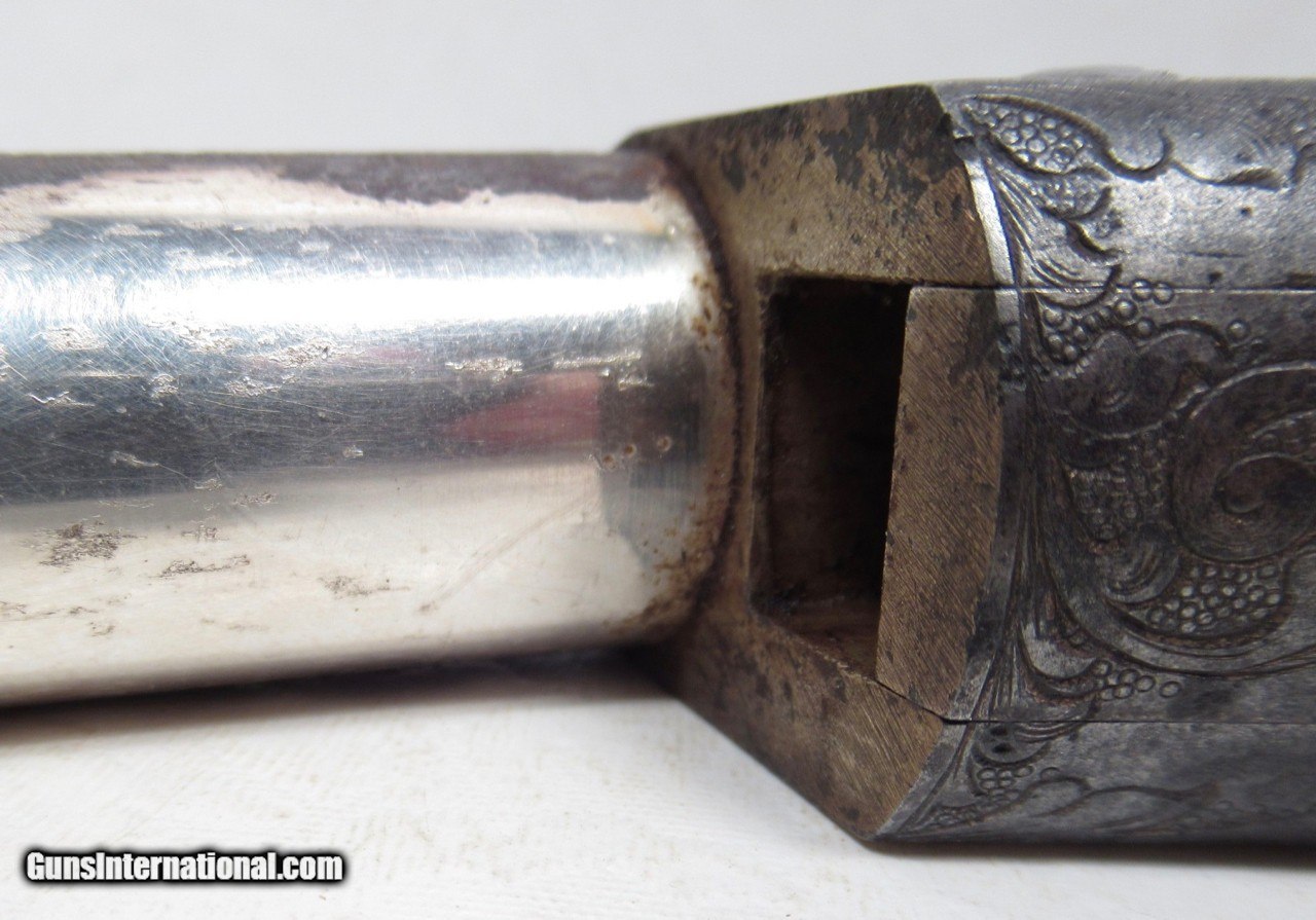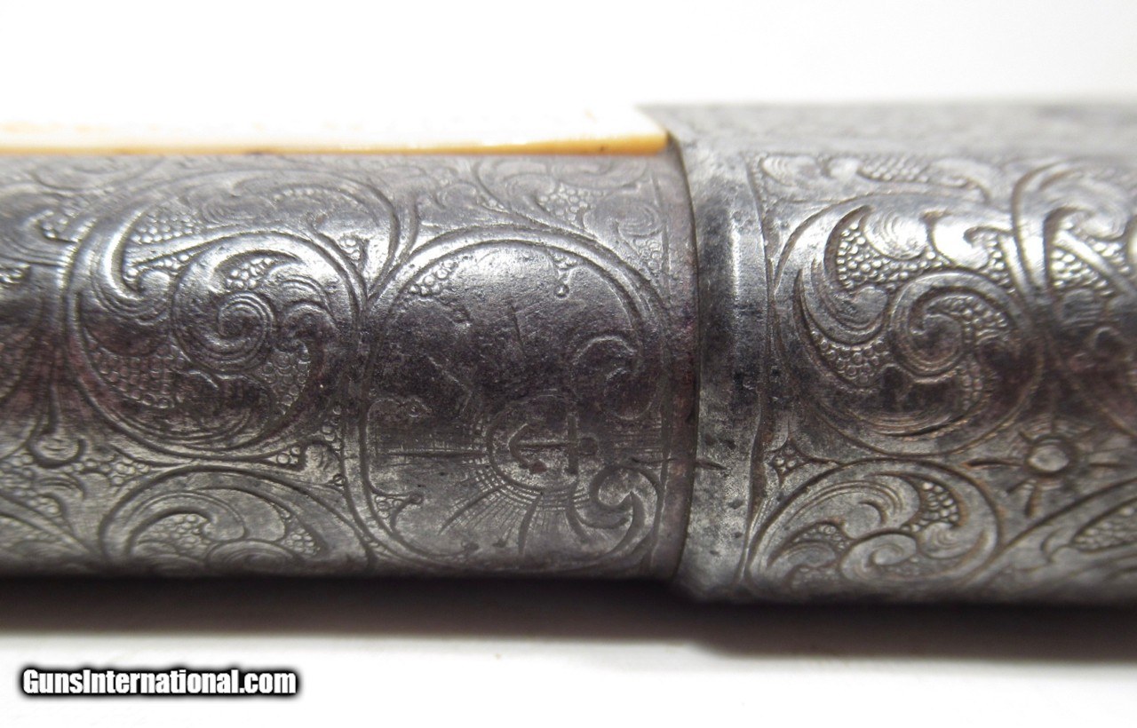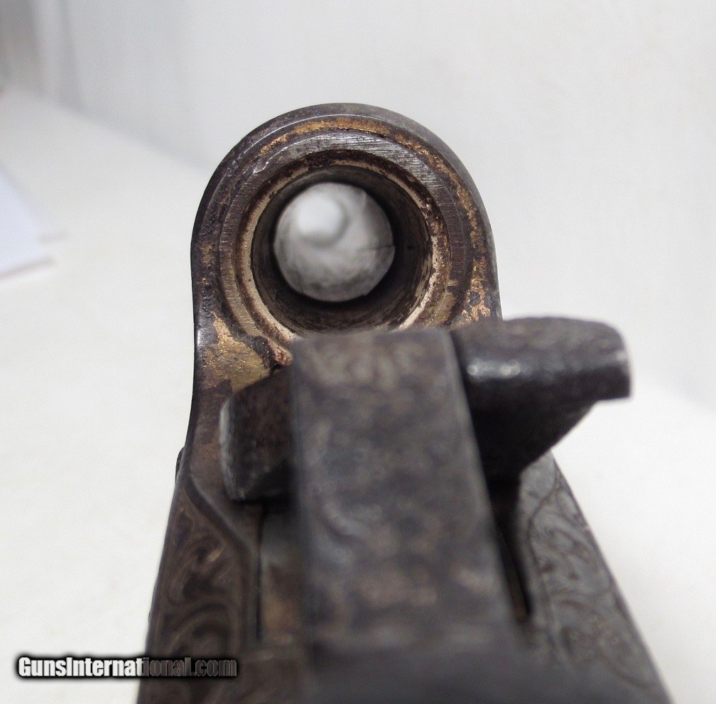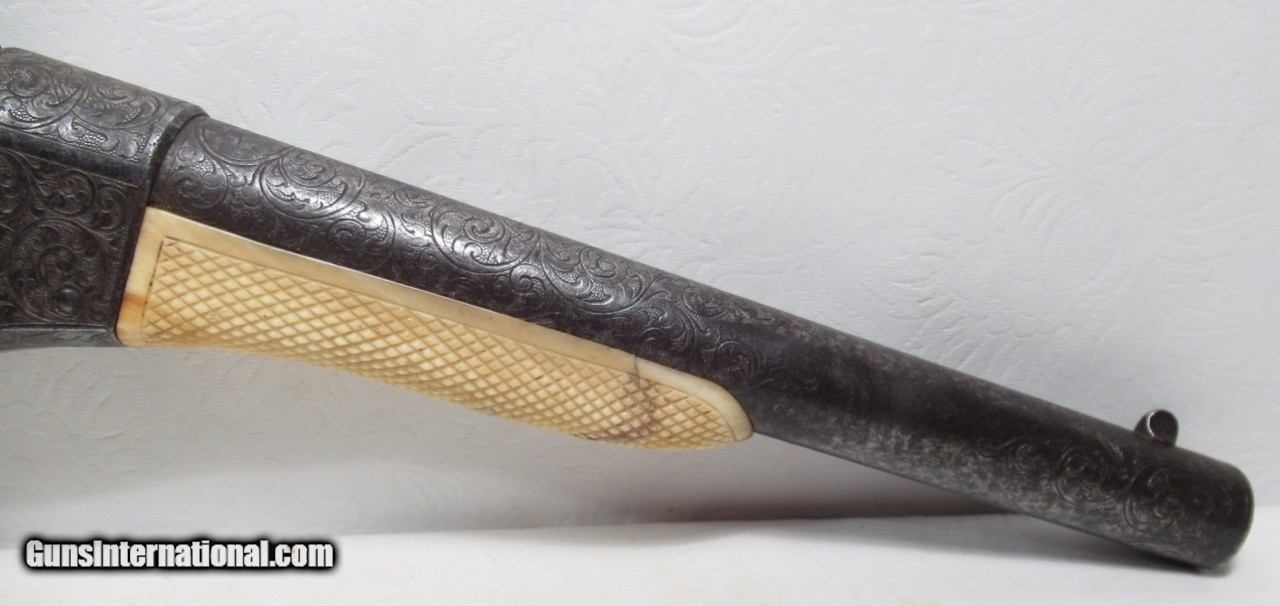 Description: Remington 1866 Rolling Block; Serial No. 3; .50 Caliber Center Fire; 8 ½” Barrel; Very Rare Gold and Tin Plated, Deluxe Scroll Engraved, Commercial Model; The Checkered Ivory Grips are Factory Original; The Pistol is Numbered “3” within the grip strap area, and the barrel has three punch marks under the forend piece; the left side of the frame is Clearly Maker Marked with Patent Dates of 1864 and 1866; there is a Naval Style Anchor Stamped at the top of the barrel, just in front of the frame at the breech end of the barrel; it is believed the production of the 1866 Commercial Model was Less that 500 of the Standard Model, with Only a Very Few Examples Engraved with Ivory Stocks; the stocks weigh less than the allowed limit for antique gun parts; Note: Flayderman Designates this Pistol as an 1865 Model, but Later Research has it as an 1866 Model; All Iron parts show a dark gray-blue color with some areas of plating still remains; stocks have a very nice Mellow Yellow to Gold Color with one stress crack in the forend, extending forward from the attaching screw; Bore is Bright with some staining; Action is Crisp; See All Photos for Condition; No Texts; Call (254)541-5765 or Email Only; PERSONAL PROPERTY of Harold Wieser; Price: $9,975 + $45 S&H Via USPS PRIORITY MAIL; Payment Address: Harold Wieser - 1466 U.S. Hwy 77 - Rosebud, TX 76570; SEND PAYMENTS VIA USPS PRIORITY MAIL; BEWARE of SCAMS!!! – DO NOT SEND MONEY or CORRESPONDENTS ELECTRONICALLY UNLESS YOU HAVE SPOKEN to HAROLD WIESER FIRST! 254-541-5765 SOLD Antique: Yes Manufacturer: Remington Model: 1866 Rolling Block Serial Number: 3 |