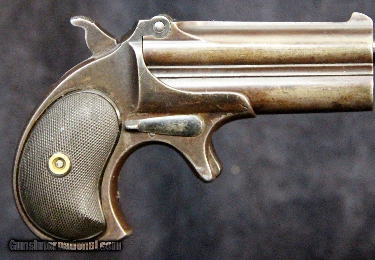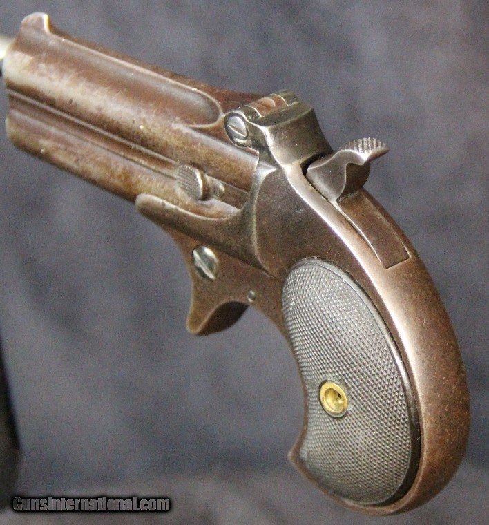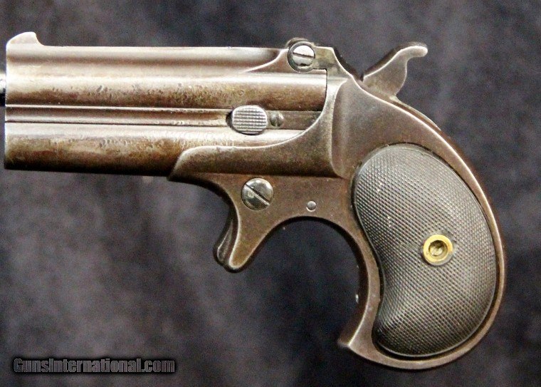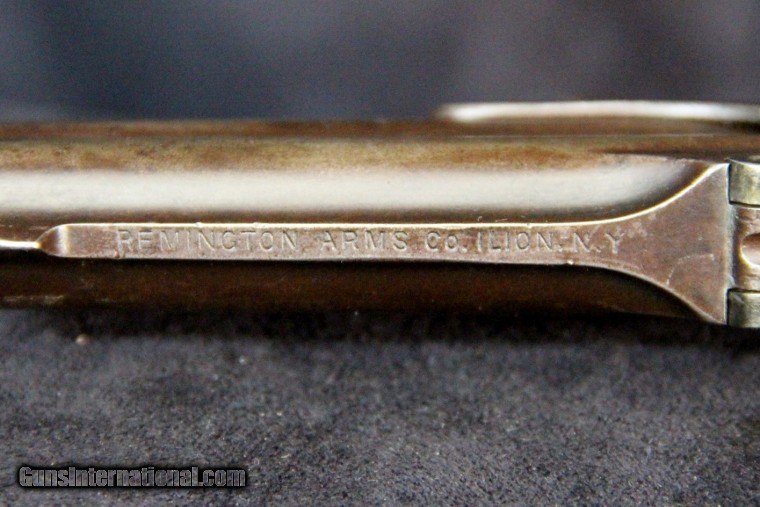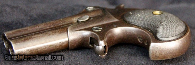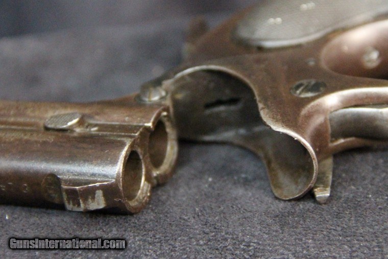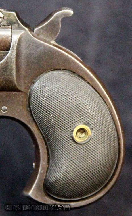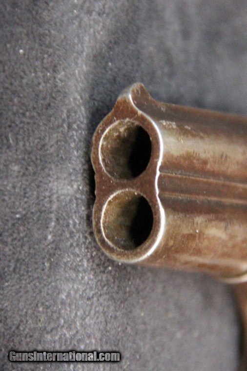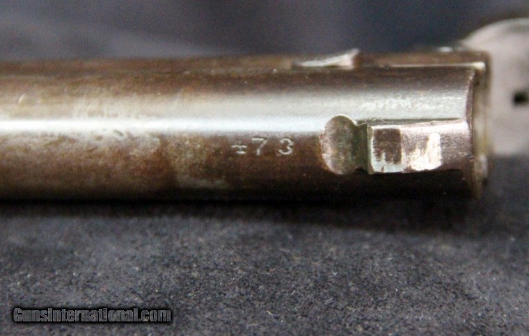 Description: .41rf, short, #473, 3 inch barrels, blue finish, 2 piece hard rubber grips, 1890's. Condition: very good bores, 40% barrel blue thinning, 60 % frame with scattered pin prick oxidation, excellent grips, excellent mechanically, excellent marks. SOLD Antique: Yes |