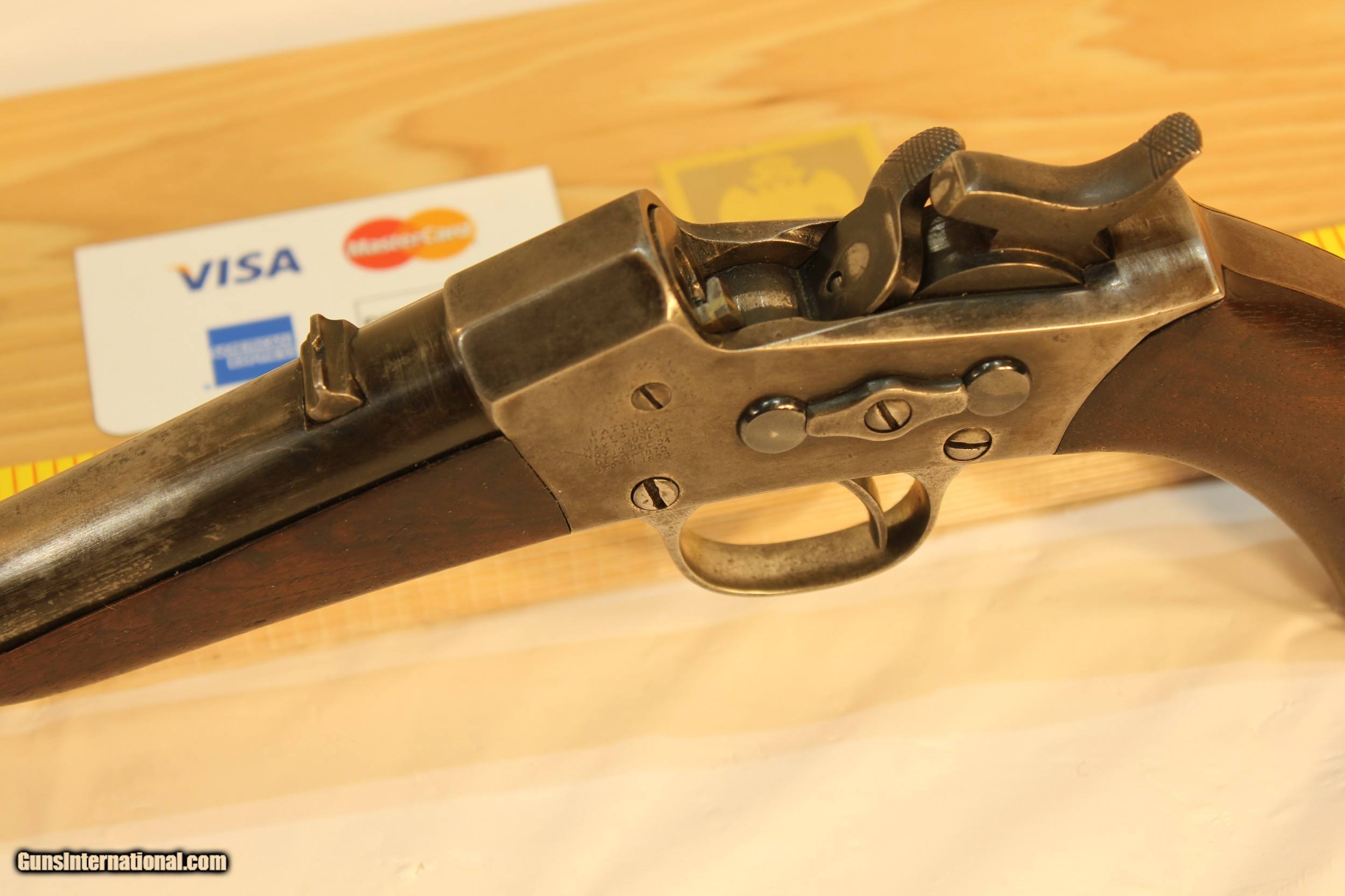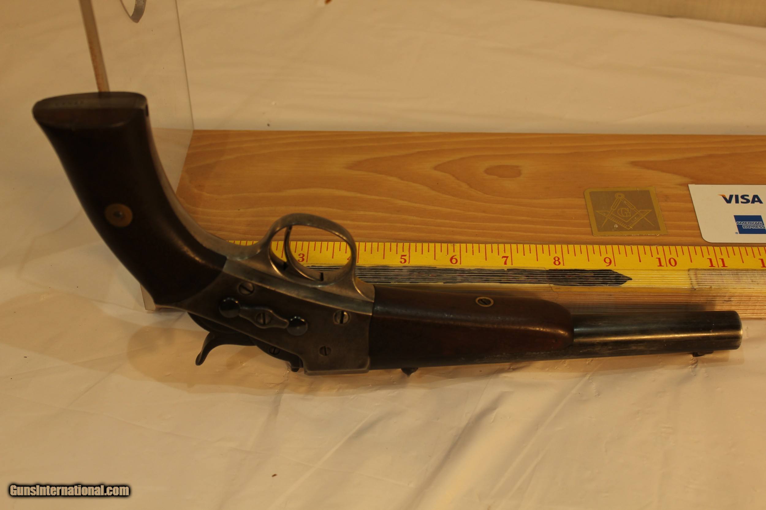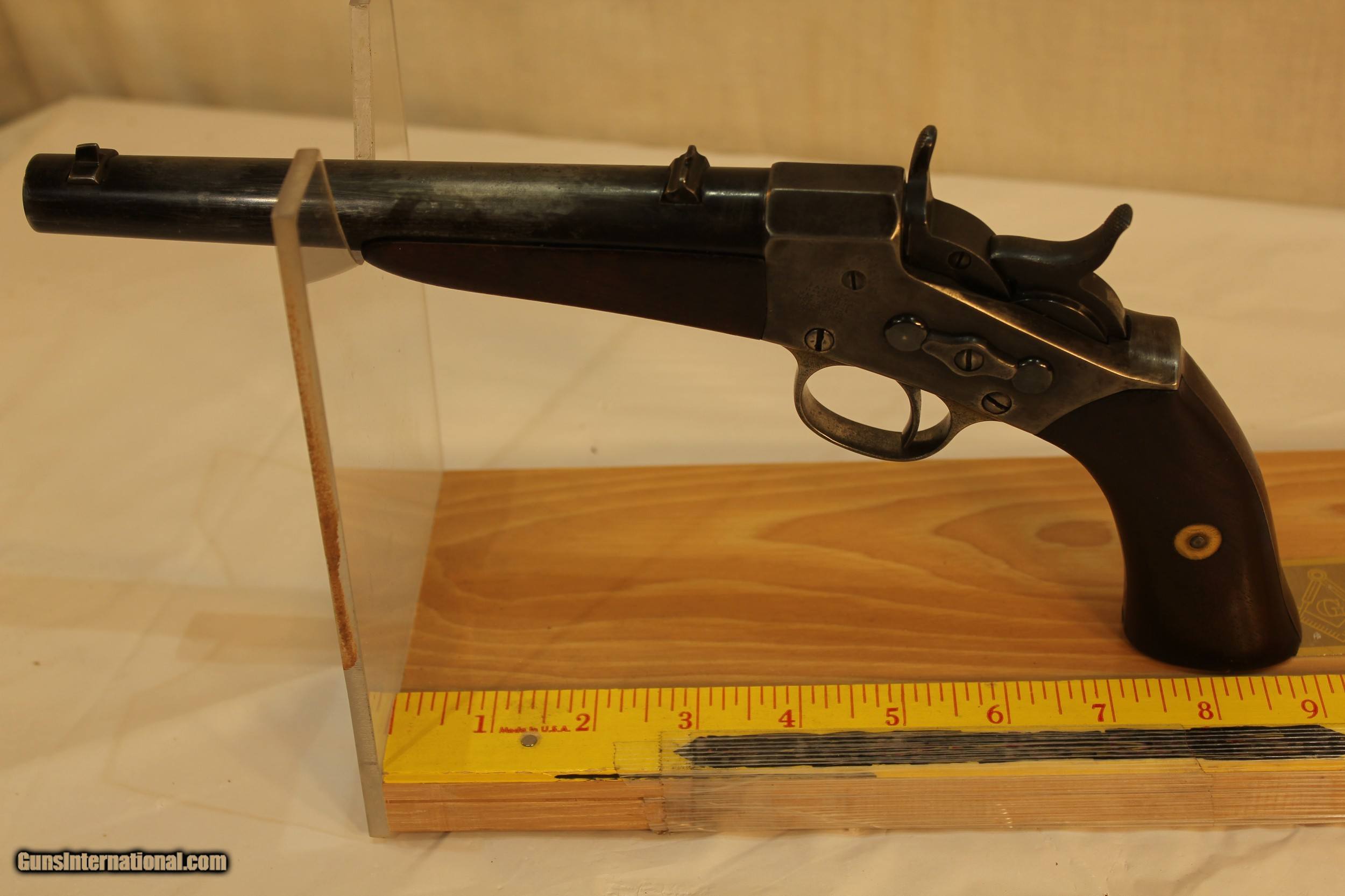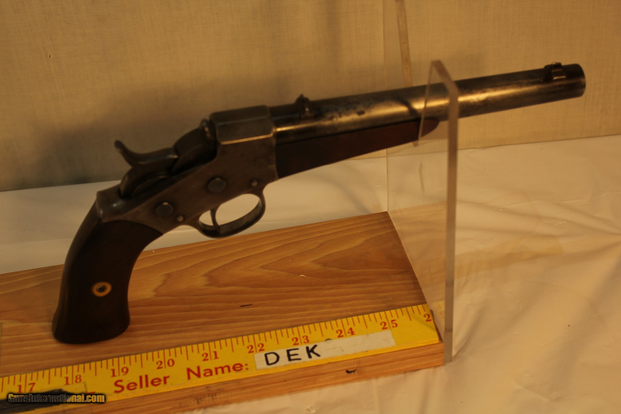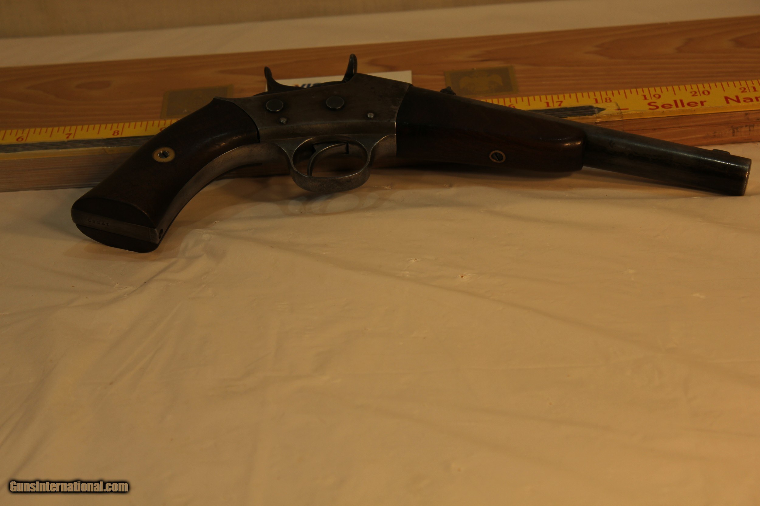 Description: This is a very unusual find as this model is one of the rarest if not the rarest Remington model of any kind. It is an 1891 model with the sliding extractor that first appeared on this model of rolling block pistols. There were only about 100 of these models ever made. The rarity is compounded by the gun having a round 8 inch barrel. The standard barrel was a 10 inch half octagon barrel. The 22 WRF barrel is bright and almost as new. It is not likely that you will ever see another of these pistols or ever have the opportunity to purchase one. This is a hefty gun at 41 ounces and in very good condition. Please use the ZOOM feature on the photos to determine the condition. The wood is sound and the finish has some damage by someone trying to clean it improperly. Antique. No paperwork required Shipping via Priority mail $25.00 SOLD Antique: Yes |