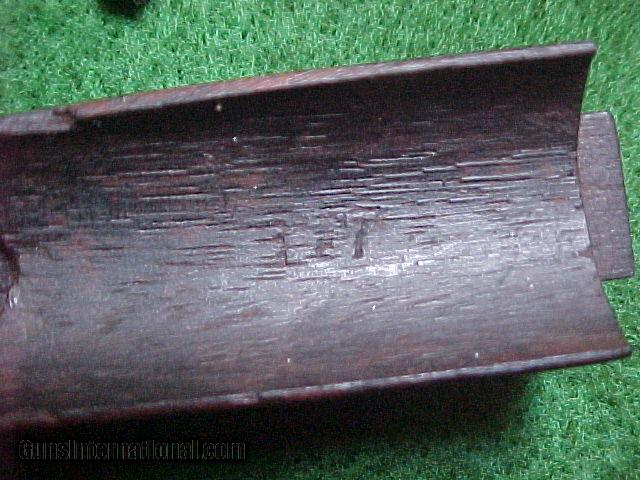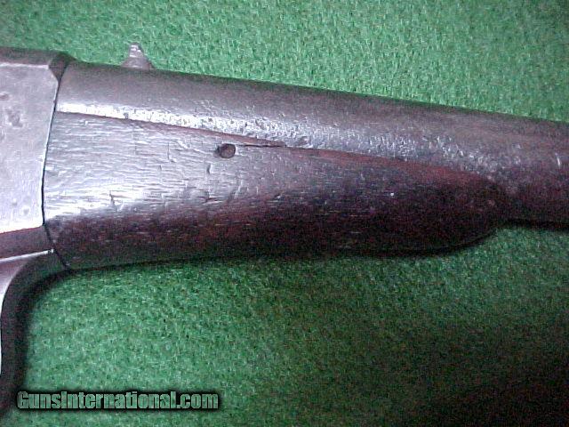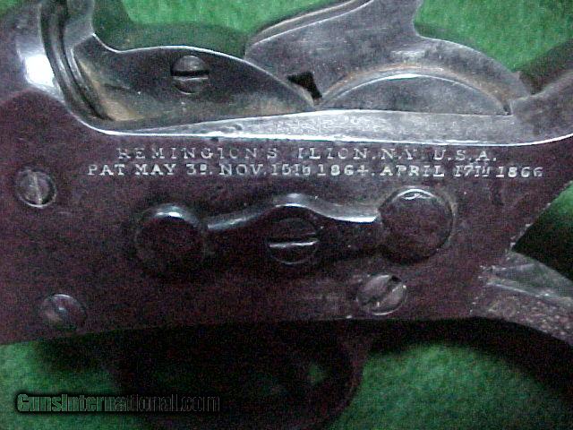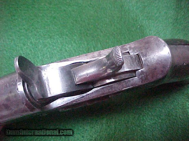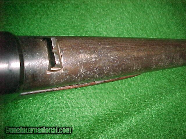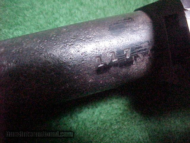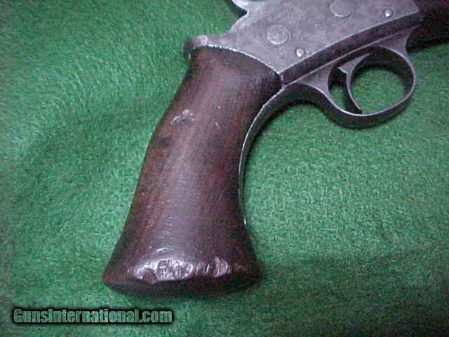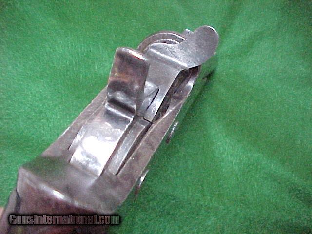 Description: Serial #117, circa late 1880's. This is a very scarce variation of the 1871 Army single shot pistol. In 1887 Remington re-barrelled a few hundred of these 50 caliber pistols with 8” round 22 caliber barrels and sold them to the public as the Mdl 1887 “Plinker” variant. They were produced until the Mdl 1891 was introduced. This example is all original but has led a less than protected life. All of the major parts; barrel, receiver (on the backstrap), grip & forend wood are numbered 117. The receiver and lower tang are also marked with the original Mdl 1871 serial number. The action is tight, the bore is poor, barrel retains 60% of thinning reblue, some light file marks appear to have removed the Remington markings (????) except the serial #, several areas of moderate pitting, original rear sight, and the receiver with all patent markings is silver/gray with some light pitting. The grip is solid with handling marks, chipped with minor wood lose at lower right and the forend has a sliver missing along the top right side. A very scarce variant in restorable condition or fill the void as-is in your Rolling Block collection. SOLD Antique: Yes |