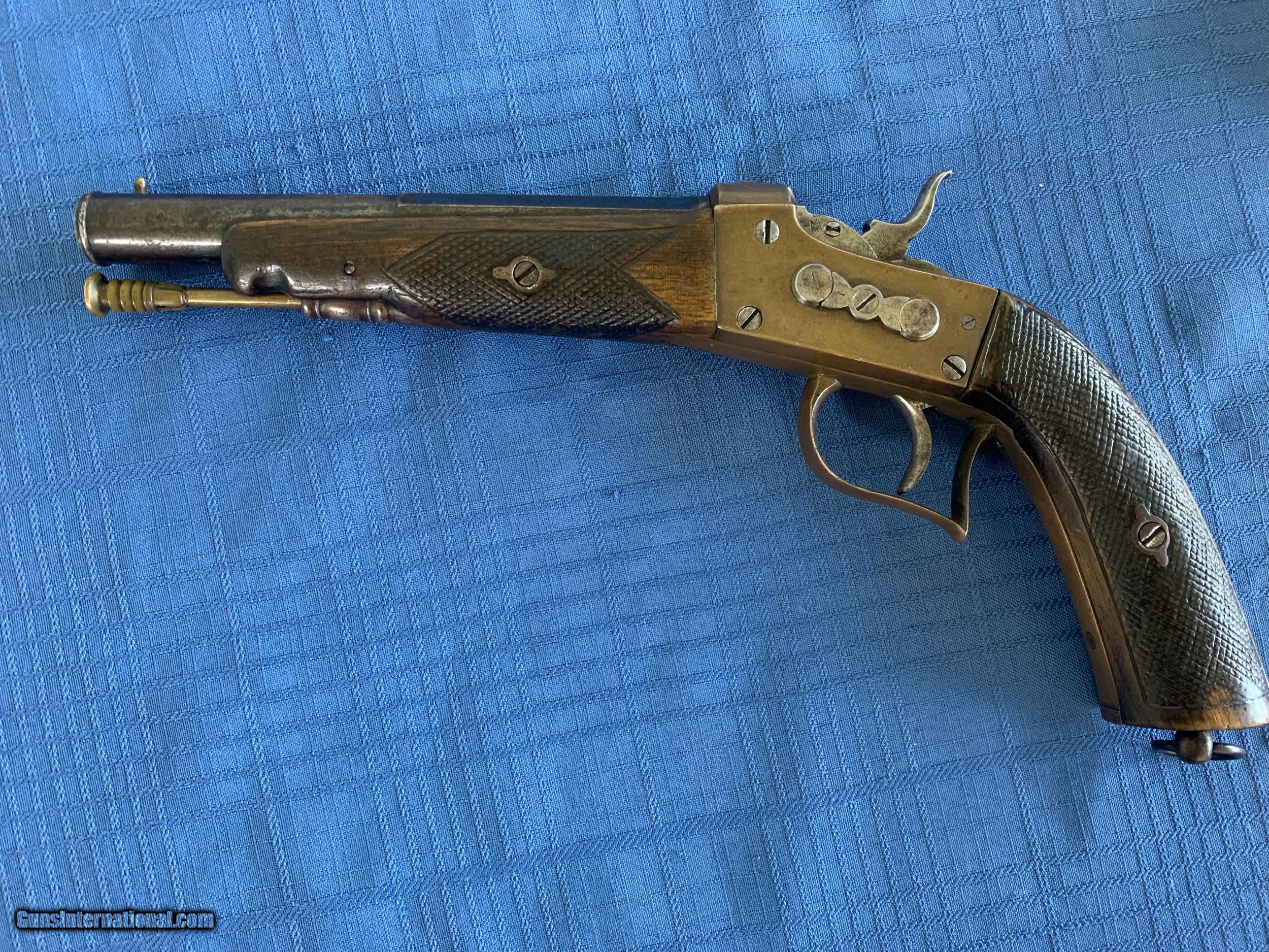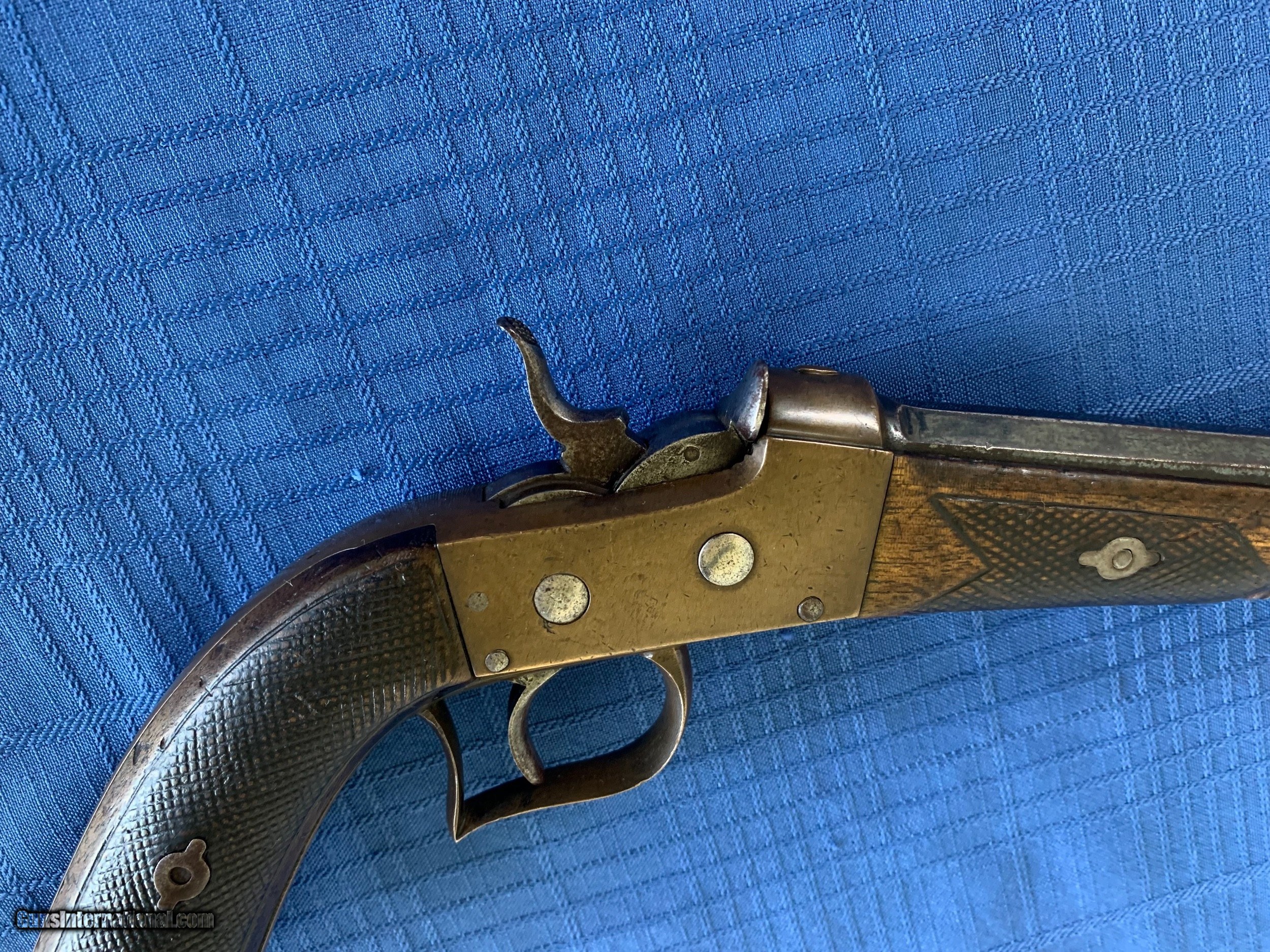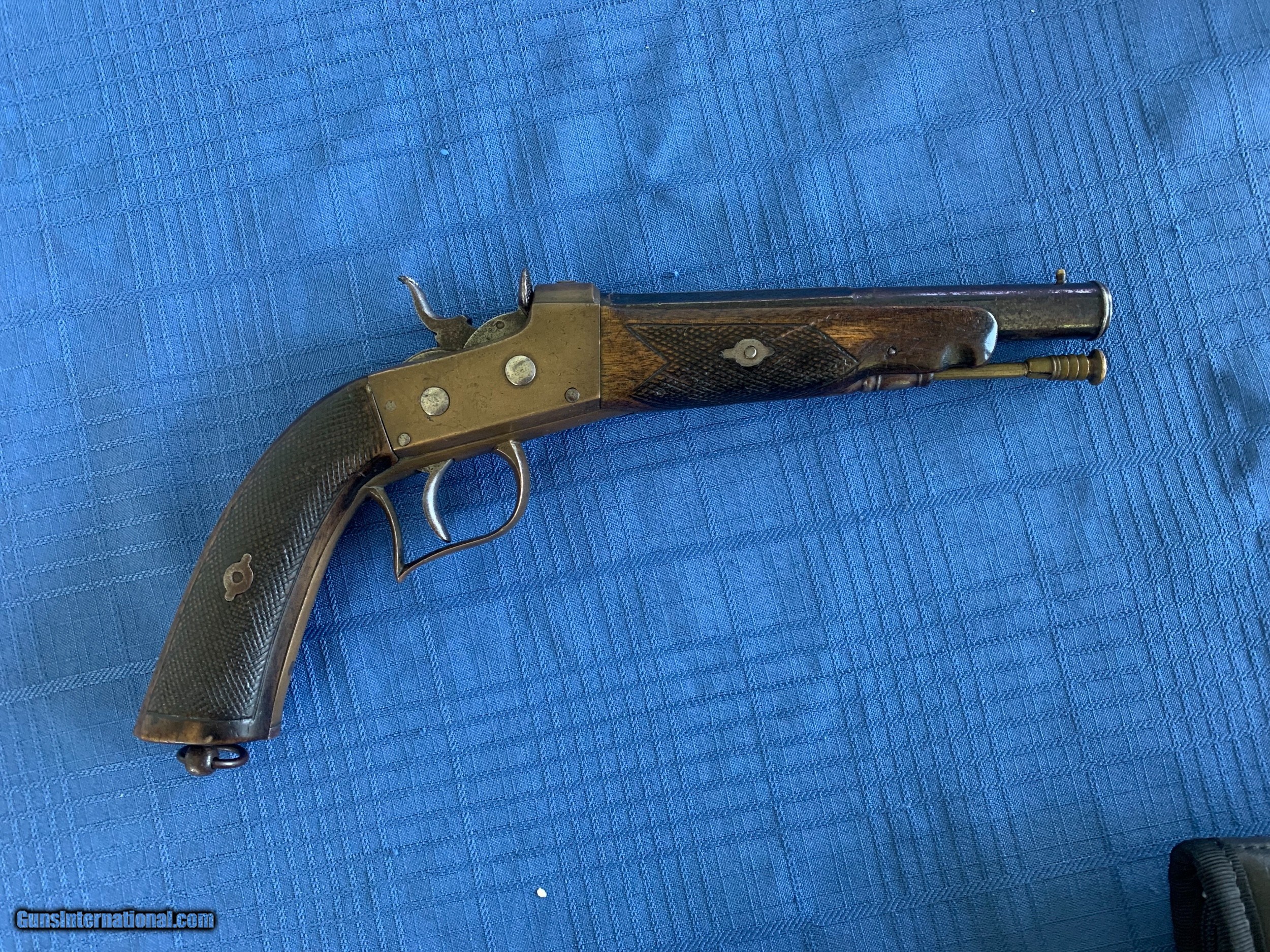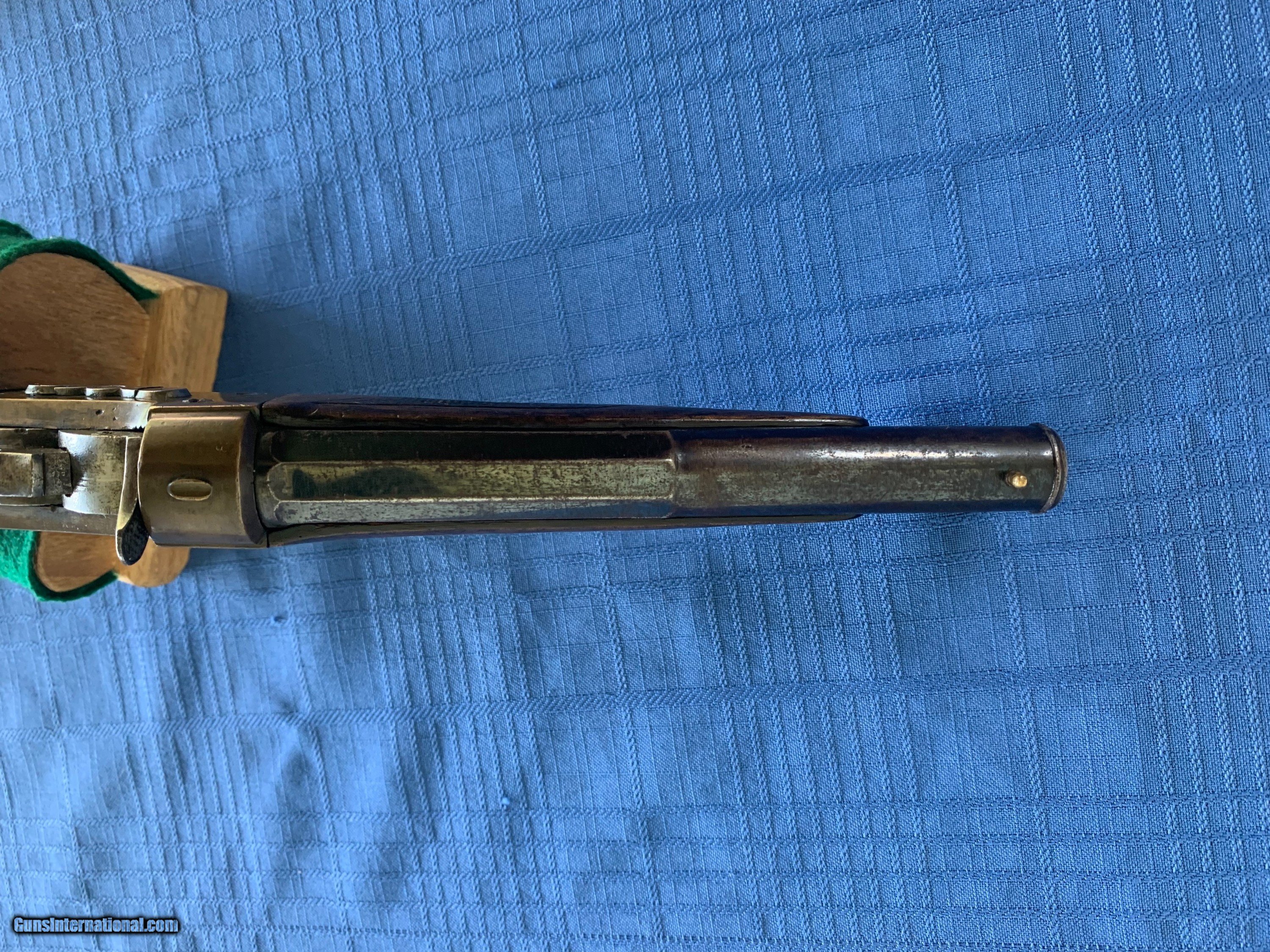 Description: Here's what looks to be a Remington Rolling Block Pistol in 50 cal. . Gun had no markings . May be a Brevet or a early Remington. Gun has all of its original blue finish on 1/2 Round barrel. Frame is brass . Frame is untouched and has a nice mellow mustard patina . Wood stocks are in Excellent condition with fine checkering . Overall in Excellent Plus Condition . Excellent working order. Bore and mechanics are Excellent. Very cool looking pistol . 120 day layaway available . Please review my photos and email me with any questions ? 3 day inspection as allways . Thank you for looking Little Jo SOLD Antique: Yes Handgun Caliber: .50 Action Express Manufacturer: Remington Model: Rolling Block Serial Number: Nsn Barrel Length: 6” Condition: Excellent |