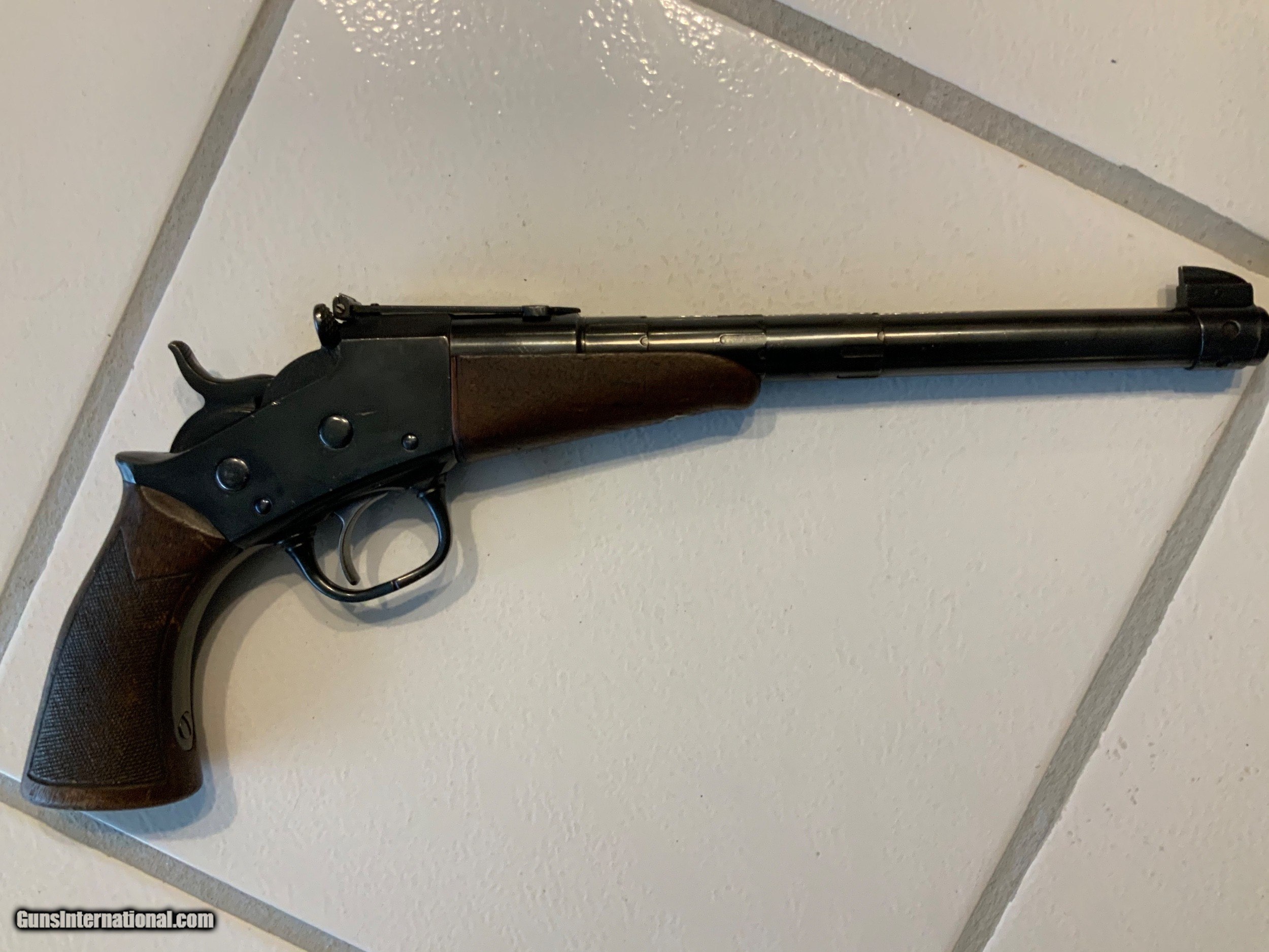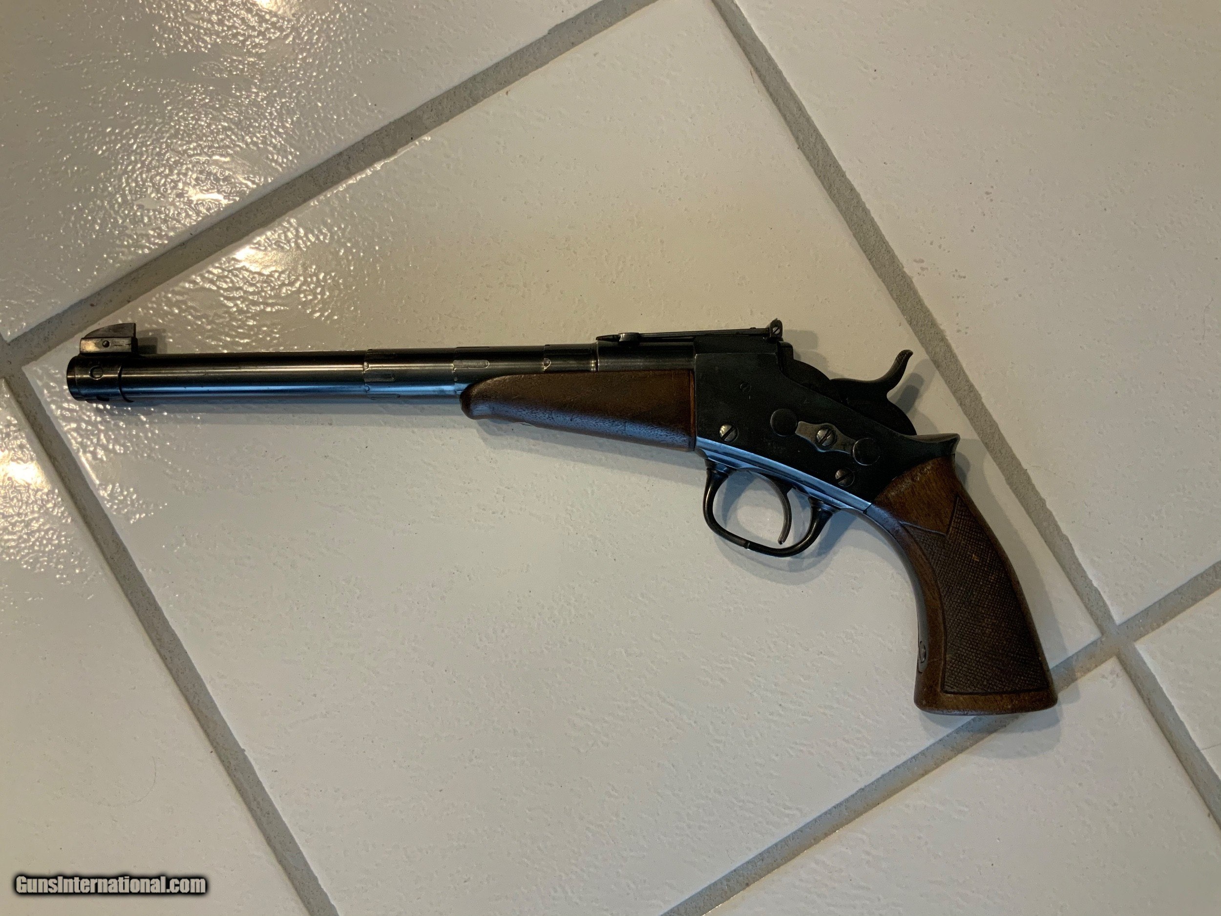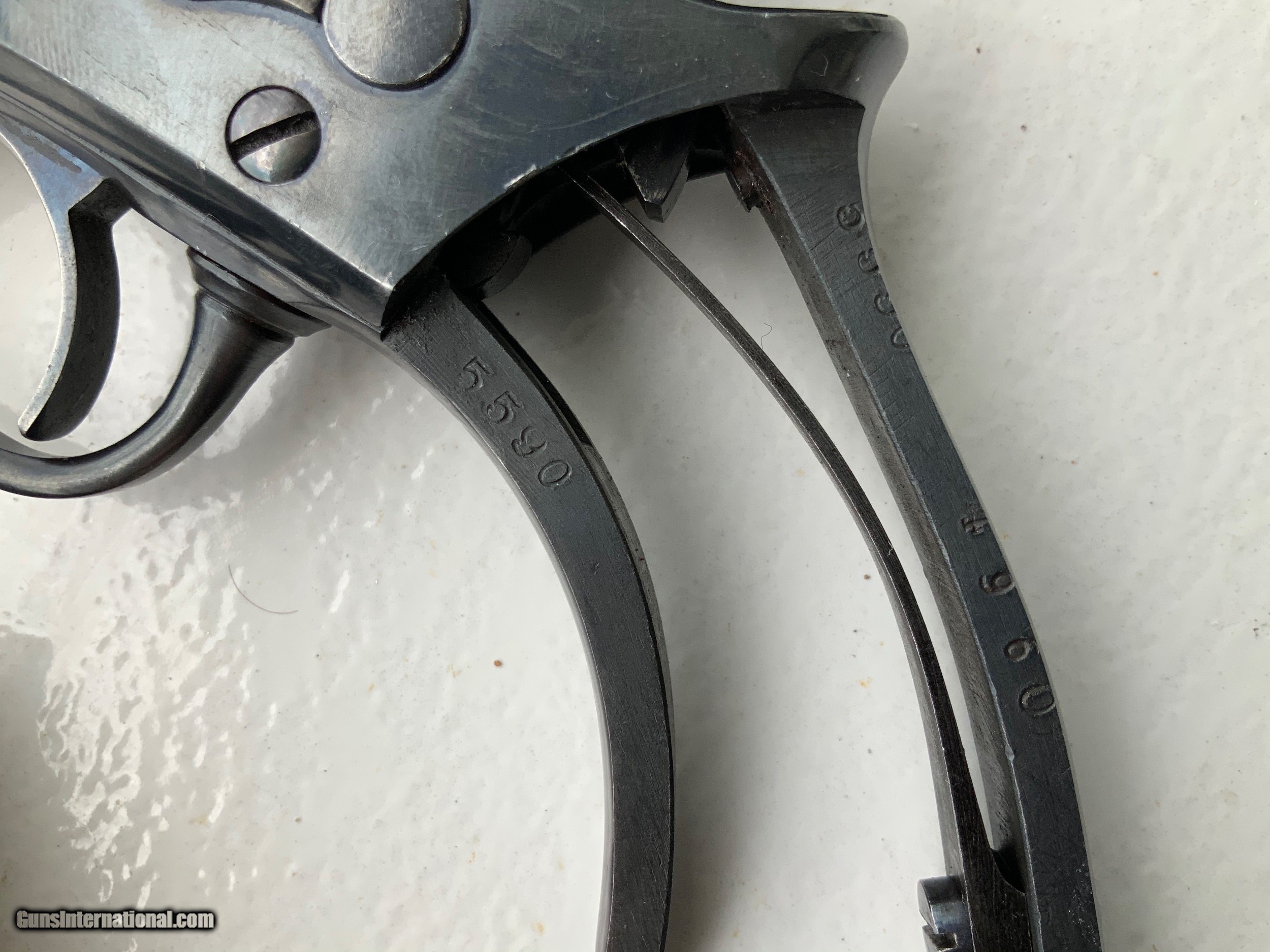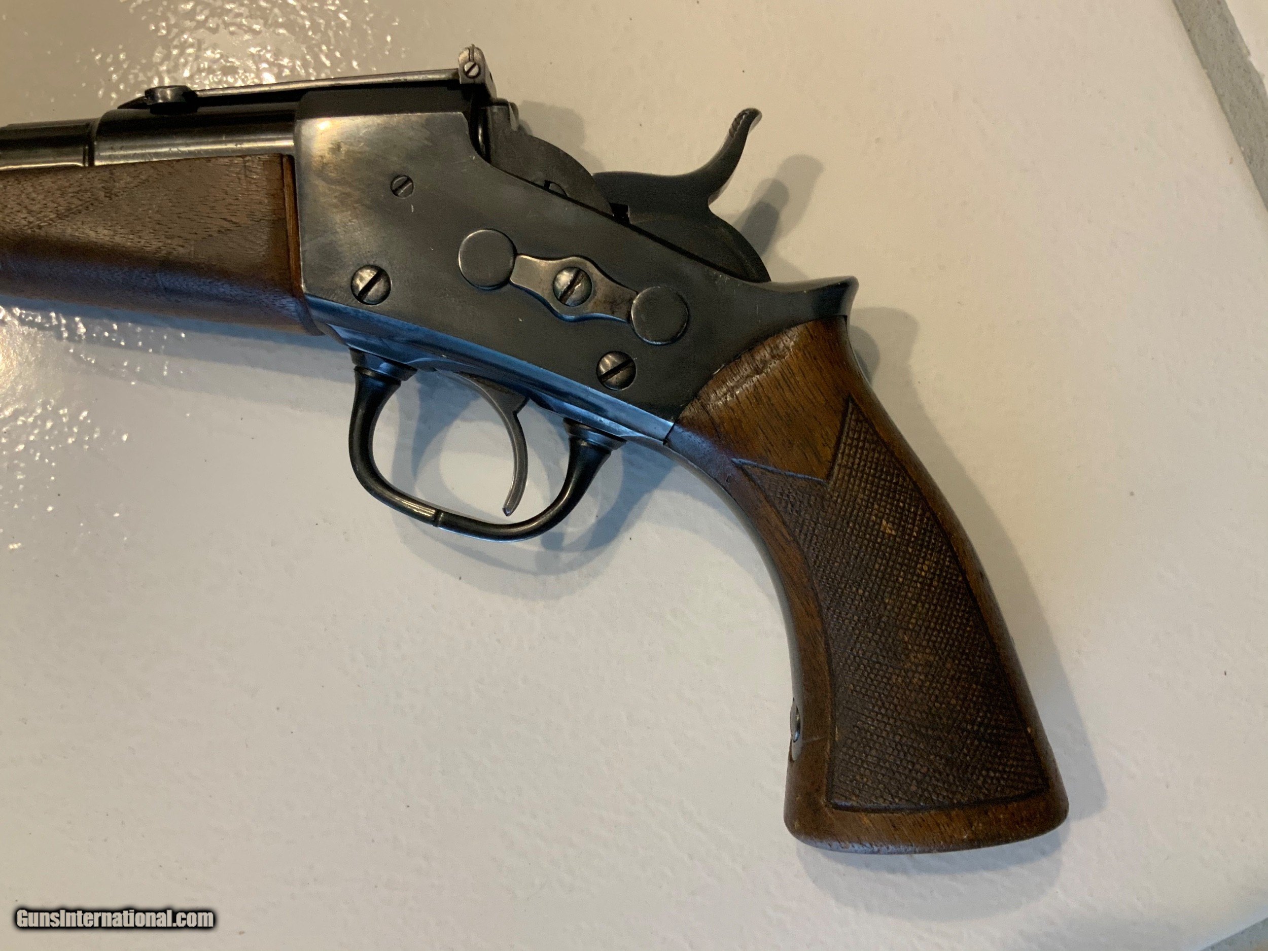 Description: Remington Rolling Block Pistol Model of 1871 Customized This pistol has been modified by a gunsmith unknow to me. It is, I believe a US Army pistol Model of 1871. The work on the piece is first class. There are no marking on the exterior of the pistol. Assembly and Serial numbers appear on the frame and trigger guard, visable with the grip removed. The Barrel is 10 1/8" long, the bore is excellent, rifling sharp and bright. There is a barrel band with a wide blade front sight. The rear sight is adjustable. The barrel is round, tapered and stepped down four times. The steps are fluted. Very decoritive. It is sleved in .38 caliber. The foreend is uncheckered and unnumbered. The Trigger guard has been modified. The single piece grip is checkered. The action and extractor function correctly. The trigger pull is light and crisp. The face of the frame was reshaped flat and a sliver of wood added to the rear of the foreend. Bluing is 99%, no rust, or pits, one small scratch on the right side of the frame. Screw heads and pins are good. I quality fo the work is excellent, perhaps some artist was showing off his skills. Assembly Numbers on Frame and Trigger Guard 5590 Serial number 4960 SOLD Antique: Yes Manufacturer: Remington Model: 1871 Serial Number: 4960 Caliber Info: .38 Condition: Excellent Metal Condition: Excellent polish and blue Wood Condition: No cracks or splits Bore Condition: Sharp rifling, no rust Barrels: 10 1/8” Barrel Type: Round, sleved Action: Rolling Block Triggers: Light and crisp Item Location: Florida |