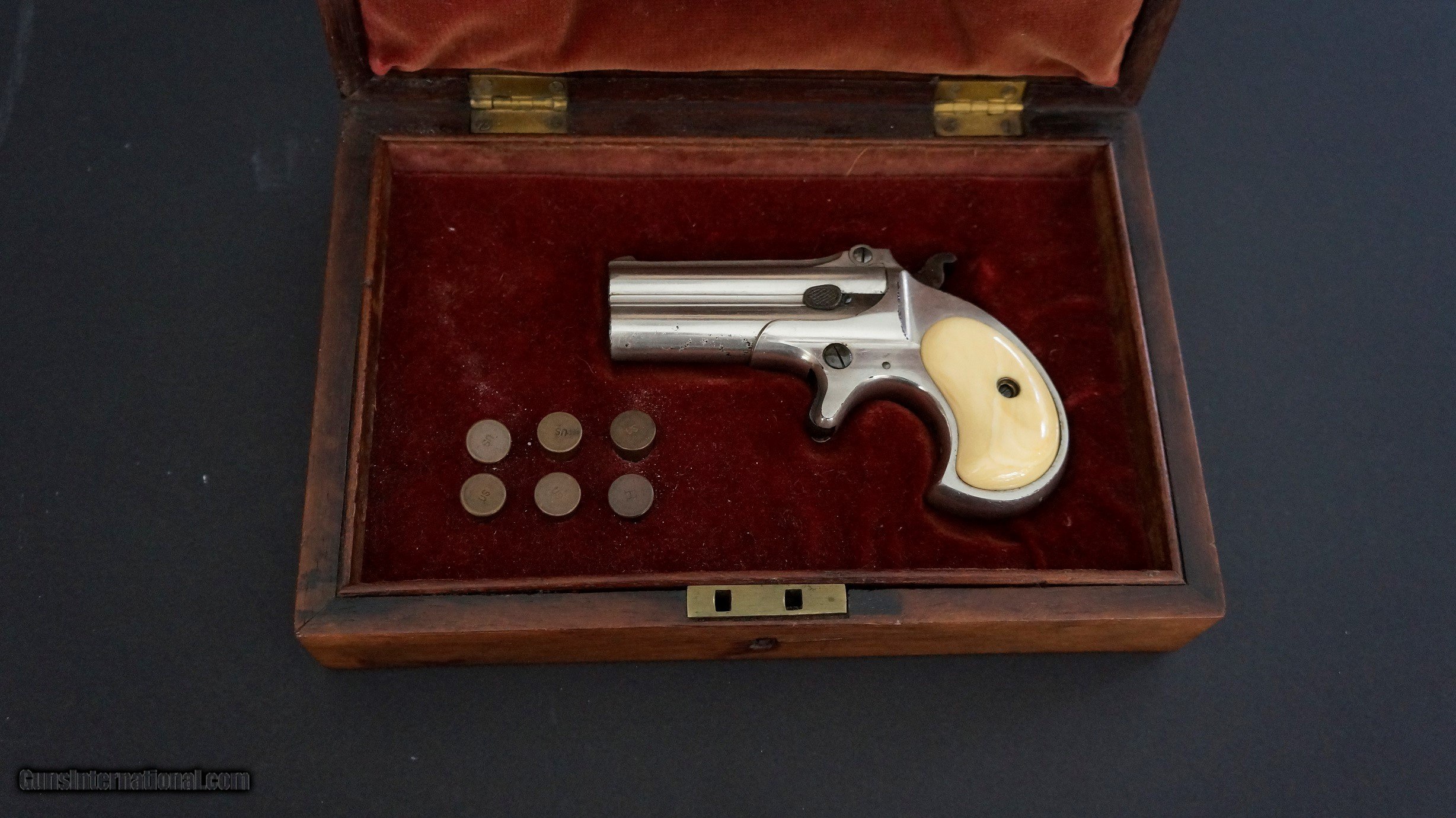 Description: The gun is excellent. Everything is fine, action, hinge and plating is 99%.The elephant ivory grips/stocks are in perfect shape, no cracks or visible problems other than yellowing with age although they were not on the original gun. I have added photo’s of the original gun as I bought it. I am not a dealer, I priced the gun based on other offerings. If someone is familiar with antique guns any suggestion would be appreciated. According to Flayderman’s Guide to Antique Guns and The Blue Book of Gun Values this is a Model 2, 1868. I have no knowledge regarding the age or origin of the walnut case and because of that I did not add any cost of the Remington for the case or the ivory grips.. I have to include a a copy of the ivory rules that I am offering the Remington under.