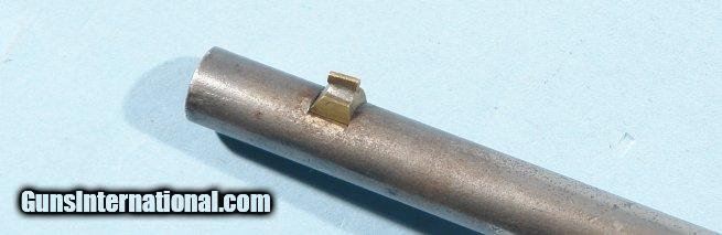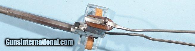 Description: VERY RARE REMINGTON-ELLIOT SAW HANDLE .32RF CAL. SPLIT BREECH DERRINGER PISTOL-RIFLE CA. 1870’S. Almost never seen for sale with only a dozen or so known. All matching and original with 16 ½” part octagon part round barrel with factory elevator rear sight and old brass non factory blade front sight. Serial numbered in the 2xxx range. Nickel plated finish with approximately 80-90% remaining. Original nickel plated wire skeleton detachable stock which has no number but is original to the gun. Working order and excellent bore. SOLD Antique: Yes |