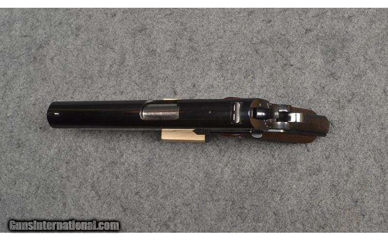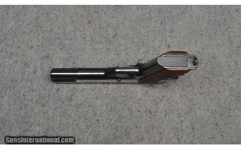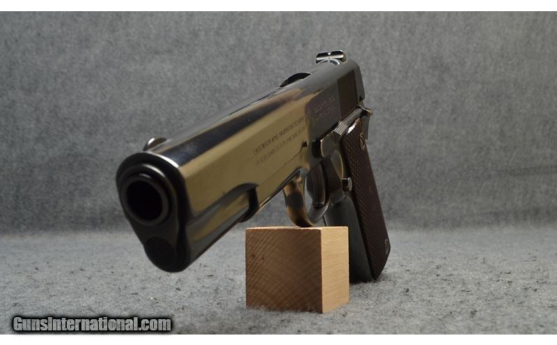 Description: This semi-automatic pistol is a Colt/Remington Rand 1911A1 U.S. Army chambered for .45 ACP. This pistol features checkered plastic grips, an internal extractor, and a lanyard loop. This pistol is in overall very good condition, having been professionally refinished at one point, with some small handling marks, and a few small blemishes on the slide. The slide is marked for Colt's PT.F.A.MFG.CO. The frame is marked "FJA" for Remington Rand, and is stamped "UNITED STATES PROPERTY M1911A1 U.S. ARMY". .45 Auto SOLD Metal Condition: Overall very good condition Wood Condition: Overall very good condition Bore Condition: "Bright and shiny, crisp rifling Barrels: 5in Fore End: Checkered plastic grips Weight: 2 Lbs 6 Oz Sights: Iron sighs Item Location: Wichita, KS |
