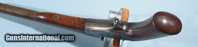 Description: FINE UNALTERED REMINGTON U.S. NAVY MODEL 1865 ROLLING BLOCK .50RF CAL. SINGLE SHOT PISTOL CA. 1865-6. All original and complete down to the last screw and although correctly not serial numbered all the parts original to the gun. Very scarce in this original form as many altered to later models with shortened barrels and trigger guards added. 8 ½” barrel with “ANCHOR” U.S. Navy Ordnance acceptance proof at the top of the breech. Right side of frame proofed and Ordnance inspected F.C. Warner “P/F.C.W.” Grip with excellent “FCW” script cartouche. Fine metal with soft grey patina. Excellent markings including the Remington address and patent date stamp on the left side of frame. Still has the original rimfire breech block with many later converted to center fire. Sock and forend with the original finish. Working order and superior bore with excellent rifling. Best one we have ever had and with old collection provenance. Price on request. SOLD Antique: Yes |