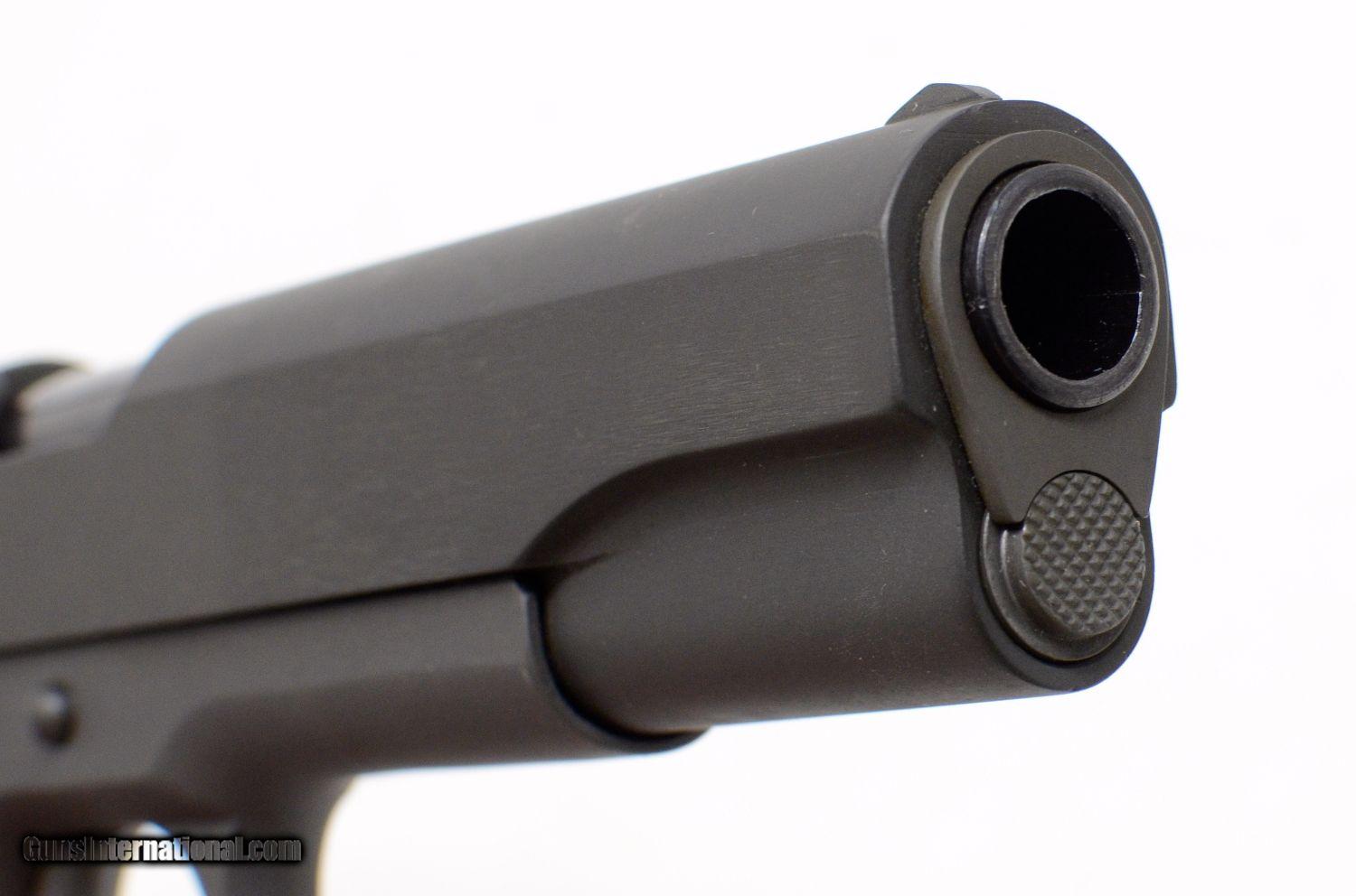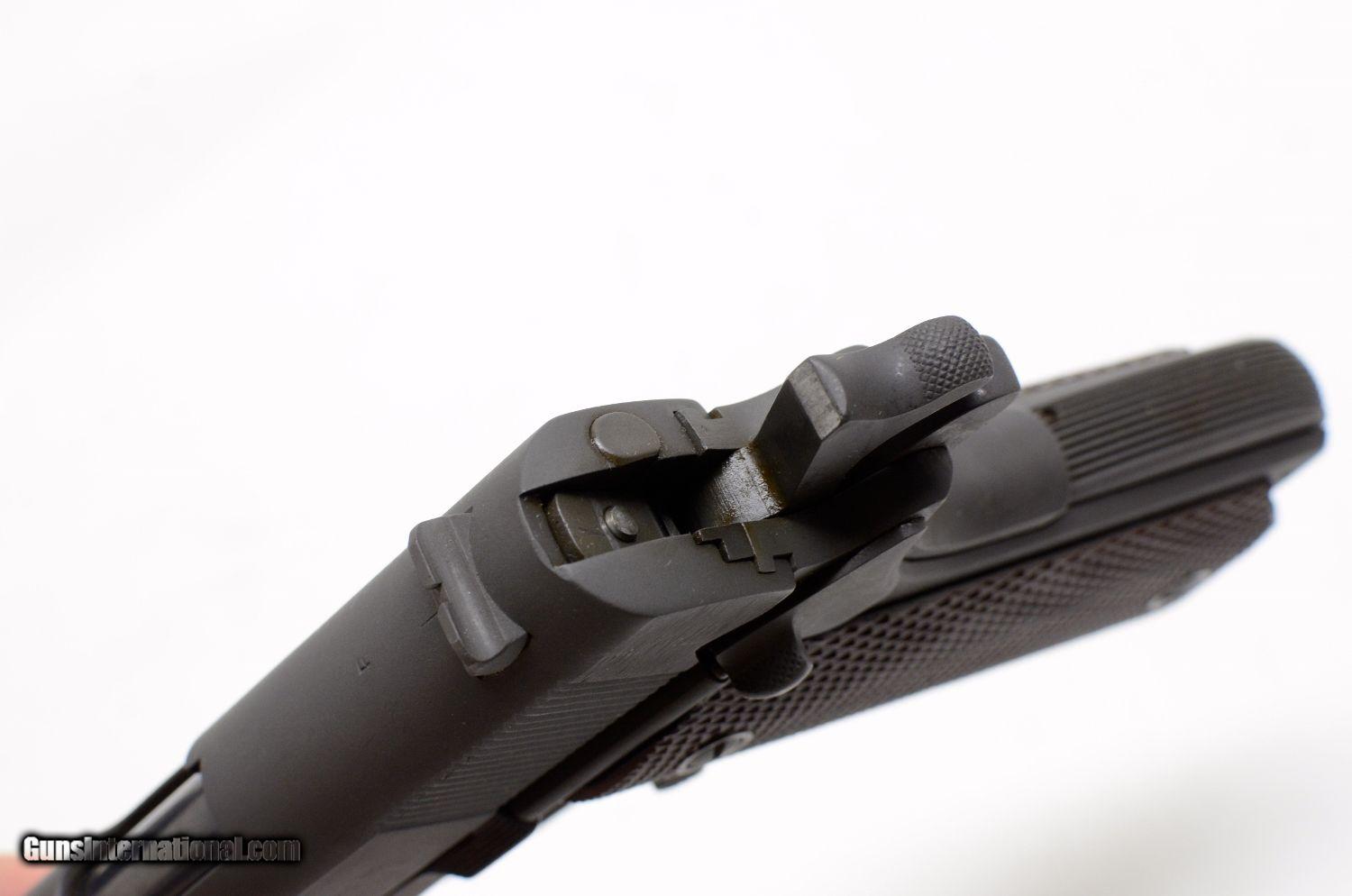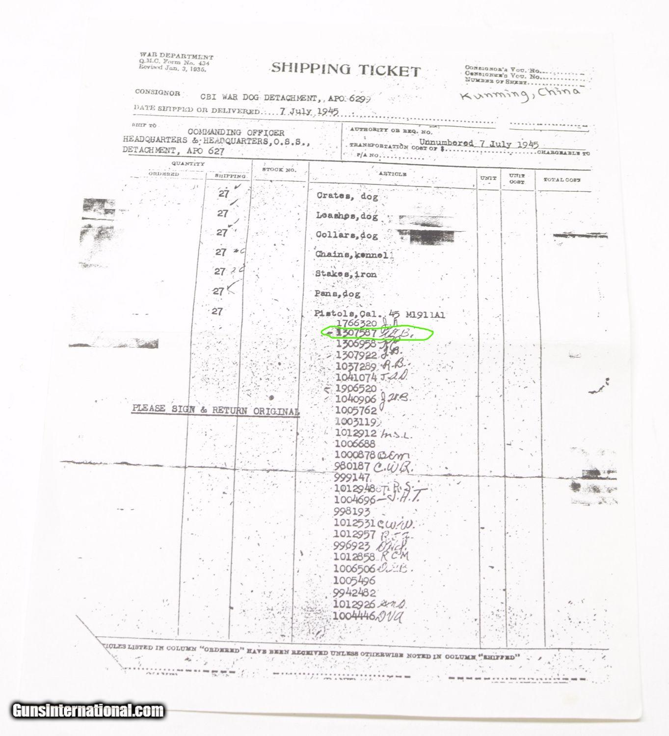 Description: M1911A1 45 ACP Remington & Rand Inc. Very Rare Documented WWII Issue. SN 1307587 AVAILABLE FOR PURCHASE AT OUR ON-LINE STORE 'The M1911 is a single-action, semi-automatic, magazine-fed, recoil-operated pistol chambered for the .45 ACP cartridge.[1] It served as the standard-issue sidearm for the United States Armed Forces from 1911 to 1986. It was first used in later stages of the Philippine–American War, and was widely used in World War I, World War II, the Korean War, and the Vietnam War. The pistol's formal designation as of 1940 was Automatic Pistol, Caliber .45, M1911 for the original model of 1911 or Automatic Pistol, Caliber .45, M1911A1 for the M1911A1, adopted in 1924. The designation changed to Pistol, Caliber .45, Automatic, M1911A1 in the Vietnam era.[1] In total, the U.S. procured around 2.7 million M1911 and M1911A1 pistols in military contracts during its service life. The M1911 was replaced by the 9mm Beretta M9 pistol as the standard U.S. sidearm in October 1986, but due to its popularity among users, it has not been completely phased out. Modernized derivative variants of the M1911 are still in use by some units of the U.S. Army Special Forces, the U.S. Navy and U.S. Marine Corps.[4] Designed by John Browning, the M1911 is the best-known of his designs to use the short recoil principle in its basic design. The pistol was widely copied, and this operating system rose to become the preeminent type of the 20th century and of nearly all modern centerfire pistols. It is popular with civilian shooters in competitive events such as USPSA, IDPA, International Practical Shooting Confederation, and Bullseye shooting. Compact variants are popular civilian concealed carry weapons, because of the design's relatively slim width and the stopping power[5] of the .45 ACP cartridge.' Wikipedia SPECIFICATIONS
