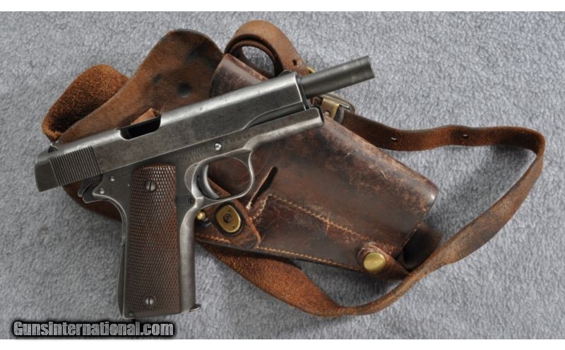 Description: SOLD Curio/Relic: Yes Manufacturer: 1943 Caliber Info: .45 Automatic Colt Pistol Metal Condition: Scattered light surface rust with remainder of the metal fading to gray patina Wood Condition: Grips appear to be replacements as they do not match the aged look of the rest of the pistol Bore Condition: Good distinctive rifling but shows lack of cleaning Barrels: 5 Triggers: Single Action Stock: Brown Plastic (replacements) Weight: 40 oz Sights: Fixed blade front, Dovetailed Notch rear Extras: Leather Tanker style holster Item Location: Grand Junction, CO |