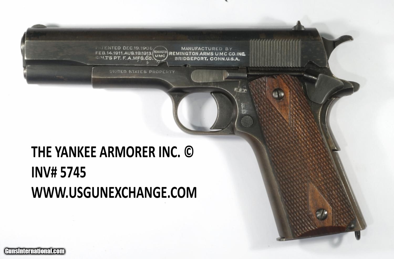 Description: Inv. 5745 WWI Remington - UMC U.S. Mdl. 1911, Ser.51XX*. * First month or two of production which started August 10th Fantastic condition, just fantastic. This is a low serial number pistol made in 1918. For WWI 1911’s this is the equivalent of a WWII "Singer". The condition is awesome, retaining at least 95+% of the original factory bluing. There are some very small areas of surface flaking that the Remington-UMCs are famous for, but certainly not enough to detract from it's very high end condition. Add to that the slightest bit of edge silvering, some mild toning of the gripstraps and that's it. Certainly no pits, rust, rub marks or scratches anywhere. All parts match and every part that is indigenous to the gun and should be stamped with a Rem.-UMC production code is so stamped. The bolt face and feed ramp show very little use. The frame is inspector stamped EEC (Edward E. Chapman) and an Upturned Eagle/E28 which is correct. The walnut grips are in super condition. They show no chips, cracks or flattened points. They are the proper double diamond type with the correct 13 points between the diamonds. The barrel, like everything else is properly stamped with a small "P" proof and forward of that and an "R". The bore is just super, very bright, with sharp crisp rifling, also showing almost no use. This Colonel’s Cabinet Queen is 100% correct in every way and comes with one proper two tone short lipped original Remington-UMC magazine. For the collector where rarity and condition are the prime consideration.......$8250. To purchase this firearm or if you want to request more information contact us at: Email ckgunsymail Phone 201-512-0002 Cell 201-575-6838 FAX 201-215-4759 We accept most major credit cards. Prices shown are Discounted 3% for Cash or Check. The buyer must be familiar with all the laws governing the purchase and the ownership of firearms in their own city and state. The Yankee Armorer, Inc is not responsible for any failure to comply with or observe these laws. The Yankee Armorer, Inc will only ship after full payment and receipt of all required documents. Shipping: Add $35.00 for handguns, $45.00 for long guns. New Jersey buyers are subject to a 7% sales tax. The Yankee Armorer, Inc offers a 3 day inspection period with full refund upon return of intact firearm and in the original condition. The Yankee Armorer, Inc offers a no interest lay away program - 25% down; 25% in 30 days; 25% in 60 days; and full payment in 90 days. Any violation of this policy is subject to restocking and forfeiture of all payments. Any variation from this policy must be agreed to in advance. Unshipped Cancelled sales are subject to a 20% restocking fee. Be advised that all firearms sold by The Yankee Armorer, Inc. or the Gun Exchange, LLC (SELLER) are sold as collector’s items. They have not been fired or tested for safety and must be examined by a license gunsmith prior to use. By purchasing any item from the (SELLER), you are agreeing to hold the (SELLER) free from any damages or lawsuits of any nature. Any item left for transfer or storage will be charged to $25.00 per month, per item from the day of its receipt. Any variation from this policy must be agreed to in advance. Store hours 10:00 am to 5:00 pm Tuesday -Saturday. It's always best to call for appointment. Store 201-512-0002, cell 201-575-6838. SOLD Curio/Relic: Yes Manufacturer: Remington UMC Model: 1911 Serial Number: 5107 Caliber Info: .42 |