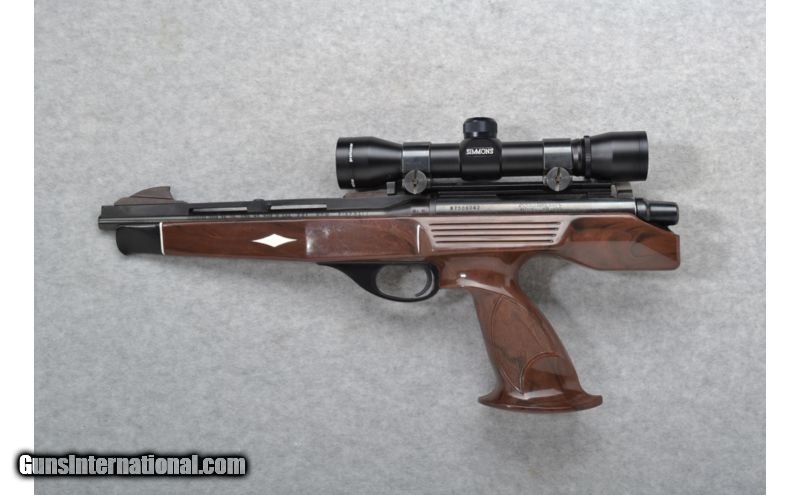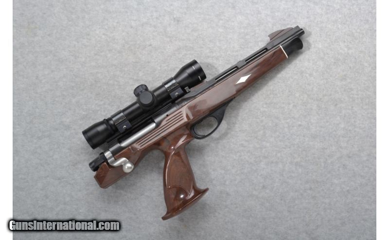 Description: SOLD Caliber Info: .221 Rem. Metal Condition: Excellent. Bore Condition: Excellent. Barrels: 11 inches with a ventilated rib. Stock: Checkered brown synthetic grip with a black tip and white diamond in forearm. Weight: 4 lbs. 8 oz. with scope mounted. Sights: Simmons proHunterScope. Front blade. Notch middle. Extras: With soft Case. Item Location: Richfield, WI |