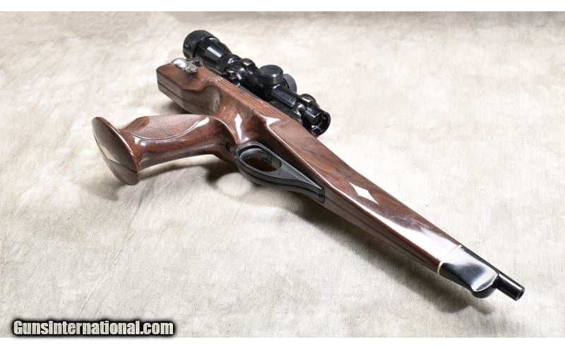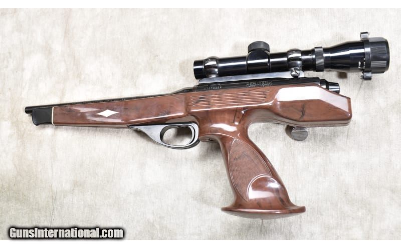 Description: This one is a rare find. The XP-100 was manufactured from Dupont Delrin 66, and this shows almost no wear. All the parting lines are tight, the metal parts are clean, and the chamber looks nearly unused. .221 Remington Fireball SOLD Chambers: Single-shot bolt Metal Condition: Excellent. Wood Condition: Excellent. Bore Condition: Shiny and bright. Barrels: 10-3/4 inch Triggers: Factory trigger. Weight: 71 oz. Sights: Set up for scope and outfitted with a 1.5x20 scope. Item Location: Rogers |