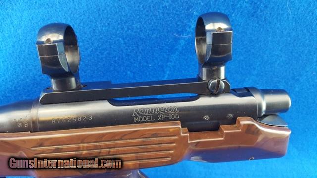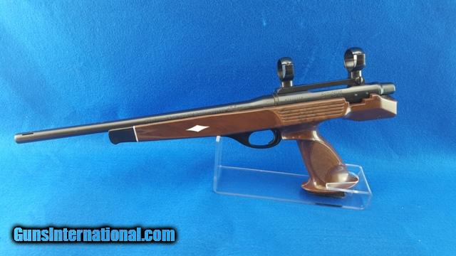 Description: Remington XP-100 Silhouette single shot bolt action pistol, 14 1/2 in. barrel, drilled & tapped , one piece Dupont Zytel (nylon) pistol grip stock with two diamond pattern inlays in the forend. Leupold one piece base and 30mm rings. This has been rechambered from 7mm BR to custom 7 L&L. The 7 L&L is based off the 444 Marlin case necked down to a 7mm bullet. Huntington makes the forming dies (set of 4 ) and the regular dies (2 die set ) Barrel is ported. Metal is 98% / overall conduction is 98% plus. Add 3% for C/C S&H $25.00 SOLD Manufacturer: Remington Model: XP-100 Caliber Info: 7 L&L custom Condition: 98% |