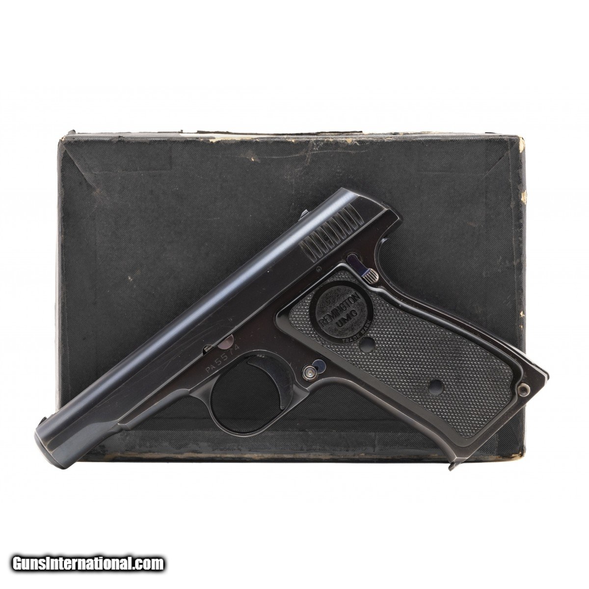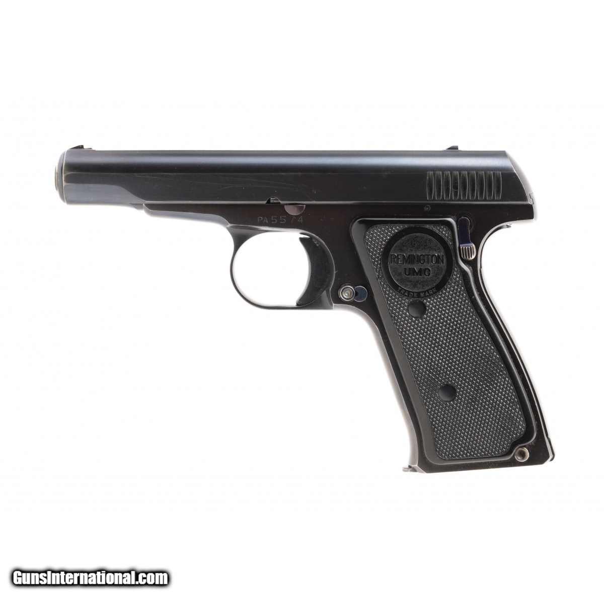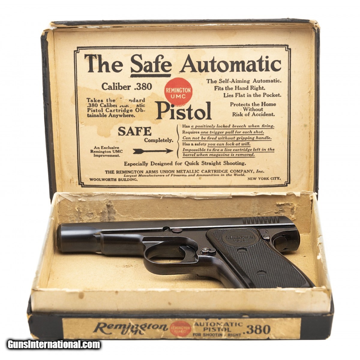 The Remington Model 51 pistol was manufactured from 1918 to 1926. It was and is well-liked for its elegant styling and slim easy to carry frame. The 380 ACP pistol with its 8 shot capacity (7 in magazine and 1 in chamber) was a powerful concealed carry pistol of its day. The 3.25"" barrel has an excellent bore with bright, strong rifling. The early gun, serial number PA5574, is like new with approx. 99+% blue. The top of the slide is marked THE REMINGTON ARMS UNION METALLIC CARTRIDGE CO. INC. over REMINGTON ILION WKS. ILION. N.Y. U.S.A. PEDERSEN'S PATENTS PENDING. The magazine is correctly marked 380 CAL. The checkered plastic grips, with the REMINGTON UMC logo at the top, are excellent with no cracks or chips. The action functions correctly. The correct box is good with a tape repair across the top front. Some repair work could greatly improve the box. This is a great in the box example of one of the best U.S. pocket pistols of its era. You will never need to upgrade this pistol.