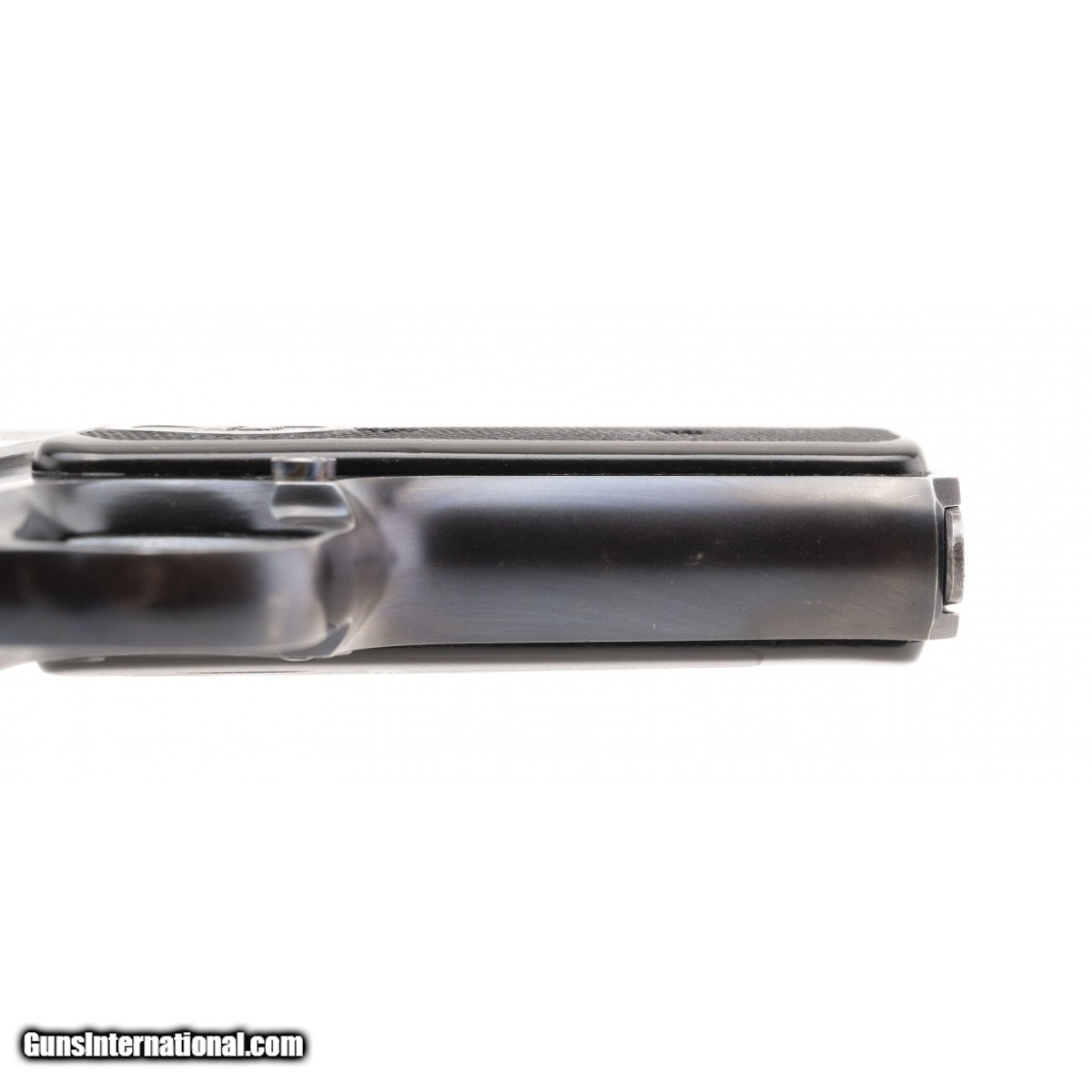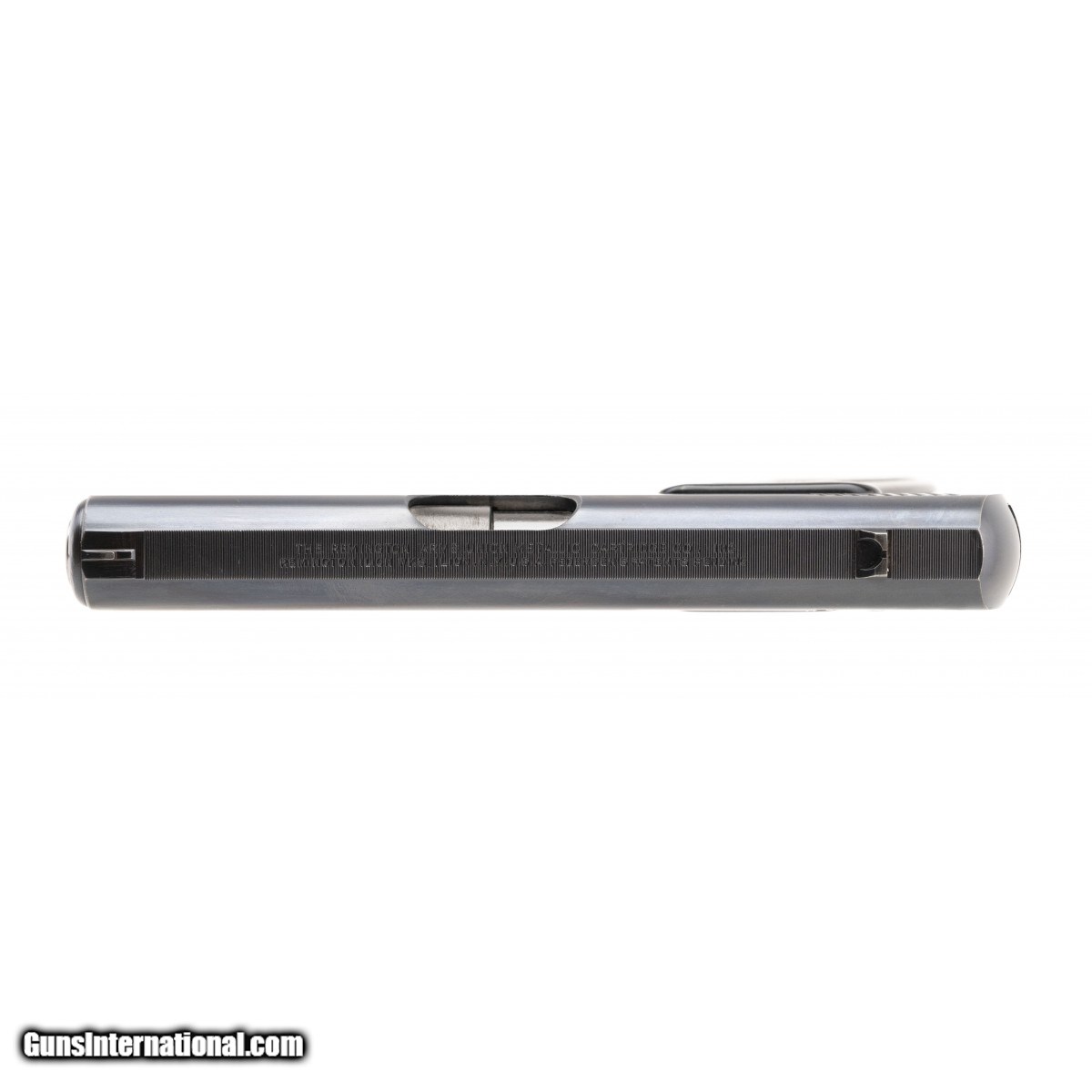Description: " The Remington Model 51 pistol was manufactured from 1918 to 1926. It was and is well-liked for its elegant styling and slim easy to carry frame. The 380 ACP pistol with its 8 shot capacity (7 in magazine and 1 in chamber) was a powerful concealed carry pistol of its day. The 3.25"" barrel has an excellent bore with bright, strong rifling. The early gun, serial number PA5574, is like new with approx. 99+% blue. The top of the slide is marked THE REMINGTON ARMS UNION METALLIC CARTRIDGE CO. INC. over REMINGTON ILION WKS. ILION. N.Y. U.S.A. PEDERSEN'S PATENTS PENDING. The magazine is correctly marked 380 CAL. The checkered plastic grips, with the REMINGTON UMC logo at the top, are excellent with no cracks or chips. The action functions correctly. The correct box is good with a tape repair across the top front. Some repair work could greatly improve the box. This is a great in the box example of one of the best U.S. pocket pistols of its era. You will never need to upgrade this pistol. SOLD |
