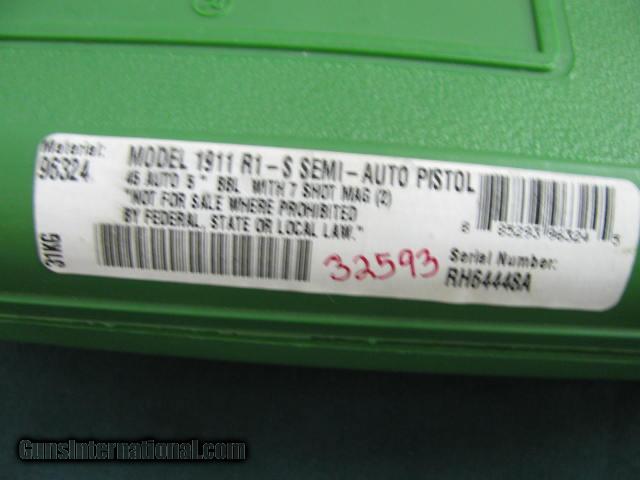 Description: 6072 Remington R1S 45 auto 5 inch barrel, 2 mags hold 7 rounds each,STAINLESS STEEL, AS NEW IN CASE WITH PAPERS, SHOT 10 ROUNDS ONLY,double diamond wood checkered grips,3 dot sites, 38.5 ounces. flared and lowered ramp. you will like this one.AS NEW IN BOX. SOLD |