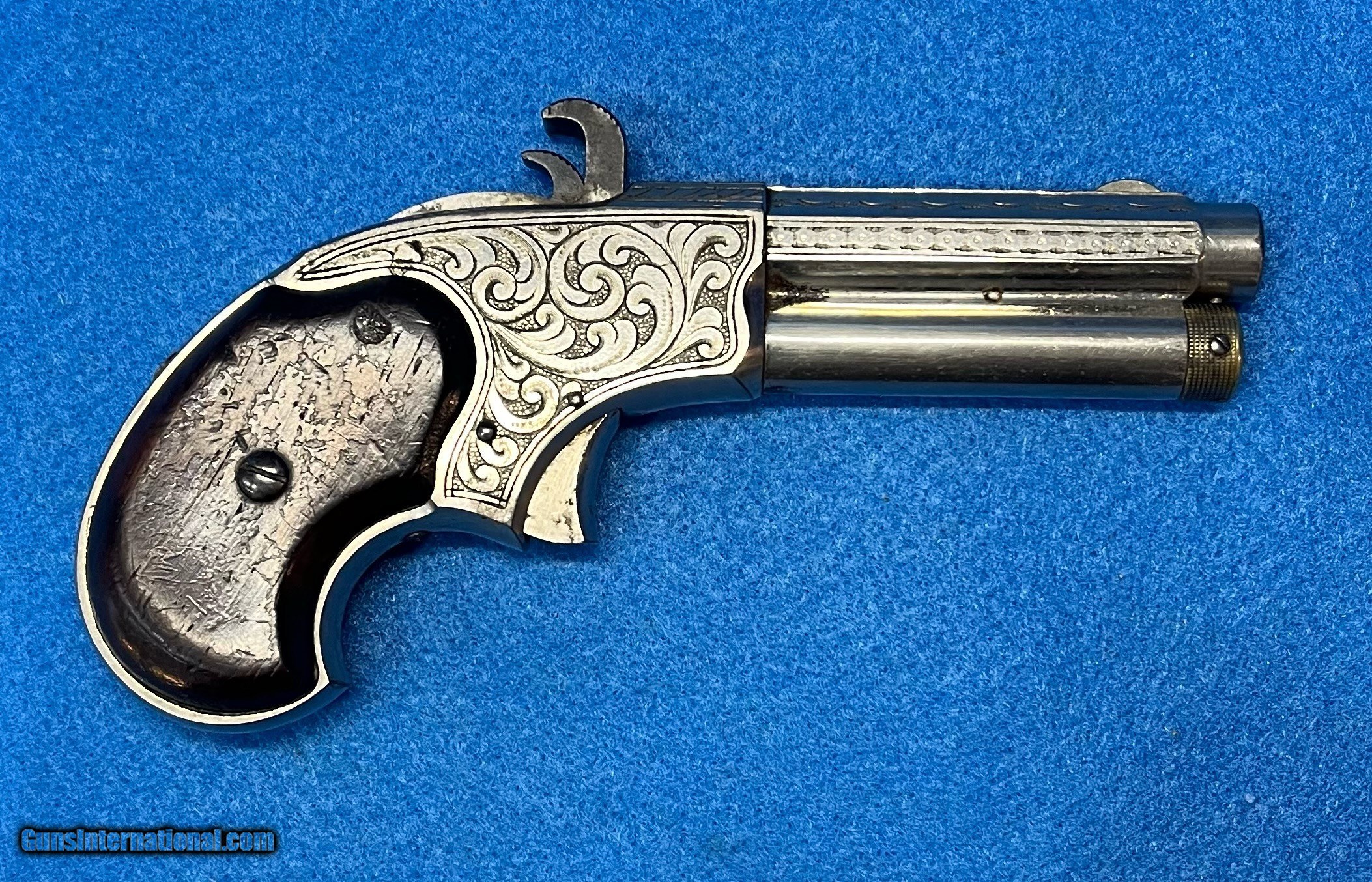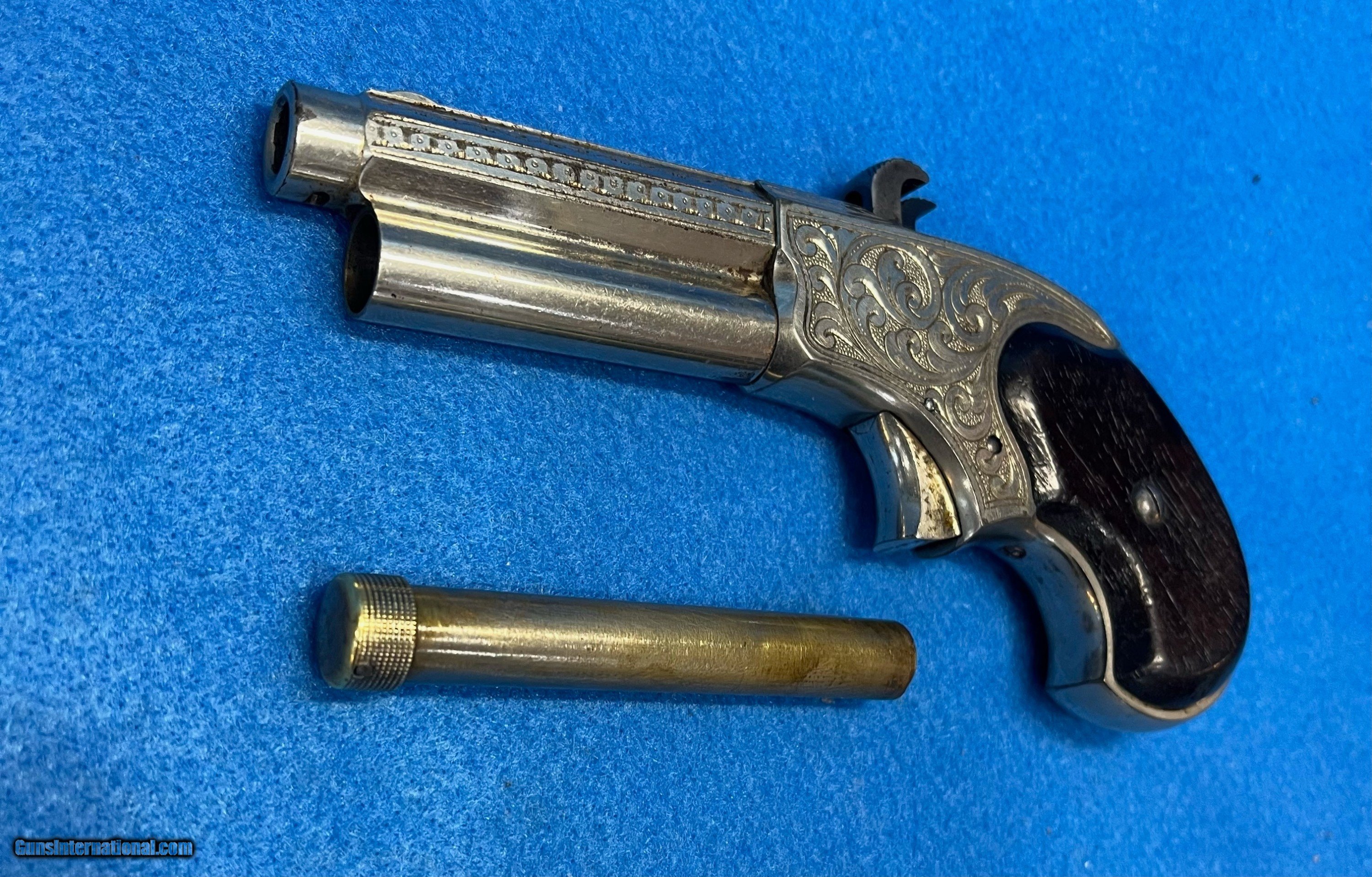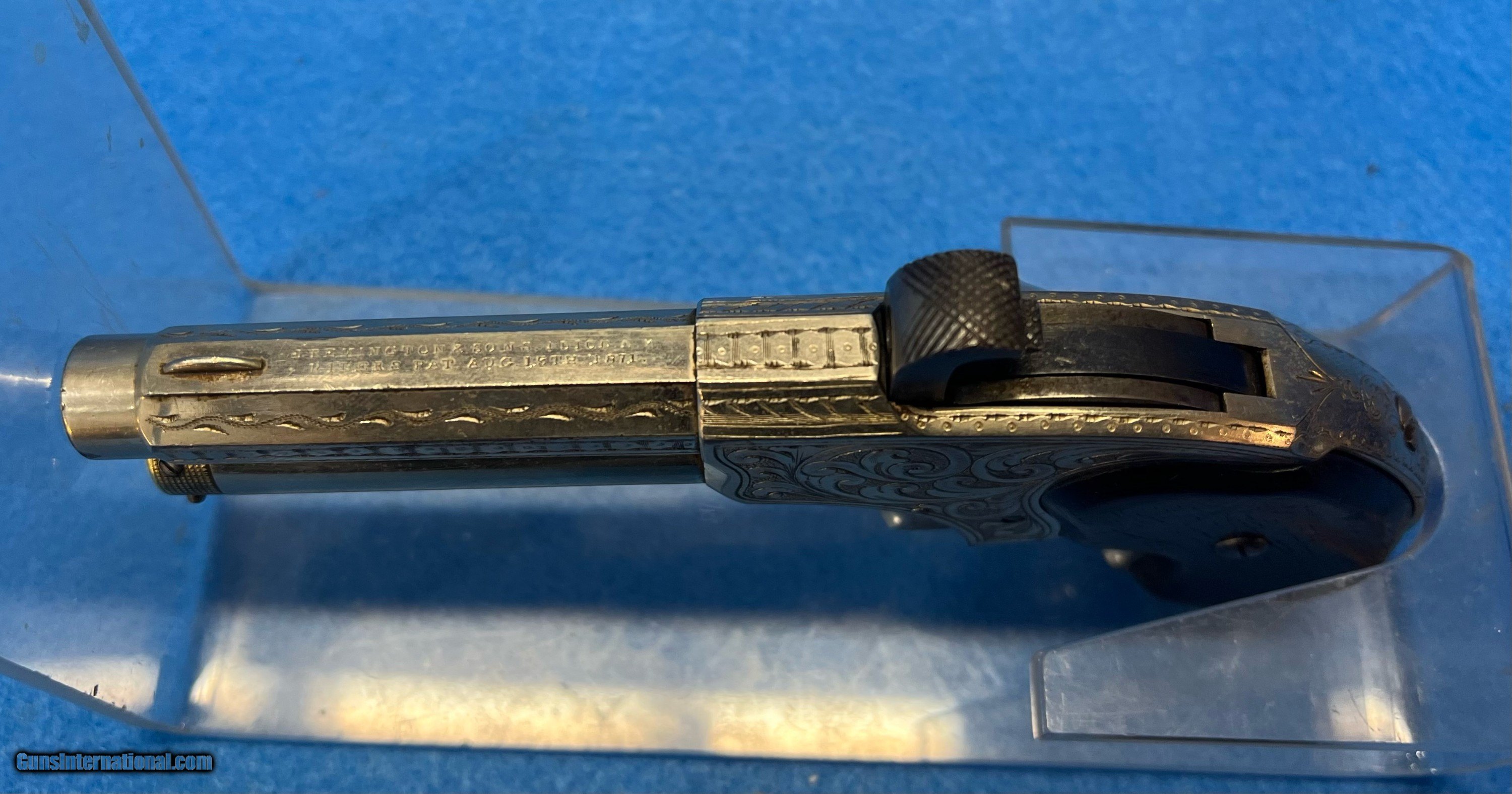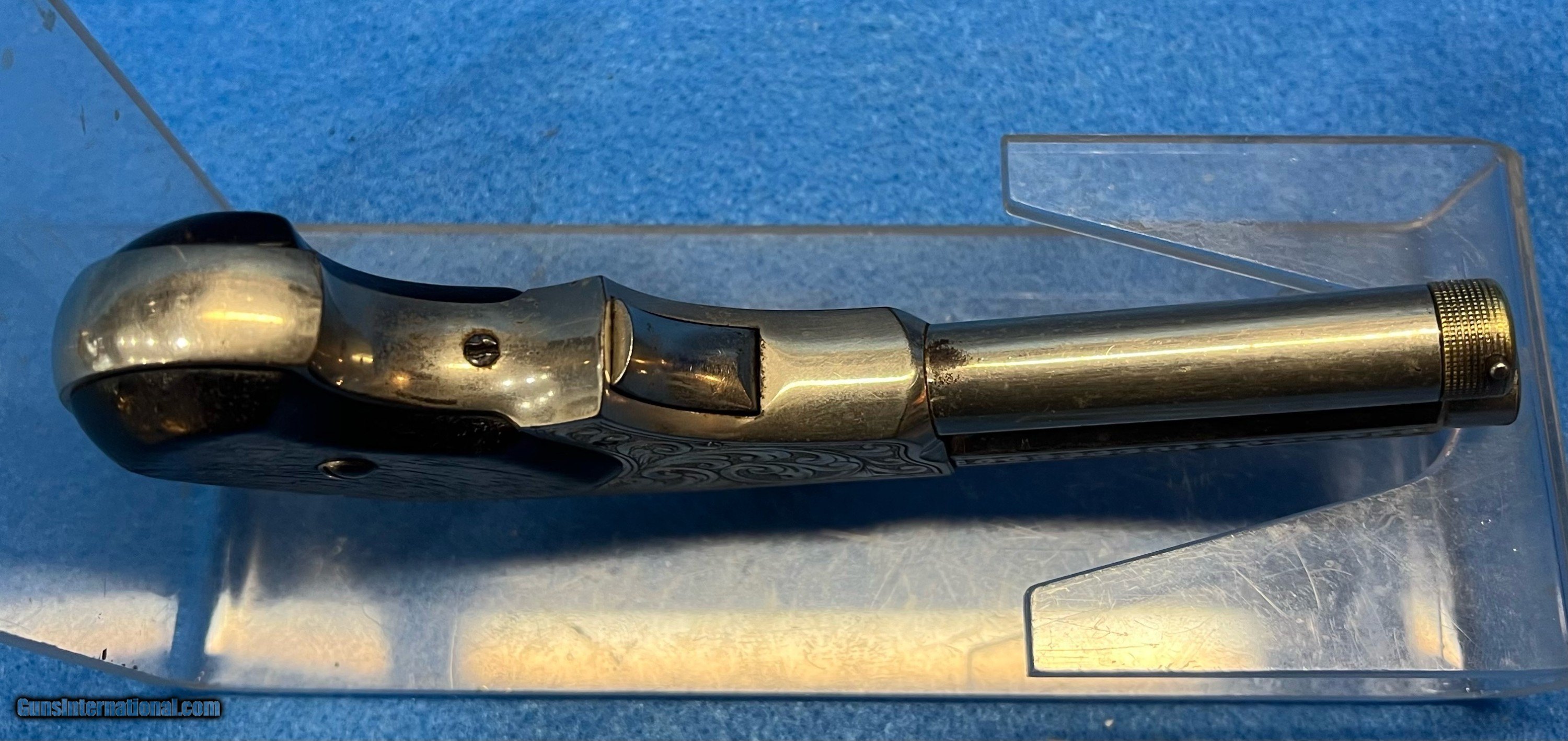 Description: AWESOME REMINGTON RIDER MAGAZINE PISTOL, CAL .32 RIMFIRE EXTRA SHORT. MFG APPROX.1875 .. TOTALLY ENGRAVED AND WITHOUT A BLEMISH ANYWHERE. IT HAS RETAINED 100% OF THE ORIGINAL NICKLE PLATE . THE THE WALNUT GRIPS ARE ALSO PERFECT. THE GUN APPEARS TO FUNCTION PROPERLY. THE INTERIOR SEEMS TO HAVE SEEN VERY LITTLE IF ANY USE. THE BORE IS SUPER VERY BRIGHT WITH SHARP CRISP RIFLING.. THIS "SAFE PRINCESS" WOULD SATISFY THE MOST CRITICAL COLLECTOR . IT IS CERTAINLY A COLLECTION CENTERPIECE CANDIDATE.. INVESTOR PRICED AT.... $2295. *** ***100% OF THE GUN'S PRICE IS SATISFACTION GURANTEED. THERE IS A 3 DAY EXAMINATION PERIOD IN WHICH RETURNS CAN BE MADE, PROVIDED THE WEAPON HASN'T BEEN FIRED SOLD Handgun Caliber: .32 Rimfire |