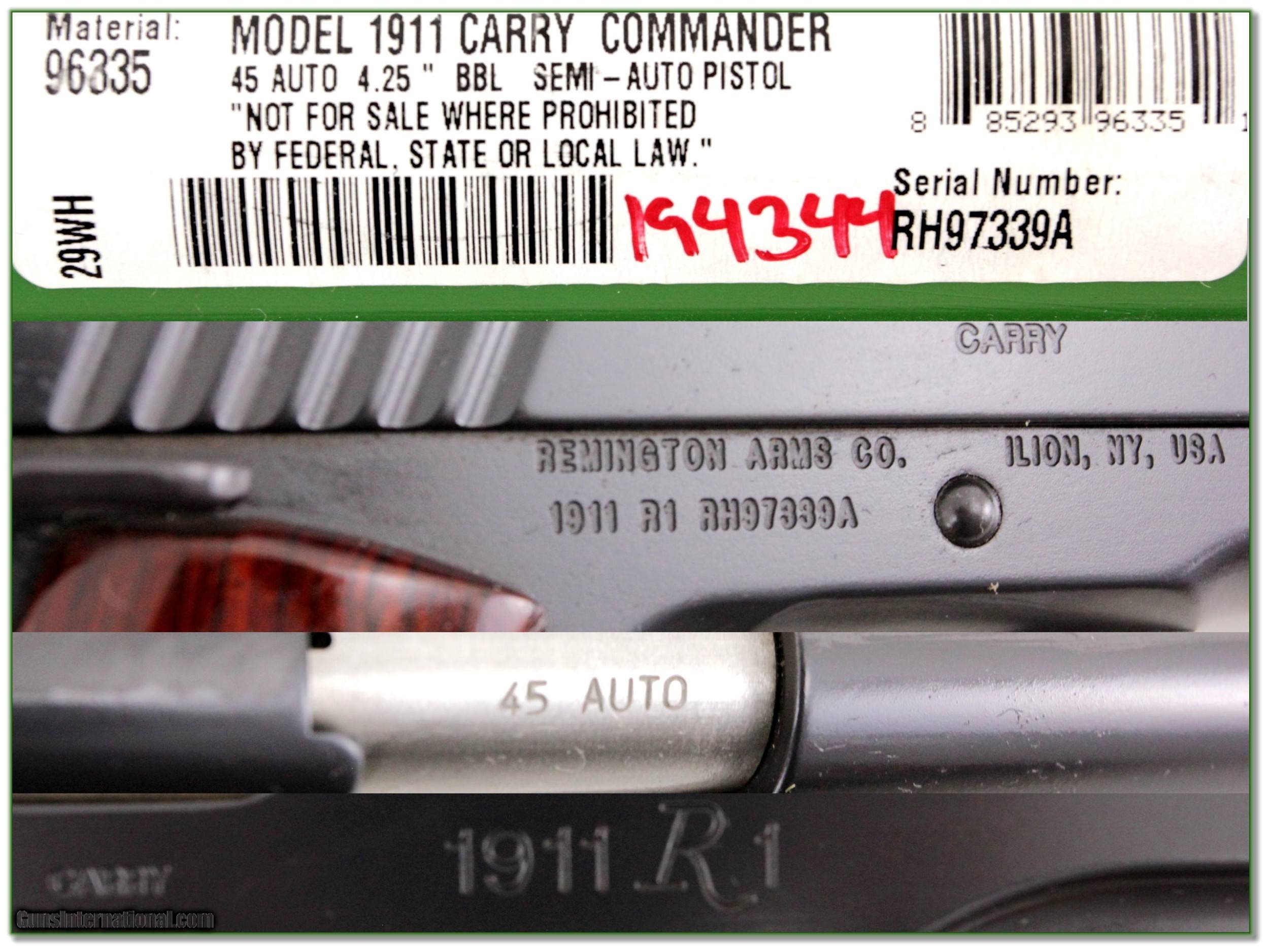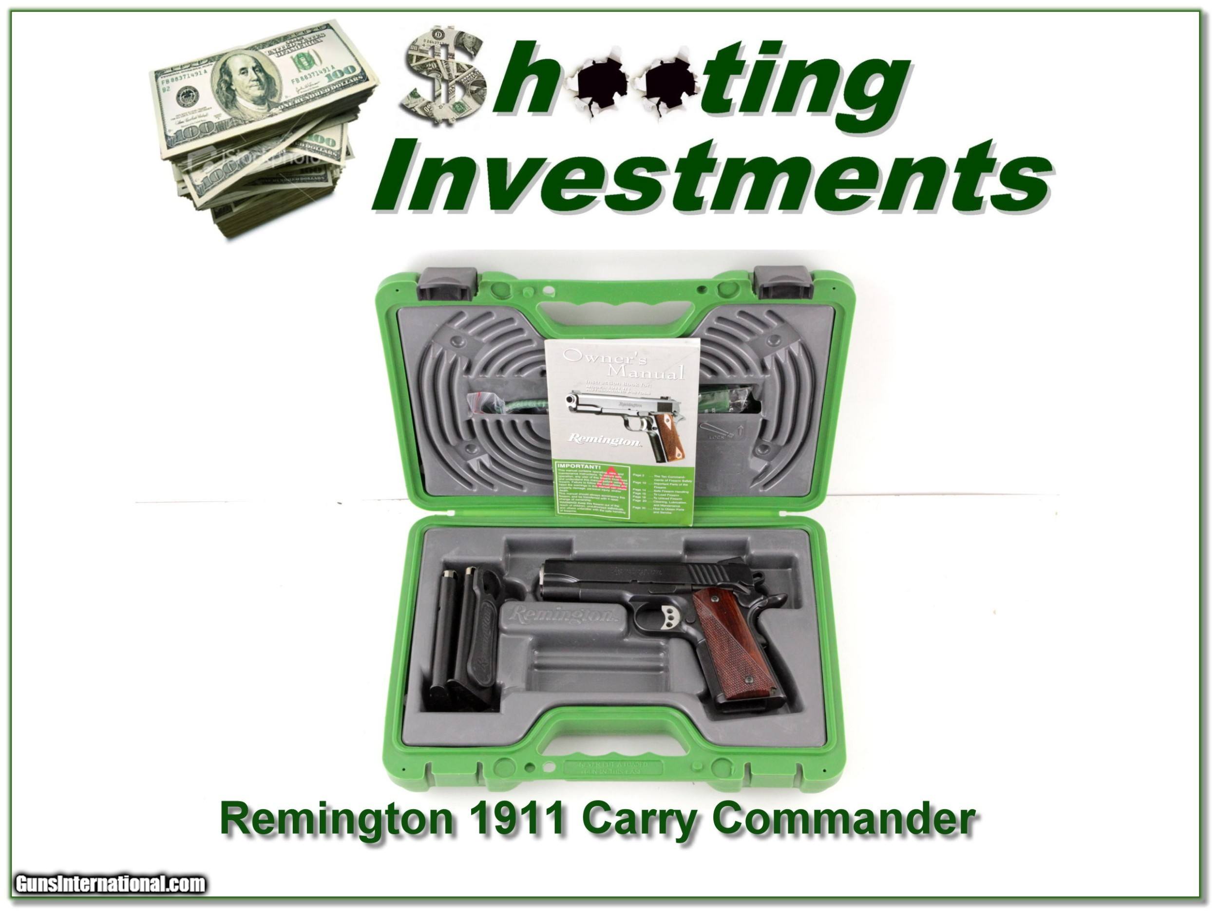 Description: This is a new and unfired Remington 1911 Carry Commander with 4.5in barrel in 45 ACP. It comes as seen in original case with papers and 3 magazines! I am selling this one on consignment and as such lay-a-way can’t be used. It does of course have the standard 3-day inspection. Shipping with insurance is $39. Please email me with any questions or larger pictures. (Consign your quality firearms with Shooting Investments for only 12%! Let me know if you have any you would like to sell!) 20-0001 Payment: Payment is by Money Order, Cashiers Check or Personal Check. I can now also accept Credit Cards (MasterCard, Visa, Discover & American Express) with a 3% convenience fee. PayPal can be used for some items but never for firearms. Shipping: The shipping charge will be listed in each description. It is $39 for most firearms. Some heavy guns or those insured for over $2000 will be higher. Shipments to Alaska and Hawaii are higher because air shipment is required. Most firearms are shipped on Tuesday and Thursday and usually in 5 days of receipt of payment. We package all shipments carefully and insure them. Optics are shipped Priority Mail and most other non-firearm shipments are shipped First Class. Returns: Our return policy is simple. If for any reason you are not pleased with your purchase, you may return your item for a full refund of purchase price. Ammunition cannot be returned. It is important to us that you are happy. Guns cannot be fired or dissembled before returning them and they must be returned in the same condition as received. Notification of a return must occur with-in 3 days of receipt at your dealer. Shipping, convenience and dealer fees are not refundable and are the responsibility of the buyer. Lay-a-way: If needed, we offer a 60 day lay-a-way option on most firearms. It is 1/3 now, 1/3 in 30 days and 1/3 in 60 days. Lay-a-way firearm sales are final and if not completed the first payment cannot be returned. Consigning your firearms with Shooting Investments: We will help you get top dollar for your firearms. While most local guns shops charge 20% or more, our fee is only 12% with a minimum of $75. At your local gun shop it might take months to sell. Selling on-line provides instant access to thousands of interested buyers. You won’t find any other on-line dealer willing to sell your firearms for only 12% or listing every gun on 3 separate s. Selling through an House typically costs the seller 15% and the buyer an addition 15% (so 30%) and you have to wait several months to sell and longer to receive funds. If properly priced, we will sell your firearms in a few weeks. Send us an email or give us a call and we’ll explain how easy it is for you to get top dollar. Trading: Trading for use is really just buying your gun to re-sell. If you have a gun you want to trade, please email a picture and we will let you know what we can give or it. You will always get more if we sell it for you on consignment. Help for California Buyers: We are happy to ship to California. It is the buyer’s responsibility to make sure any item you buy is legal in your state. We are also happy to help with your purchase of a firearm from someone other than us. If you see a gun you would like to buy but the seller can’t or won’t ship to California they can ship to use and we’ll then ship it to your California dealer. The cost for this service is only $30 + shipping. Let us know if we can help! SOLD |