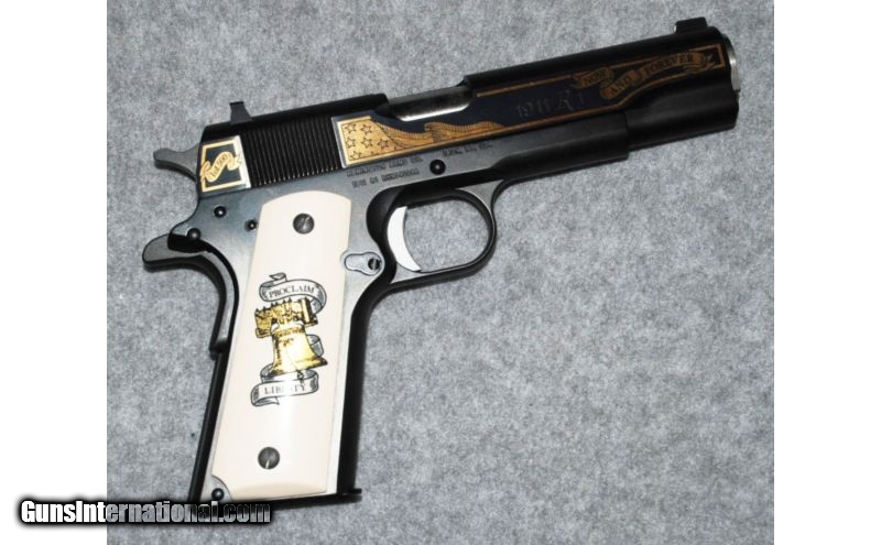 Description: ANIB Liberty Bell edition with gold inlay 1 of 500. SOLD Caliber Info: .45 AUTO Metal Condition: ANIB Wood Condition: ANIB Bore Condition: ANIB Barrels: 5 Triggers: Match grade grooved trigger. Stock: Grips are fake Ivory Weight: 3 1/2 Lbs. Sights: Three dot square notch system. Extras: Comes with factory case Item Location: Lacey, WA |