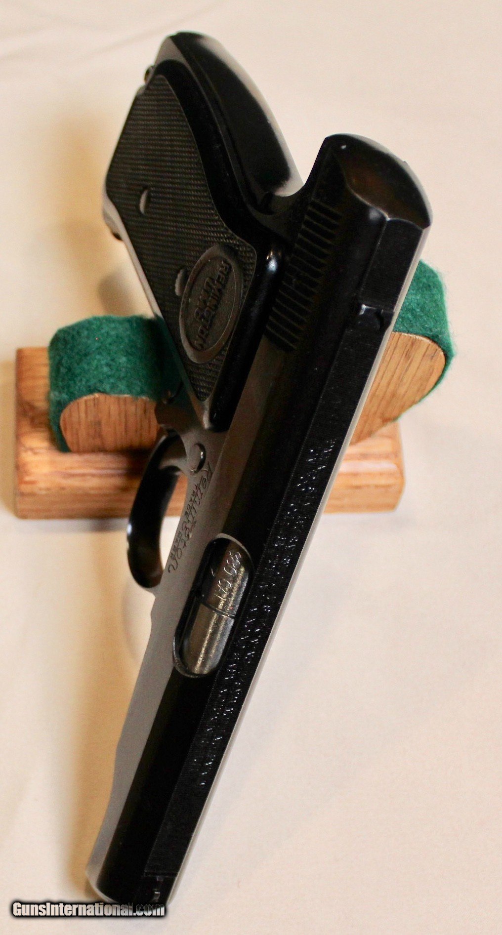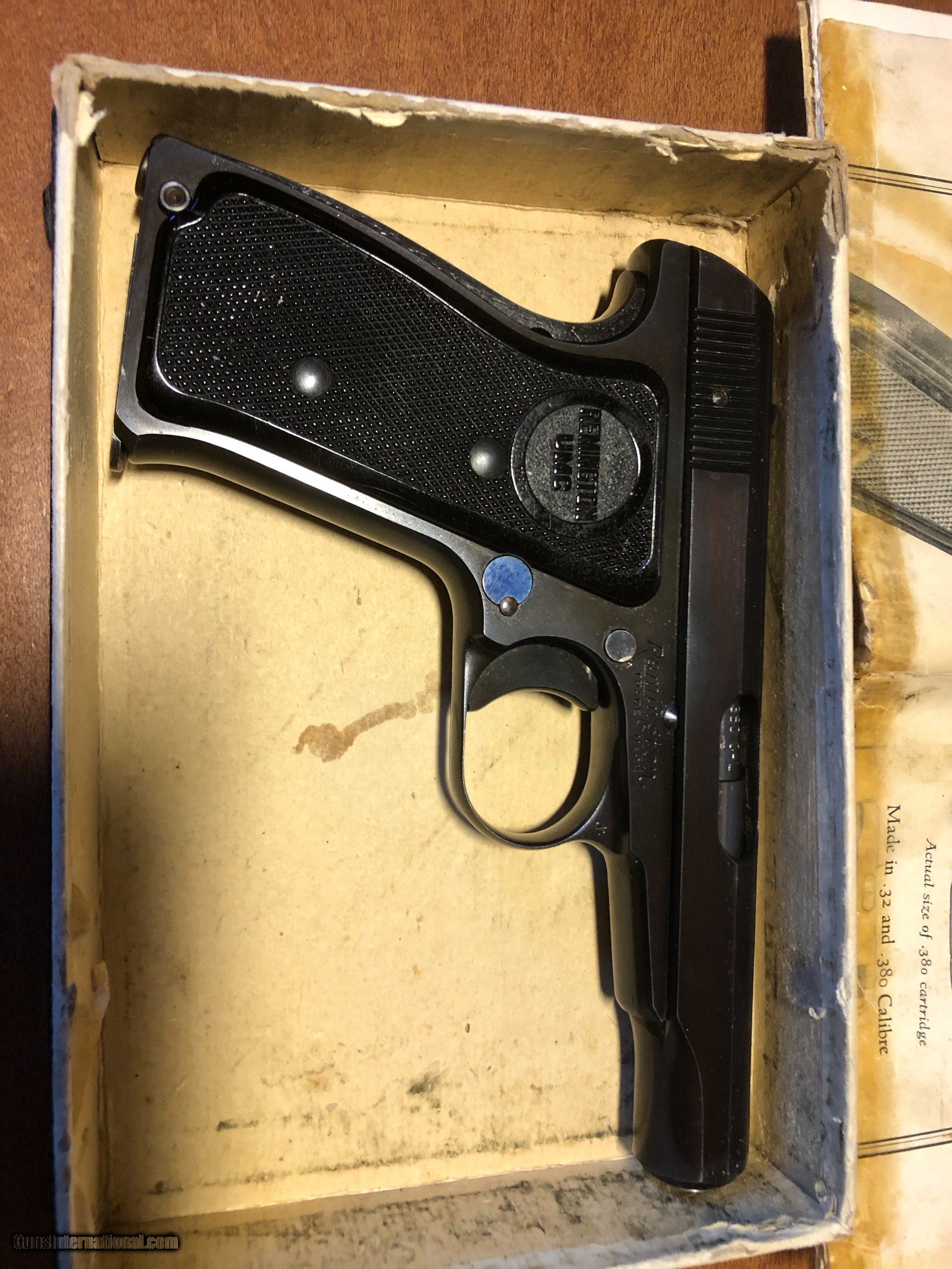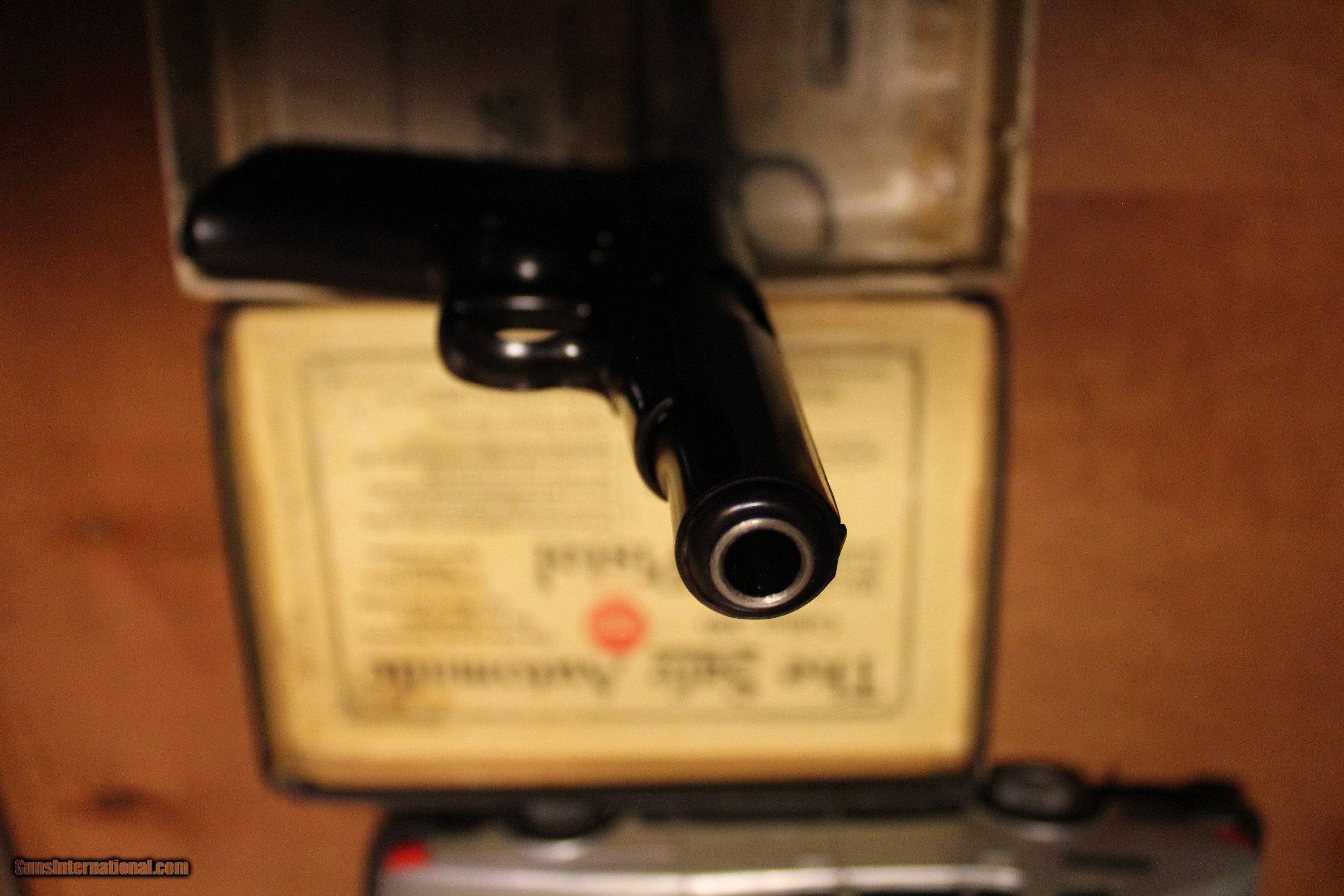 Description: Remington Model 51 380 Caliber in it's original box with factory paper work. Gun is 99% plus condition. Exceptional late model with the sawtooth serations in the slide. Serial range: 59,xxx. Box is numbered to the gun. About as good as it can get! Virtually all nitre blue on appropriate parts. Price: $2750.00 - Plus $45.00 shipping to lower 48. AK & HI shipping: Next day air $125.00. SOLD Curio/Relic: Yes Handgun Caliber: .38 Auto (.38 ACP) |