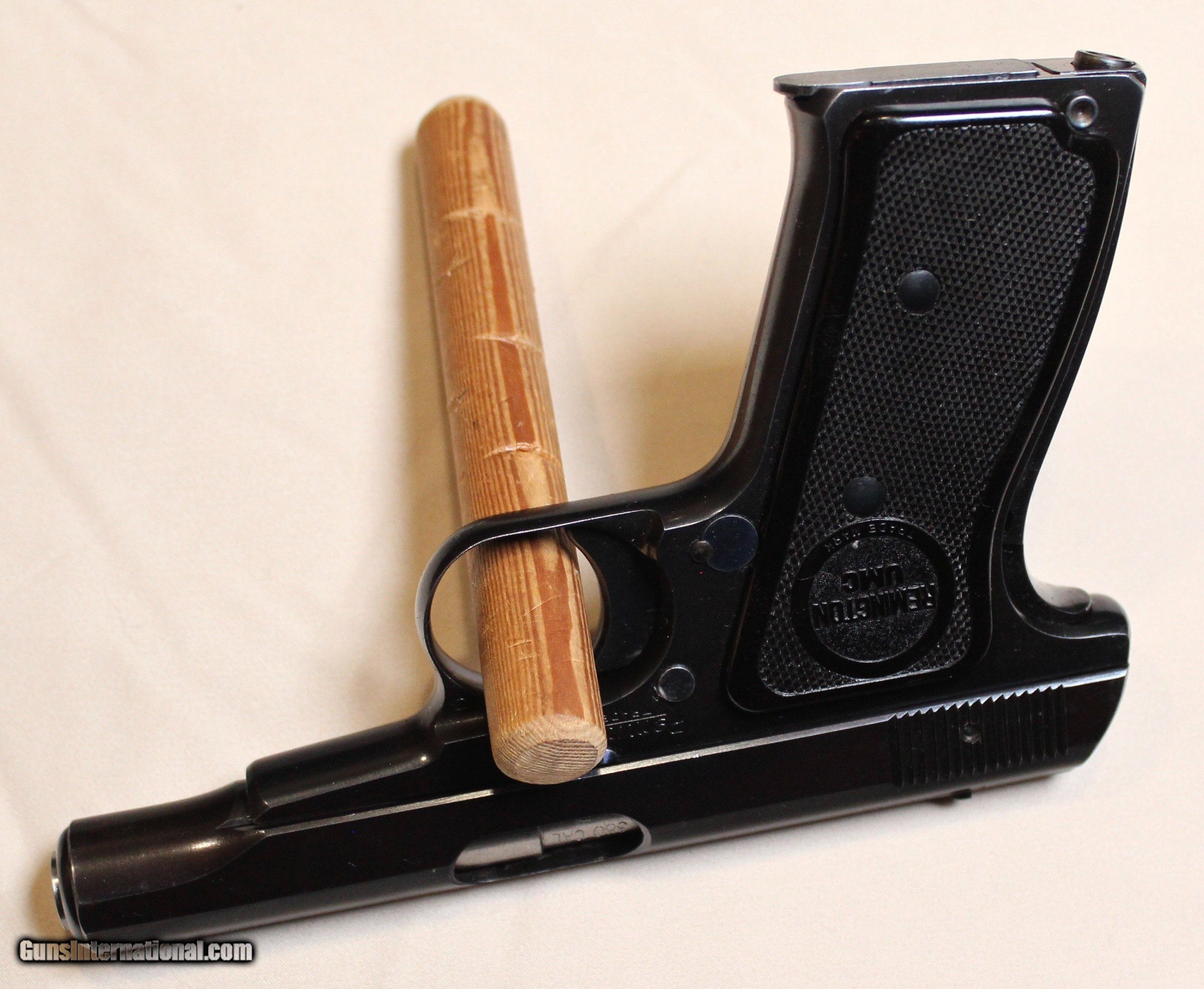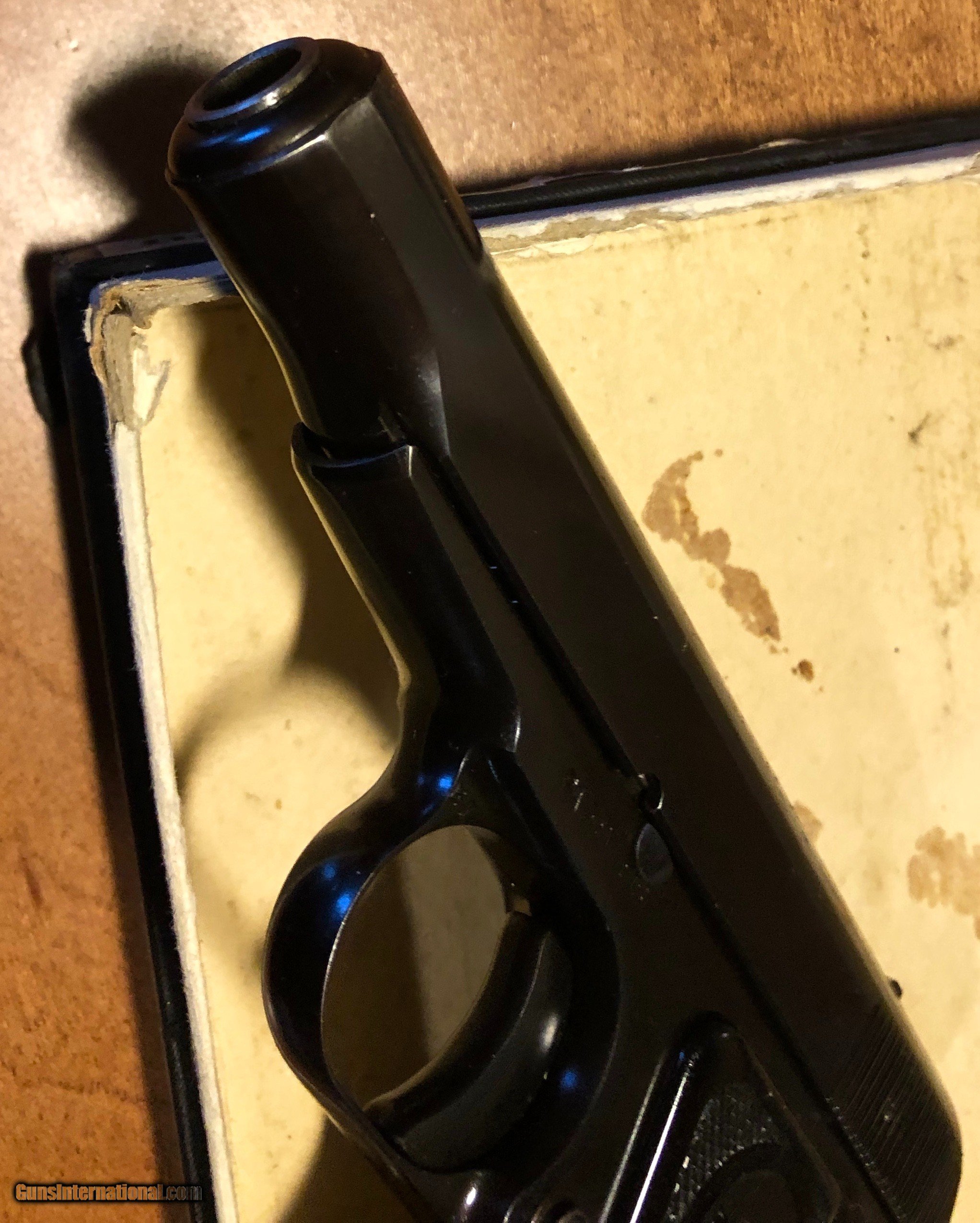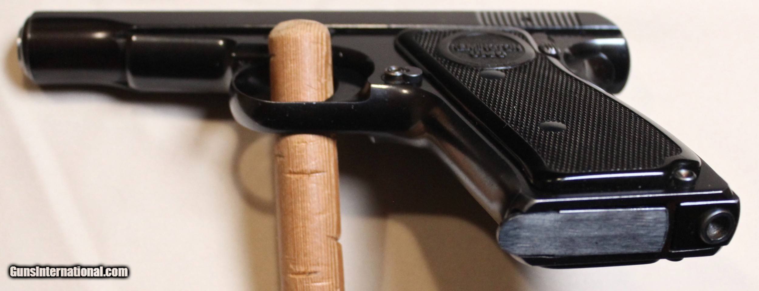 Description: Remington Model 51 380 Caliber in it's original box with factory paper work. Gun is 99% plus condition. Exceptional late model with the sawtooth serations in the slide. Serial range: 59,xxx. Box is numbered to the gun. About as good as it can get! Virtually all nitre blue on appropriate parts. Price: $2750.00 - Plus $45.00 shipping to lower 48. AK & HI shipping: Next day air $125.00. SOLD Curio/Relic: Yes Handgun Caliber: .38 Auto (.38 ACP) |