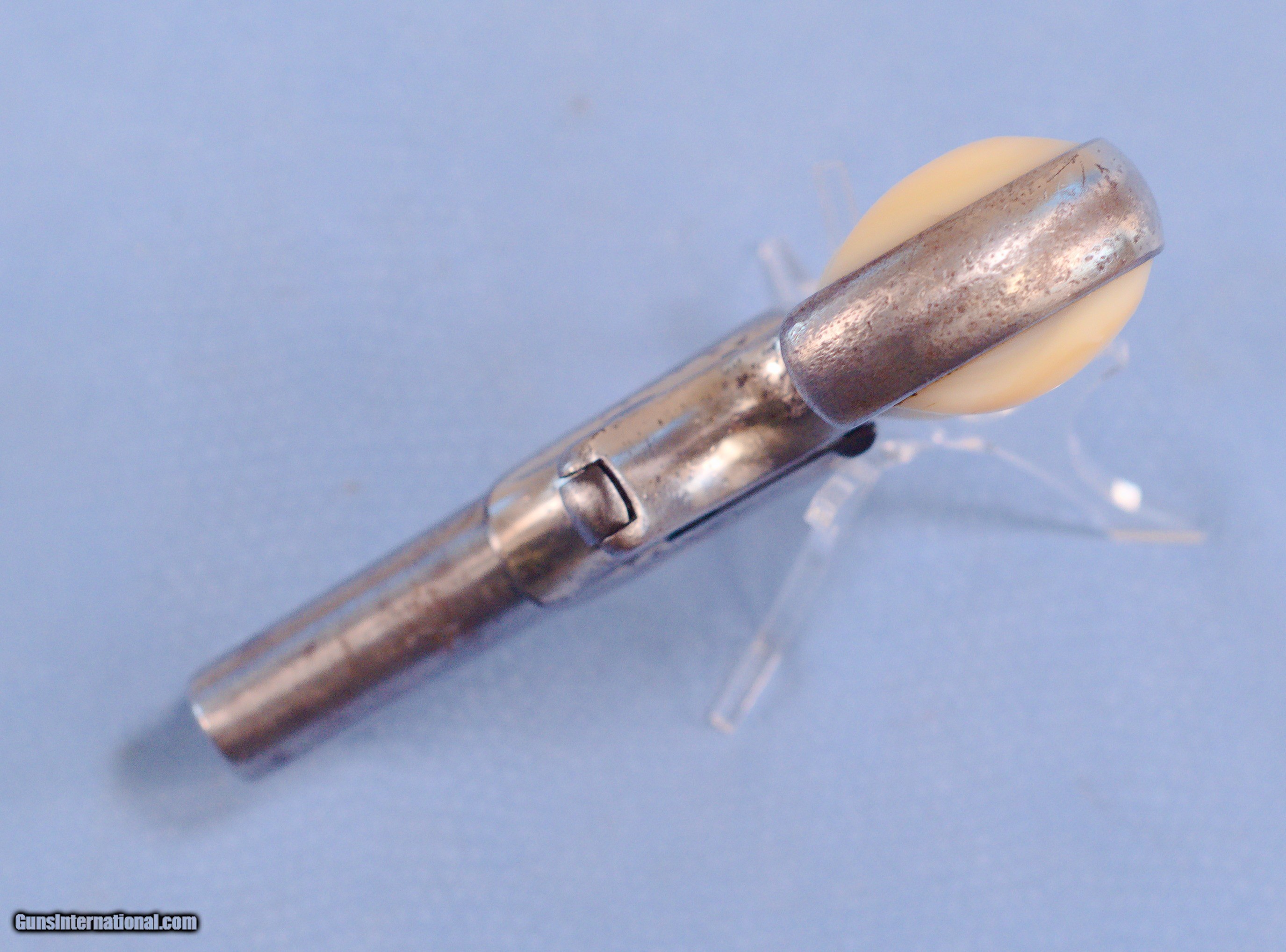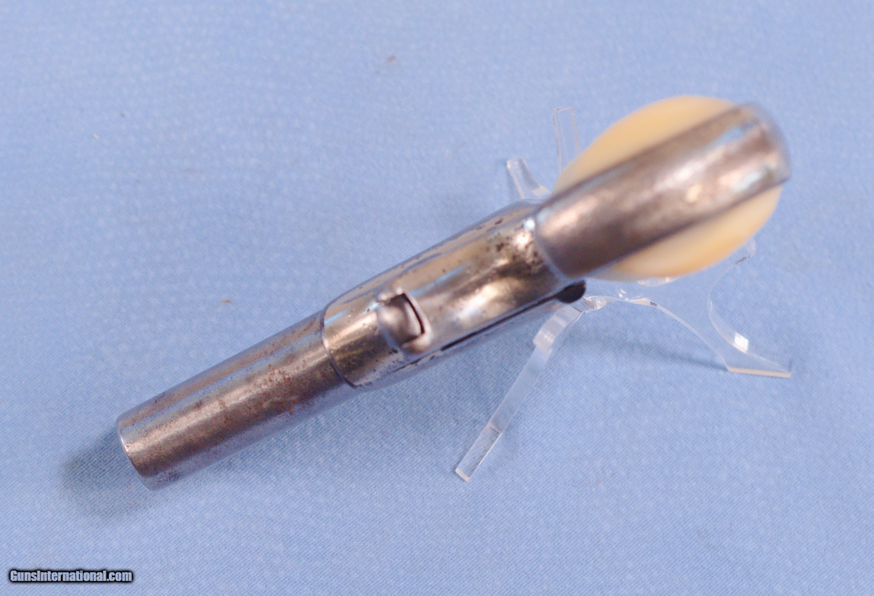 Description: For consideration is a Remington Model 95 derringer in .41 caliber rimfire. The Remington Model 95 is a double-barrel pocket pistol commonly recognized as a Derringer. The design was little changed during a production run of nearly 70 years through several financial reorganizations of the manufacturer causing repeating serial number sequences. Guns were offered with engraving or plain blued or nickel-plated finish with grips of metal, walnut, rosewood, hard rubber, ivory or pearl. This example is in good overall condition exhibiting some finish loss and wear. Everything operates as it should. There is a little play between the frame and the barrel but nothing serious. The mother of pearl grips are in very good condition. Two rounds of .41 rimfire included. This would be a great addition to a collection and an excellent conversation piece. PRICE: $300.00 Plus Shipping We are Antique & Modern Firearms in Lexington, KY, a dealer of fine firearms since 1974. To Inquire please call PH. 859-276-1419 We Buy, Sell, and Trade Firearms & Knives. Have an Individual Firearm, Firearms Collection, or Firearms Estate to sell, let us know, and we can buy or consignment sell it for you. NOTE: No additional fee for a Credit Card payment SOLD Handgun Caliber: .41 Rimfire Manufacturer: Remington Model: 95 Serial Number: 853 Barrel Length: 3 inches Condition: Good Metal Condition: Good Bore Condition: Good with good rifling Action: Single Action Sights: Blade front and v notch rear Item Location: Kentucky |