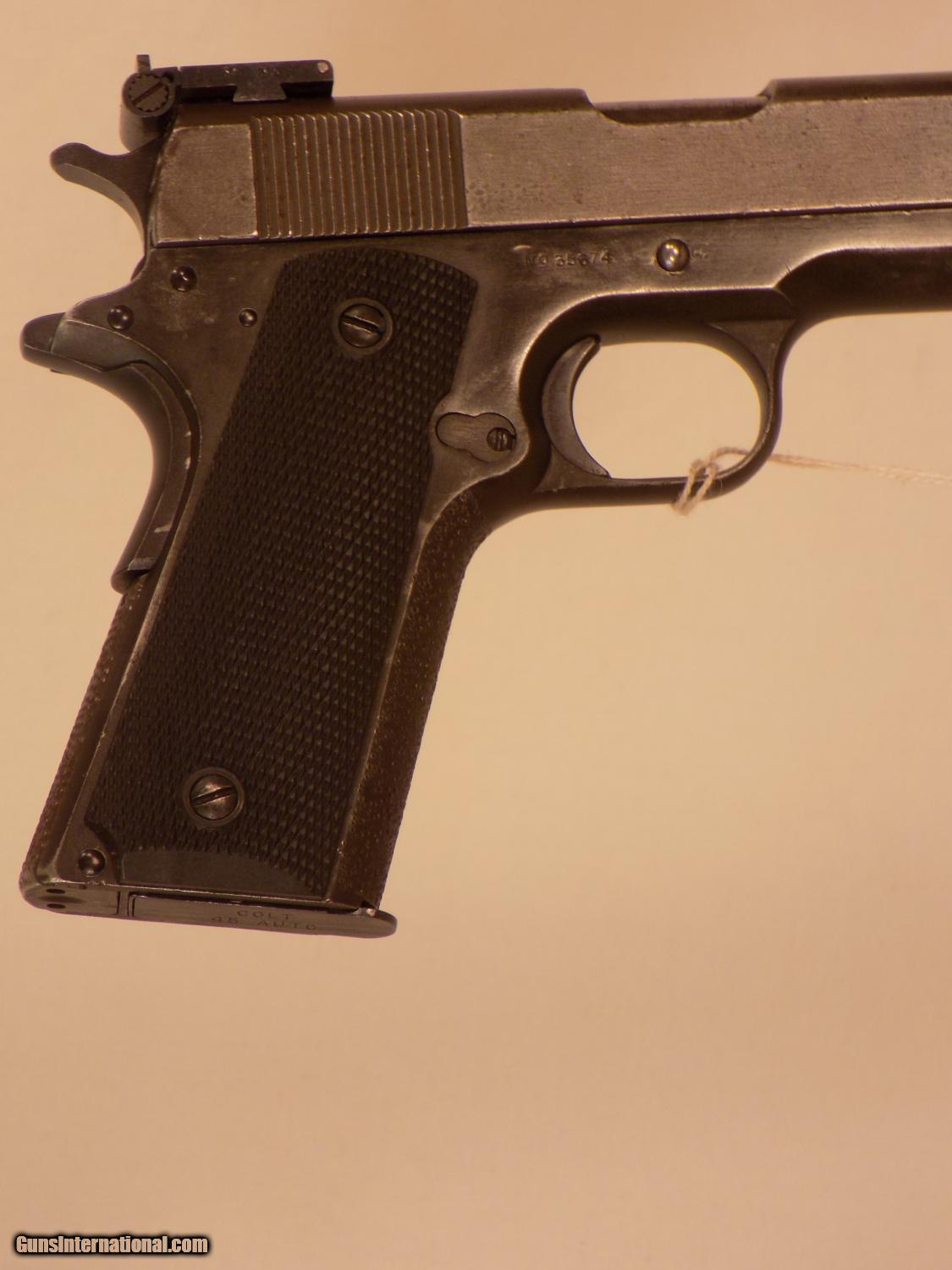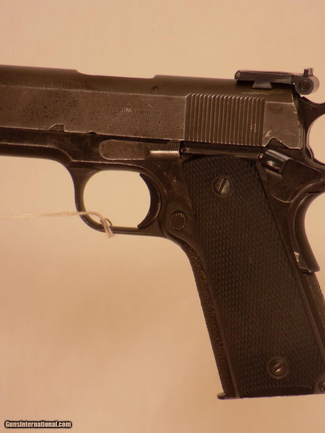 Description: REM. RAND INC., 45 auto, SN 356XX, Bo-Mar adj. rear target sight, slide is parkerized, blued frame, strippled for better grip, exc. black checkered plastic grips, left side of receiver marked "Rem. Rand Inc. Syracuse NY USA", exc. bore, 90% finish. FFL Required. SOLD Curio/Relic: Yes |