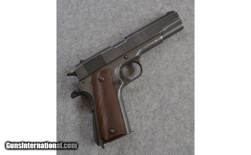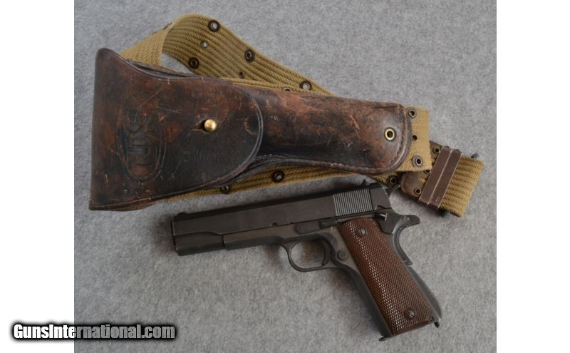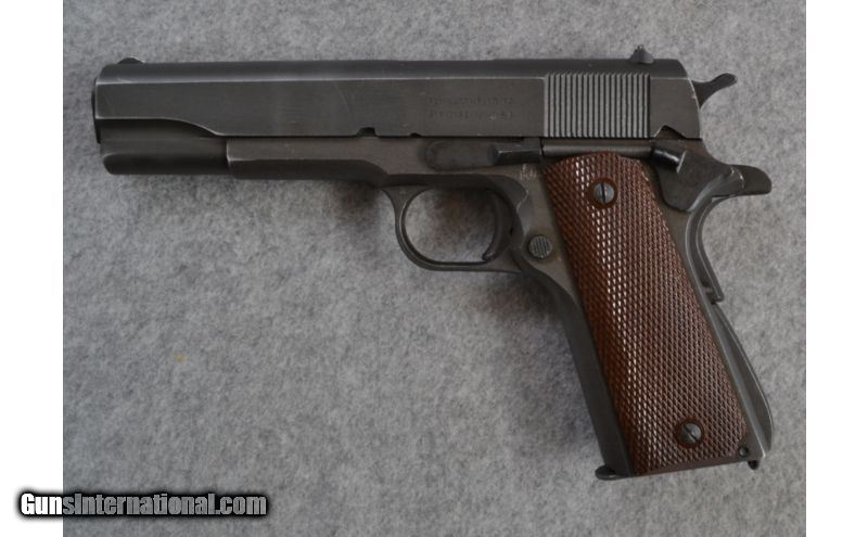 Description: Right side of frame stamped " UNITED STATES PROPERTY M1911 A1 U.S. ARMY". Left side of slide is stamped "REMINGTON RAND INC. SYRACUSE, N.Y. U.S.A.". Stamp below slide stop is "FJA". Note that no caliber is stamped on barrel or firearm, but believed to be .45 ACP. SOLD Manufacturer: S/N 2164496 Caliber Info: NONE SHOWN Metal Condition: Average condition for age and use with some handling marks. Shows bluing wear, but no rust or pitting. Wood Condition: Grips are in good condition. Bore Condition: Very Good Condition. Bright and shiny. Good rifling. No pitting or rust noted. Barrels: 5 Inches. Weight: 2 Lbs 6 Oz Sights: Fixed sights. Extras: Includes 1 magazine, holster and belt. Item Location: Lone Tree, CO |