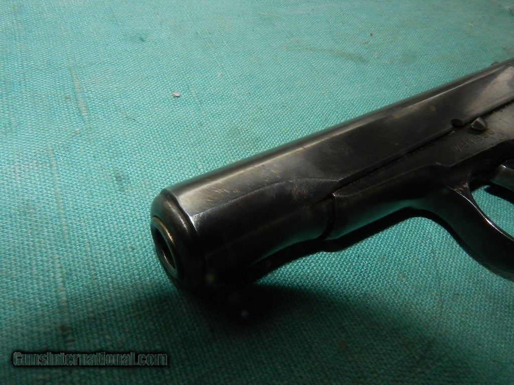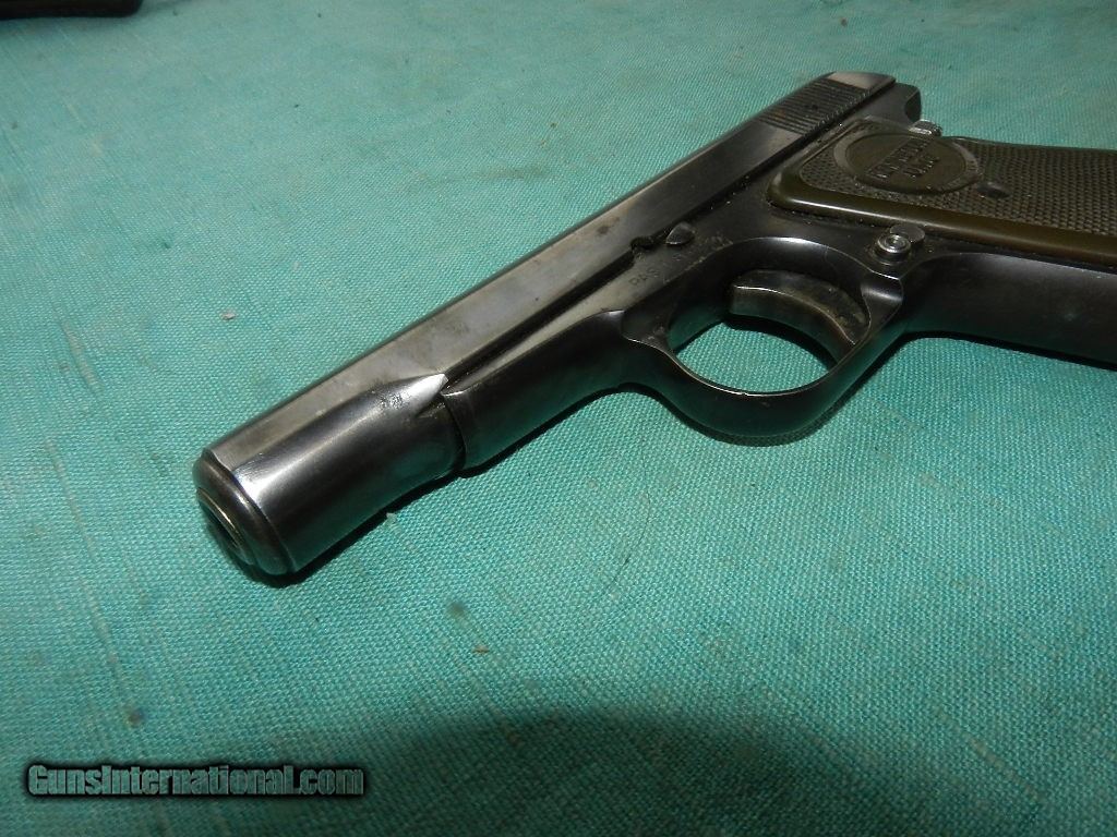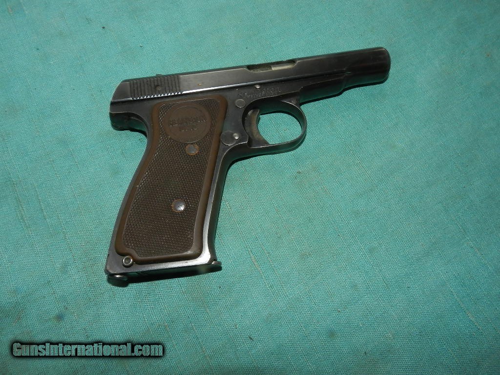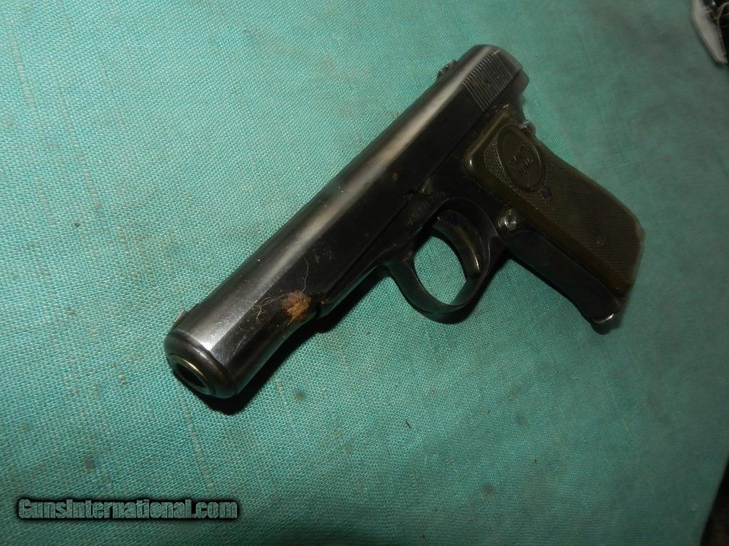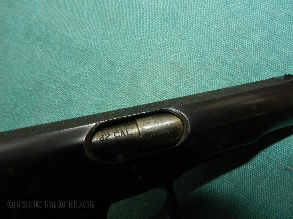 Description: This handgun retains about 85+% of its metal finish.but fadingalong the slide on the left side from being carried in a holster. The metal surfaces have some rubbing, especially at the edges, perhaps from holster use. The remaining blue is dark with nicely planed surfaces, rounded corners and the correct 15 groove count on the slide. Some nice plum patina of color case hardening, is settling on the fore strap and trigger from indexing. The markings are crisp. Overall, this handgun rates in about very good .Markings The right side of frame : “THE REMINGTON Trade Mark , a correct marking for serial number PA91890 The left of the frame has the serial number, an anchor is found on the right side of the trigger guard, and the left trigger guard has a circle and a T. Overall the 3 1/2" barrel has a very clean , shiny, rifled bore.The black hard rubber grios are very good with no issues . Has one factory mag marked .32 SOLD Curio/Relic: Yes |