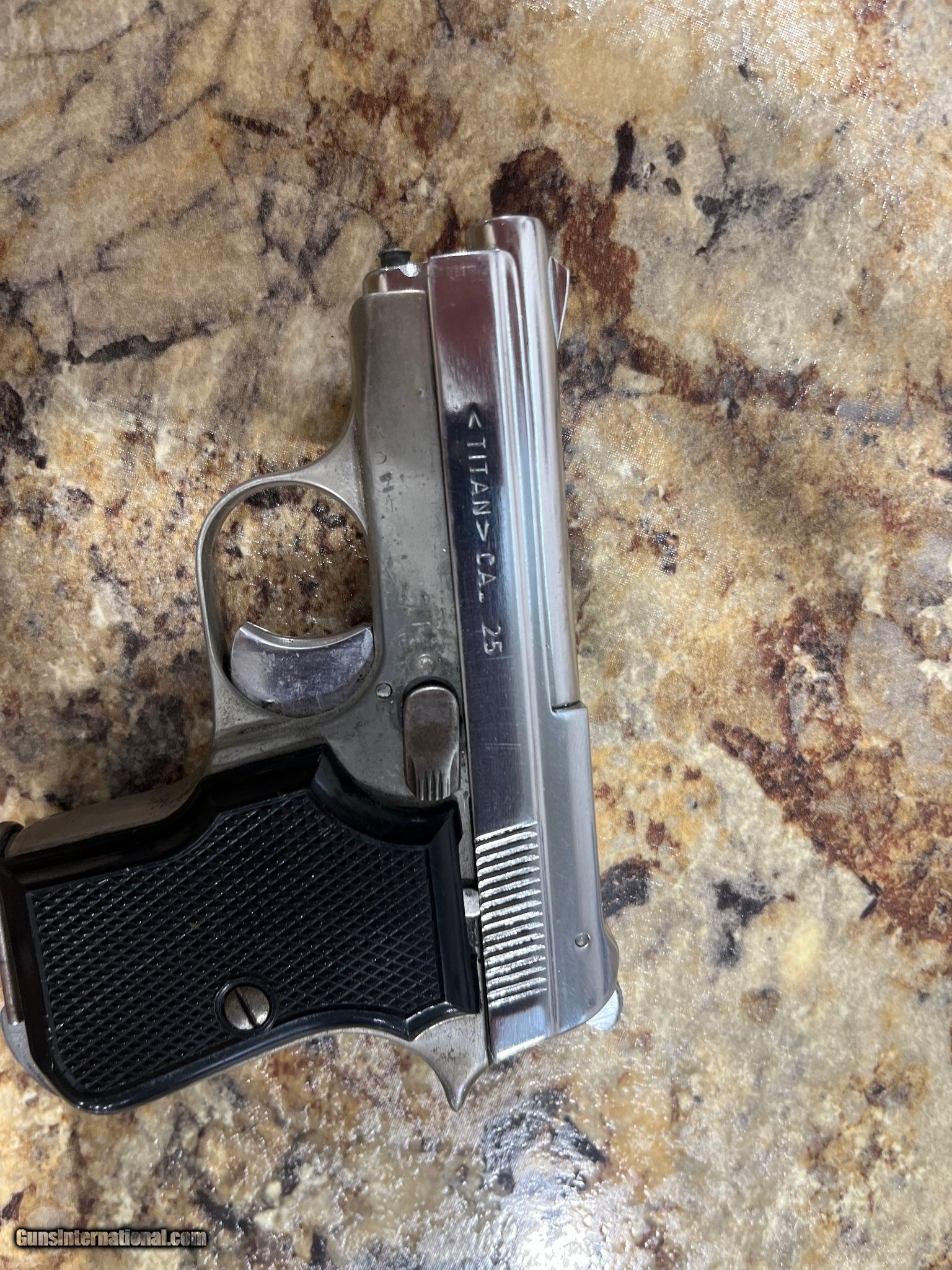 Description: Guns Listing ID: 599956 Used 25 acp pistol Manufacturer: TITAN ARMS Model: Titan Caliber Info: .25 ACP Condition: Used - Non-Certified Barrels: 2.5" BARREL Action: SEMI AUTOMATIC Finish: nickel Price: $125.99 Contact Seller |