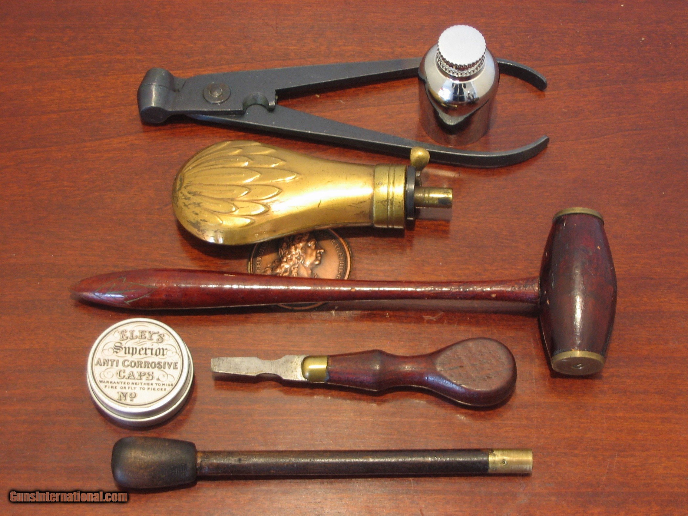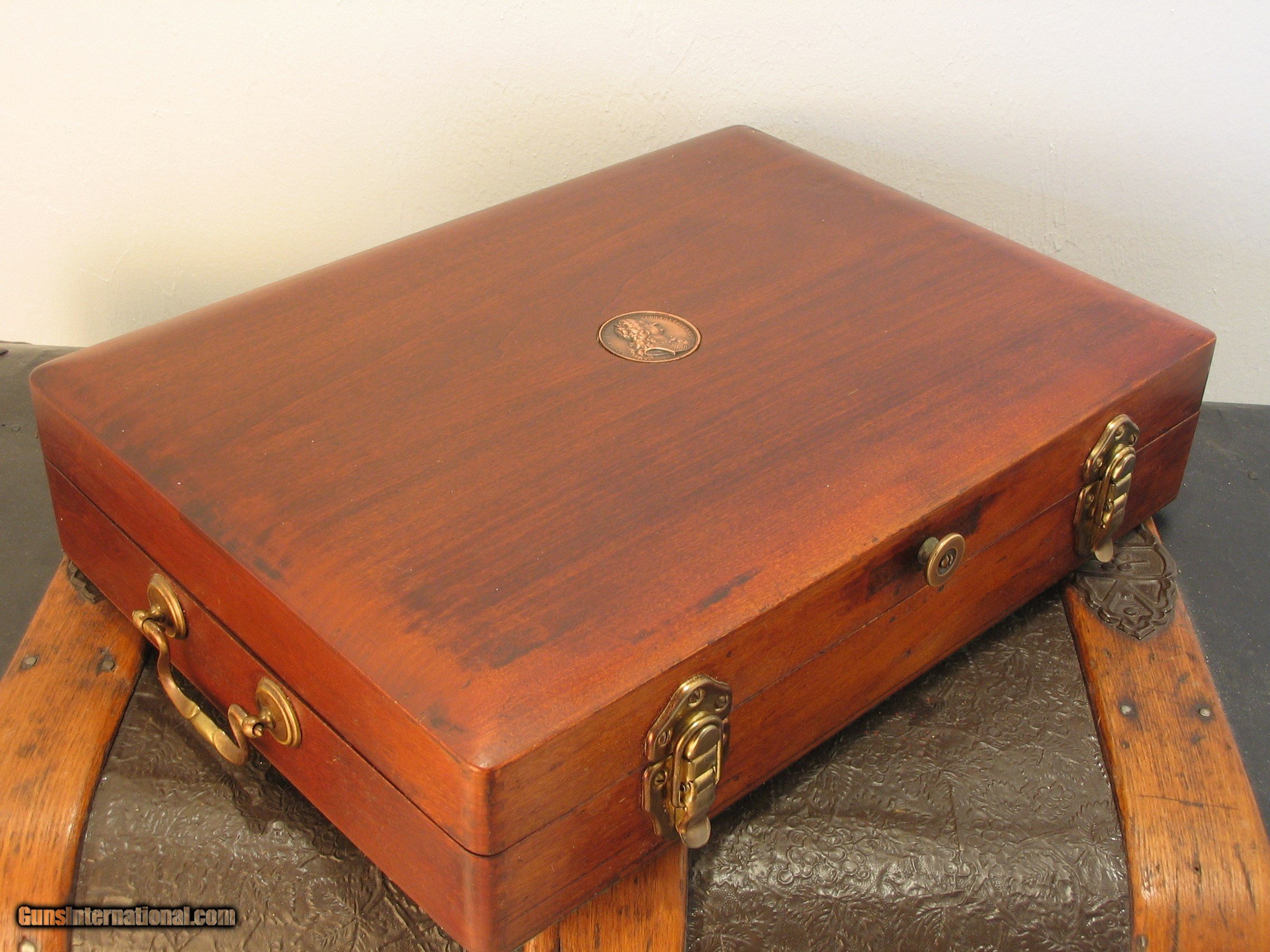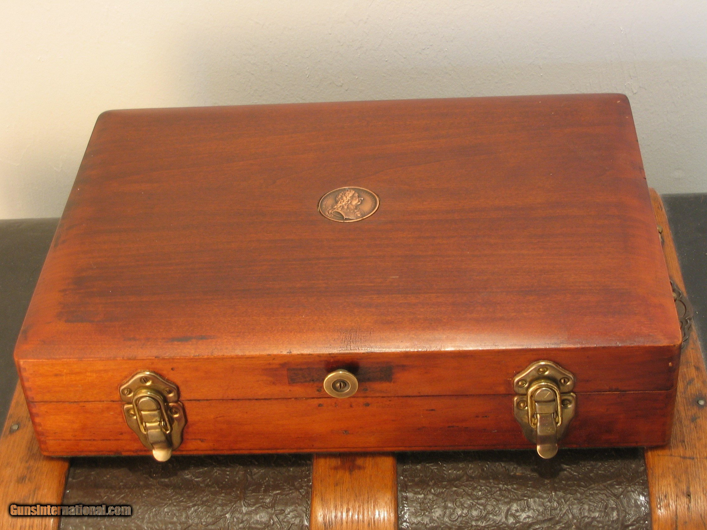 Description: This is an Antique Recreated Percussion .45 cal. English Gentlemens Black Powder Muzzleloader Cap & Ball Travel Coat Pocket Cased Pistol Set with Accessories. The pistols were Carefully Hand Built from CVA Colonial pistol kits. The pistols have 6" Browed Barrels, Dark Walnut stained stocks and are 11.5" long OA. The stock has been sanded and stained with three coats of tong oil. They have not been fired. They are housed in a Mahogany 16"x 11.5"x 3.5" custom made case with a brown velvet interior. The cased set is in excellent replica Antique condition. It will be shipped to you in the U. S. only after your payment clears using PayPal (Perfered) or postal mail order. It can not be shipped to New Jersey or Canada. SOLD |