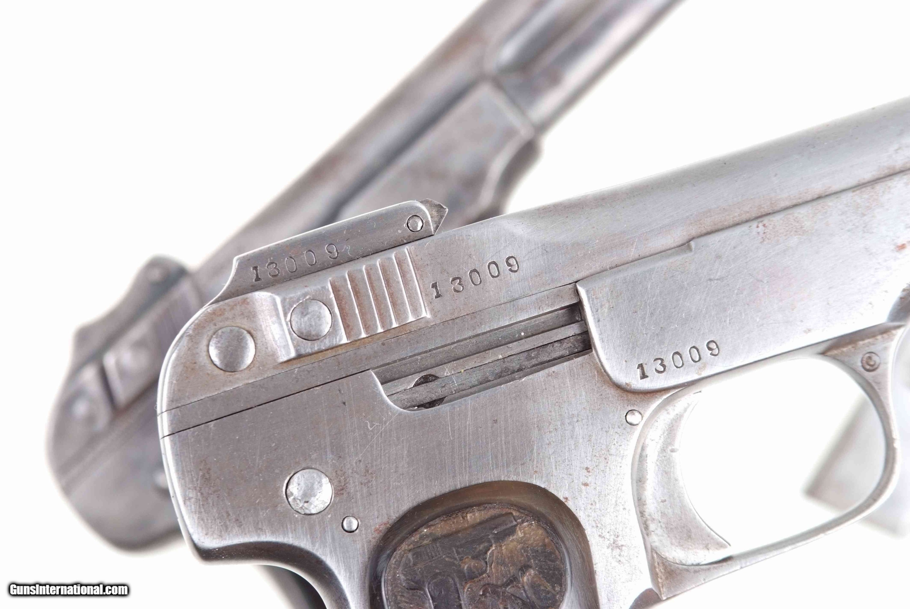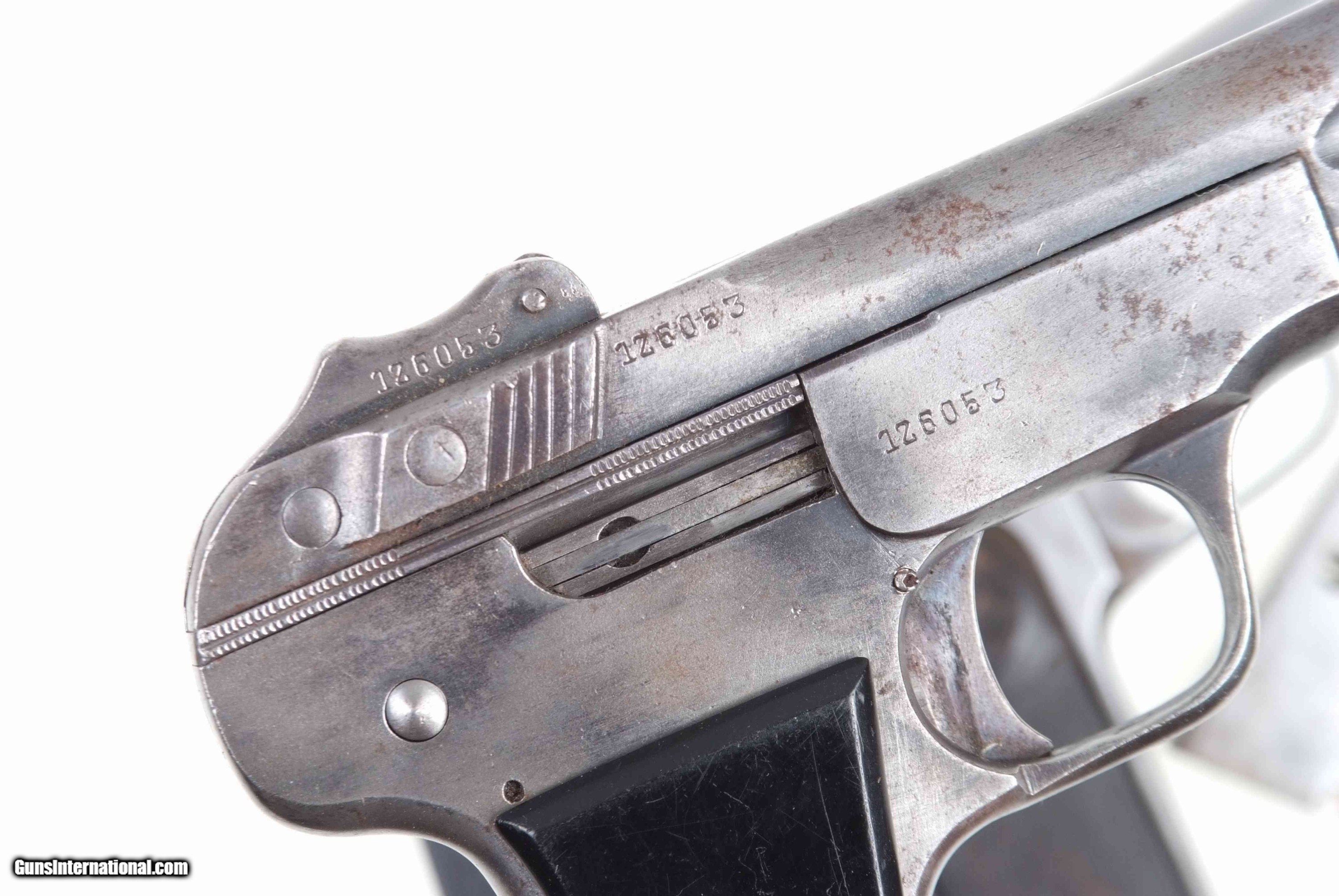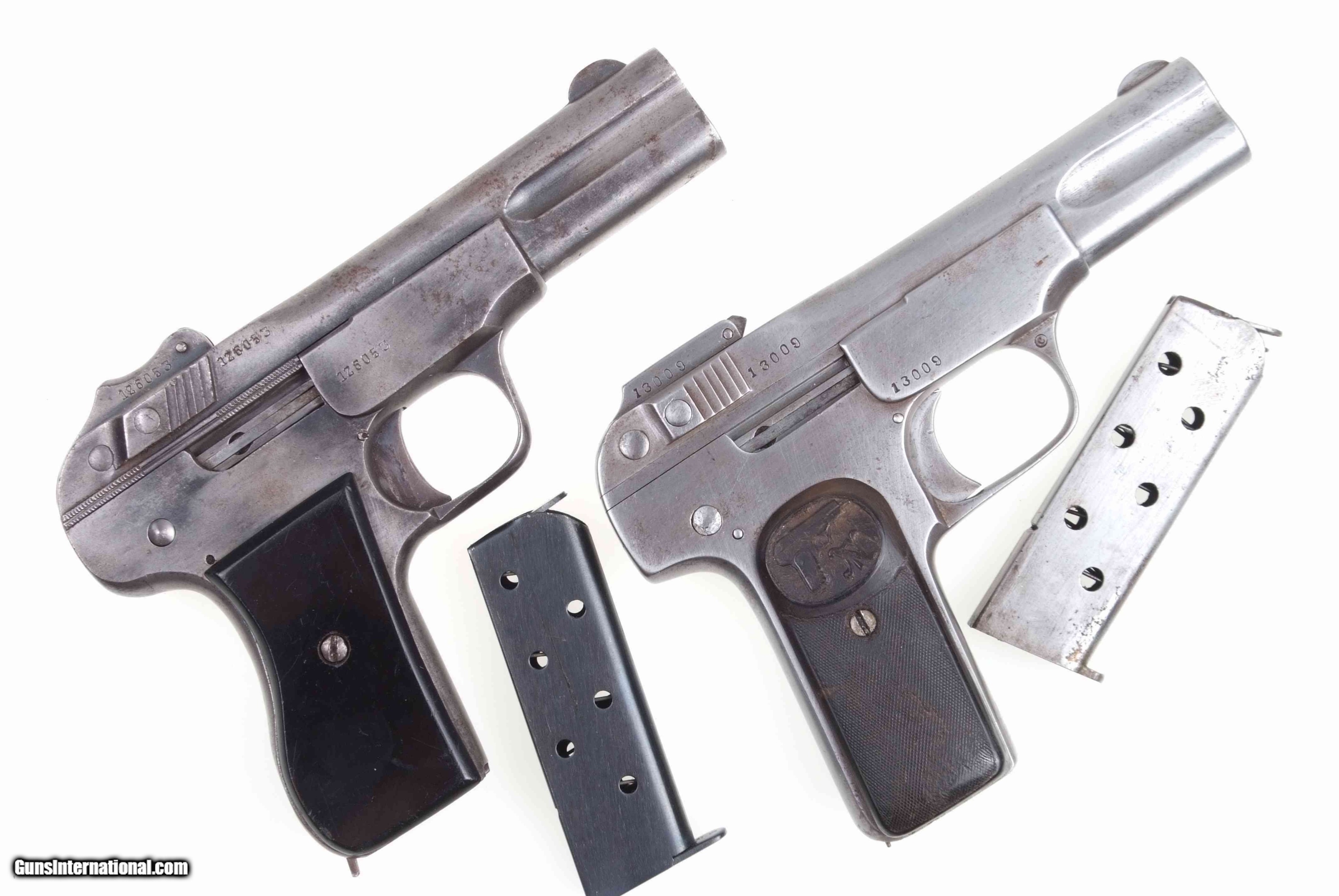 Description: Pistol A #126053: Standard size FN 1900 with a curved backstrap. Rear sight without a sight channel. Upside down patent reference on sideplate. Replacement grips and magazine. Pistol B #13009: Standard size FN 1900 with a straight backstrap. Rear sight with partial channel that precludes a sight picture. Fraudulent FN markings and proofs. Original grips and magazine. Synopsis: Chinese copies of the FN 1900, one with curved backstrap, the other with a straight backstrap, both with spurious FN markings. Sold as a pair. HISTORICAL RELICS, NOT TO BE FIRED! Condition: Both guns about VG-VG+ with considerable fading, pistol #13009 having been lightly polished. Both with proper manual function, though the trigger in the polished pistol is somewhat erratic, the trigger bar rubbing against the inserted magazine. Both cock properly and have a functional safety. The replacement magazine on pistol #126053 inserts fully but does not seat properly. No problems with the other pistol whose left panel has a missing segment at its base and filled lanyard ring holes. Bores generally dark. An interesting and attractive pair with enough differences to underscore their artisanal origins. Again, they are being sold as interesting historical relics. These are NOT TO BE FIRED! NOT TO BE FIRED! NOT TO BE FIRED! ~~Insured shipping fee of $55; most packages shipped using FedEx 2nd Day.~~ SOLD Manufacturer: Chinese Serial Number: 126053, 13009 Caliber Info: 7.65mm |