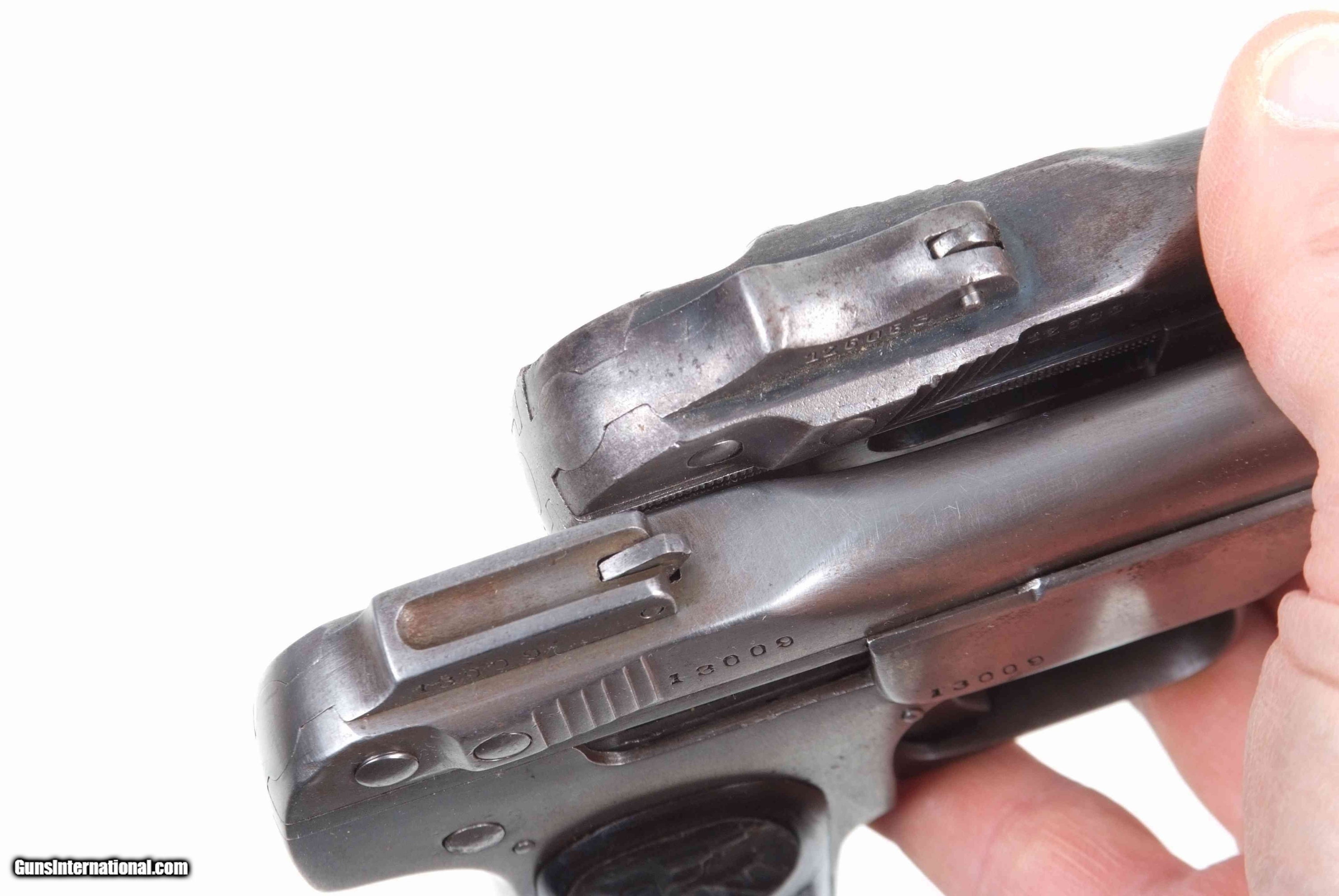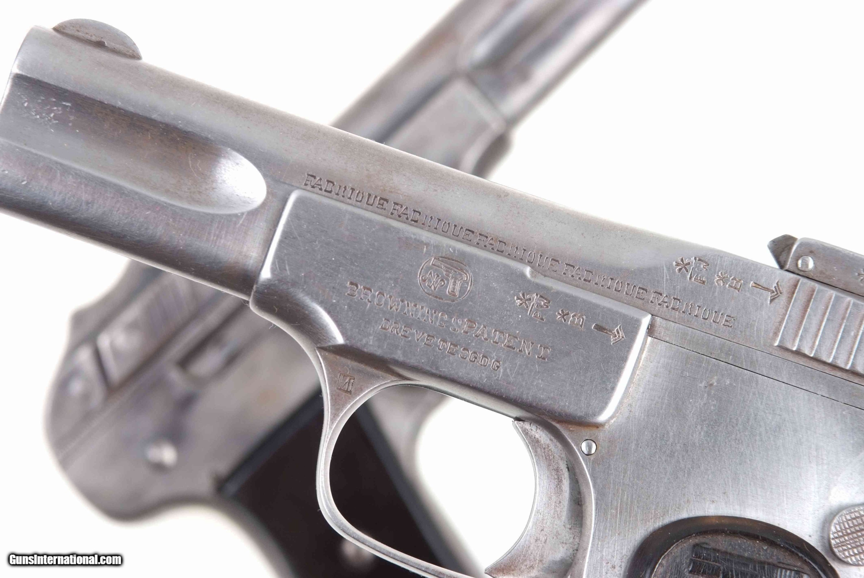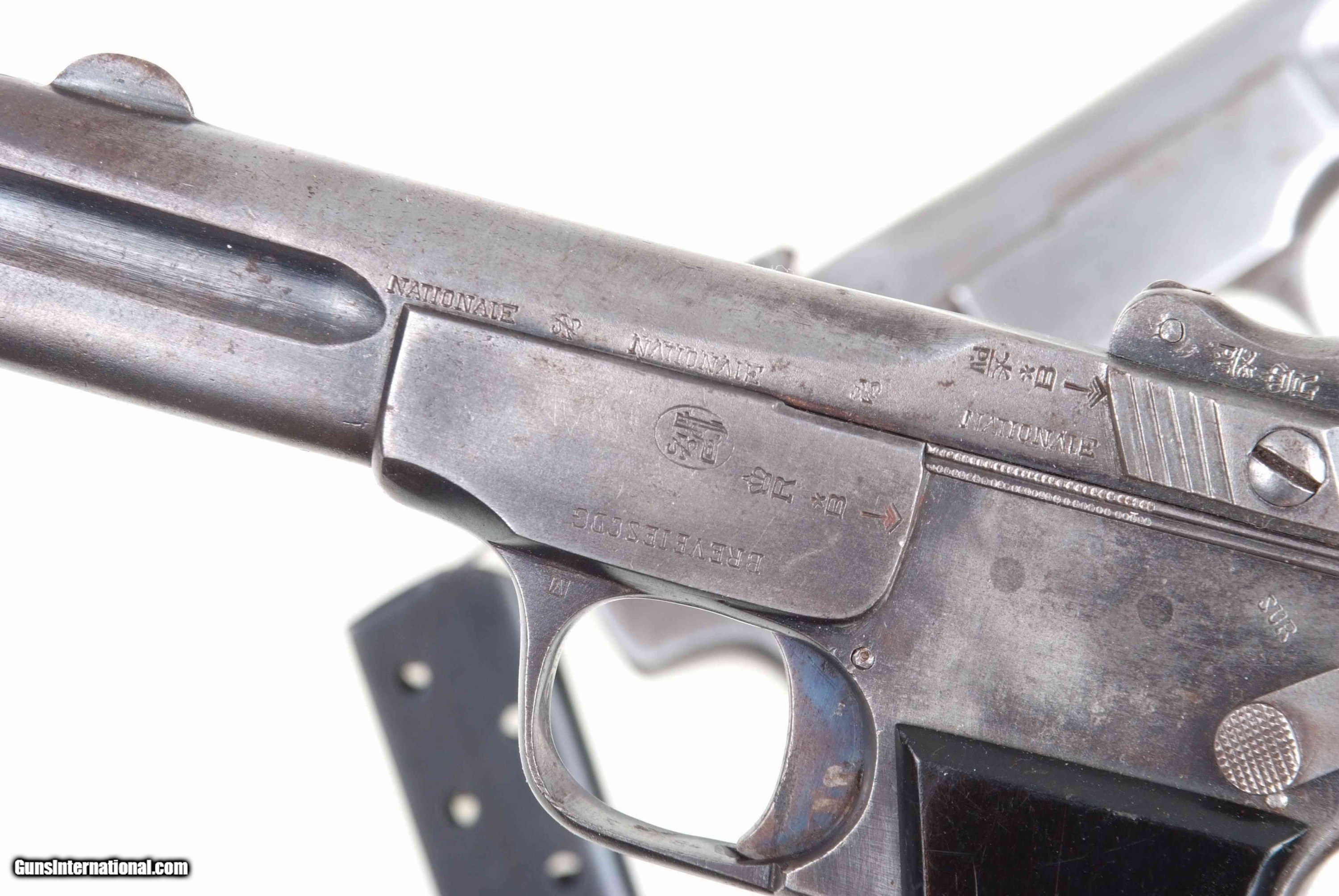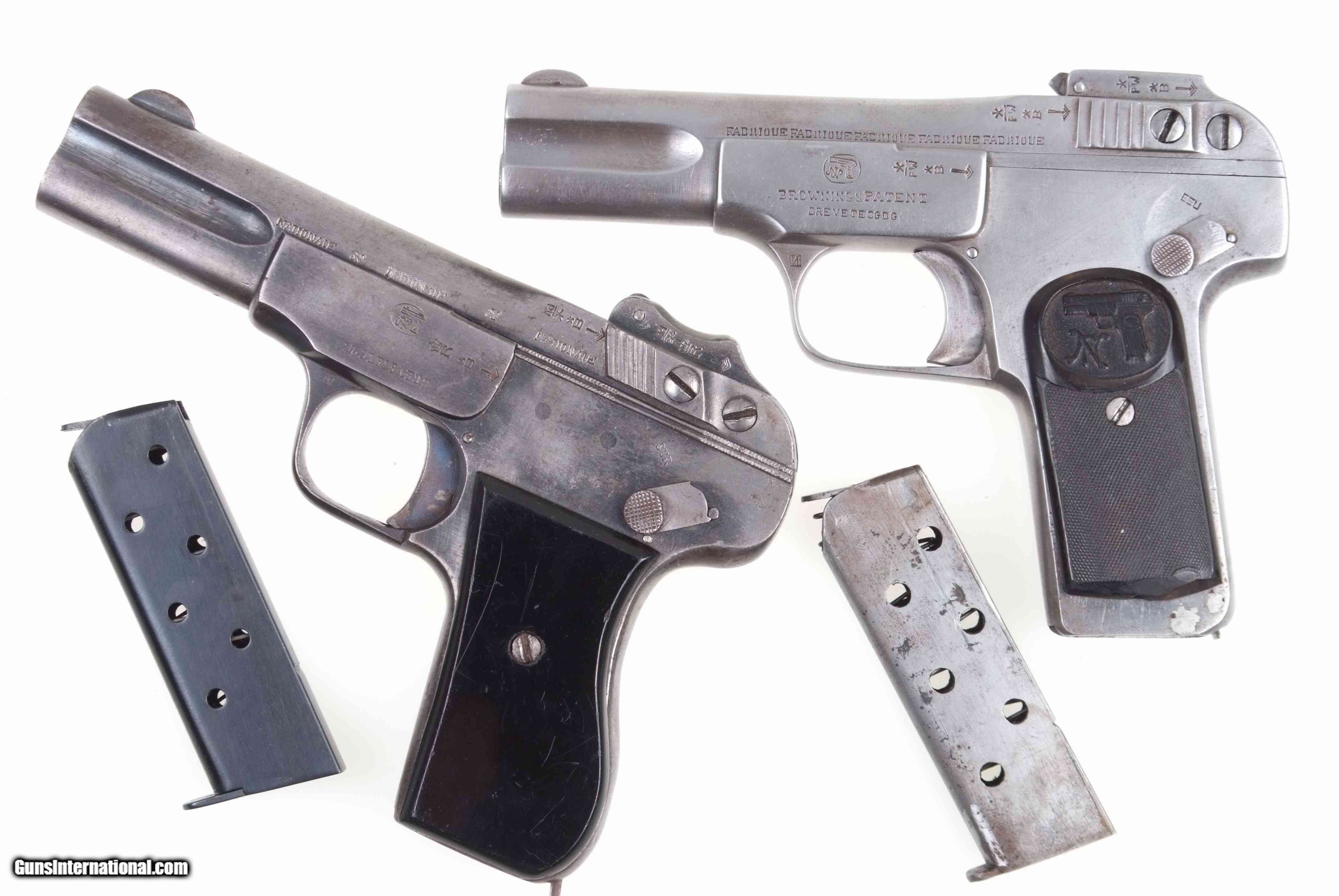Description: Pistol A #126053: Standard size FN 1900 with a curved backstrap. Rear sight without a sight channel. Upside down patent reference on sideplate. Replacement grips and magazine. Pistol B #13009: Standard size FN 1900 with a straight backstrap. Rear sight with partial channel that precludes a sight picture. Fraudulent FN markings and proofs. Original grips and magazine. Synopsis: Chinese copies of the FN 1900, one with curved backstrap, the other with a straight backstrap, both with spurious FN markings. Sold as a pair. HISTORICAL RELICS, NOT TO BE FIRED! Condition: Both guns about VG-VG+ with considerable fading, pistol #13009 having been lightly polished. Both with proper manual function, though the trigger in the polished pistol is somewhat erratic, the trigger bar rubbing against the inserted magazine. Both cock properly and have a functional safety. The replacement magazine on pistol #126053 inserts fully but does not seat properly. No problems with the other pistol whose left panel has a missing segment at its base and filled lanyard ring holes. Bores generally dark. An interesting and attractive pair with enough differences to underscore their artisanal origins. Again, they are being sold as interesting historical relics. These are NOT TO BE FIRED! NOT TO BE FIRED! NOT TO BE FIRED! ~~Insured shipping fee of $55; most packages shipped using FedEx 2nd Day.~~ SOLD Manufacturer: Chinese Serial Number: 126053, 13009 Caliber Info: 7.65mm |