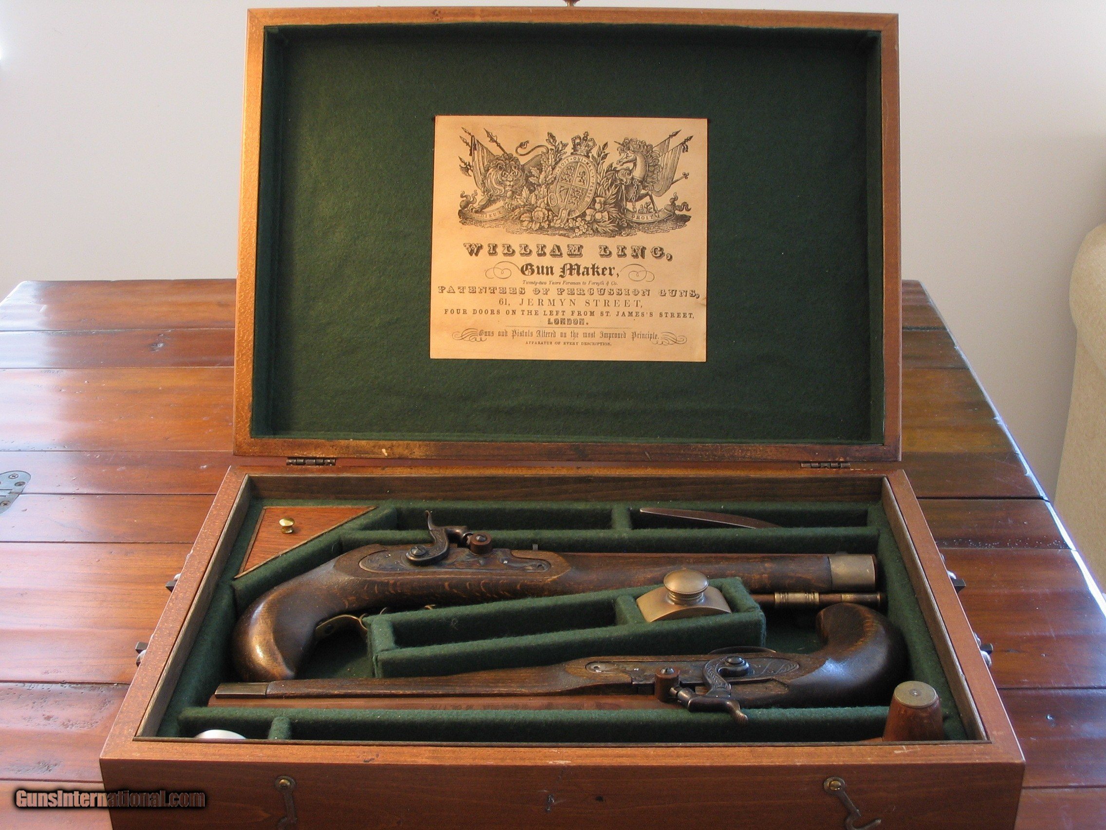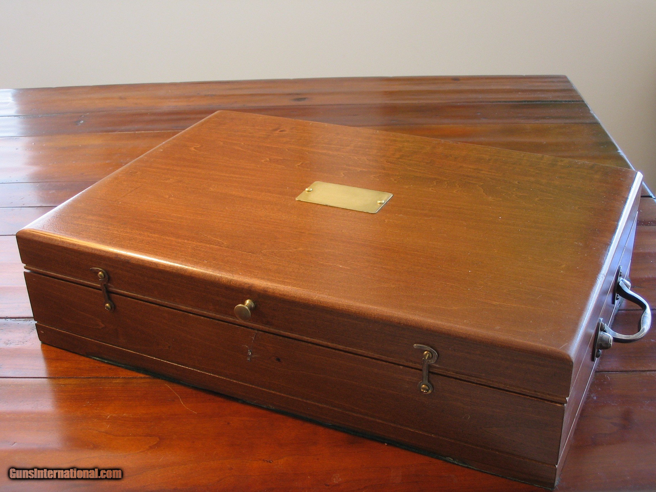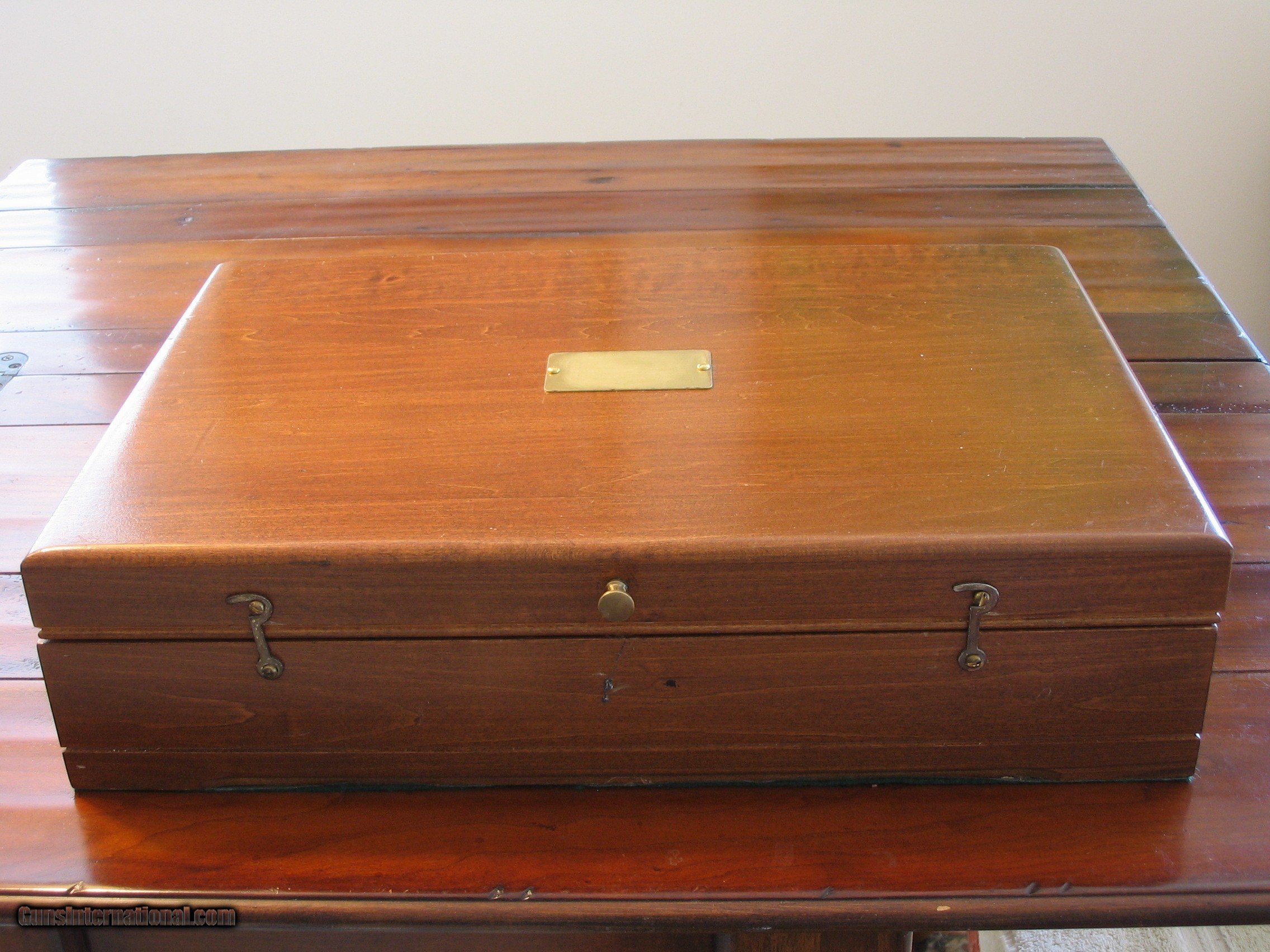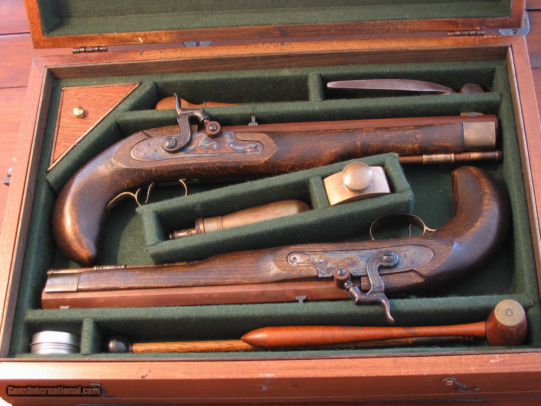 Description: This is an Antique Recreated ca.1845 English Gentlman`s .50 cal. Blackpowder Muzzleloader Percussion Pistol Cased Set housed in a 17"x 12"x 4.5" Walnut Case with a Custom Designed Dark Green Interior. Pistols and Contents weigh 10 lbs. The pistols have Walnut Stained hardwood stocks, 9.75" Octagon Browned Barrels, Brass Furniture and Color Casehardend Locks. They have not been fired. All Gentlmen should have a cased dueing pistol set in their study. It will be shipped to you in the U. S. only after your payment clears using PayPal or USPS postal money order. It can not be shipped to canada or New Jersey. We also custom design pistol cases to your specifications. SOLD |