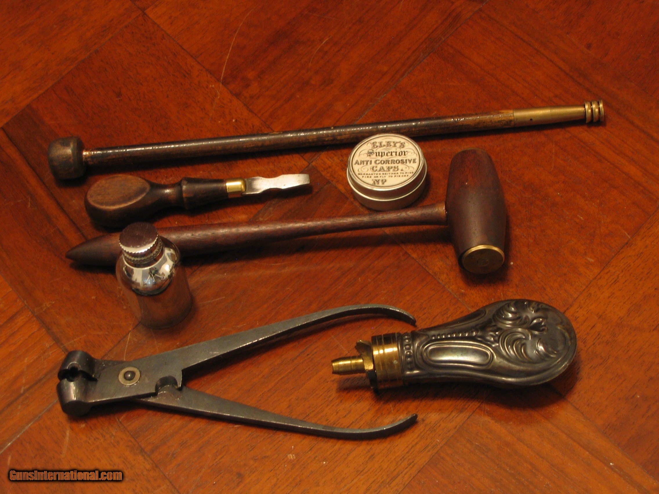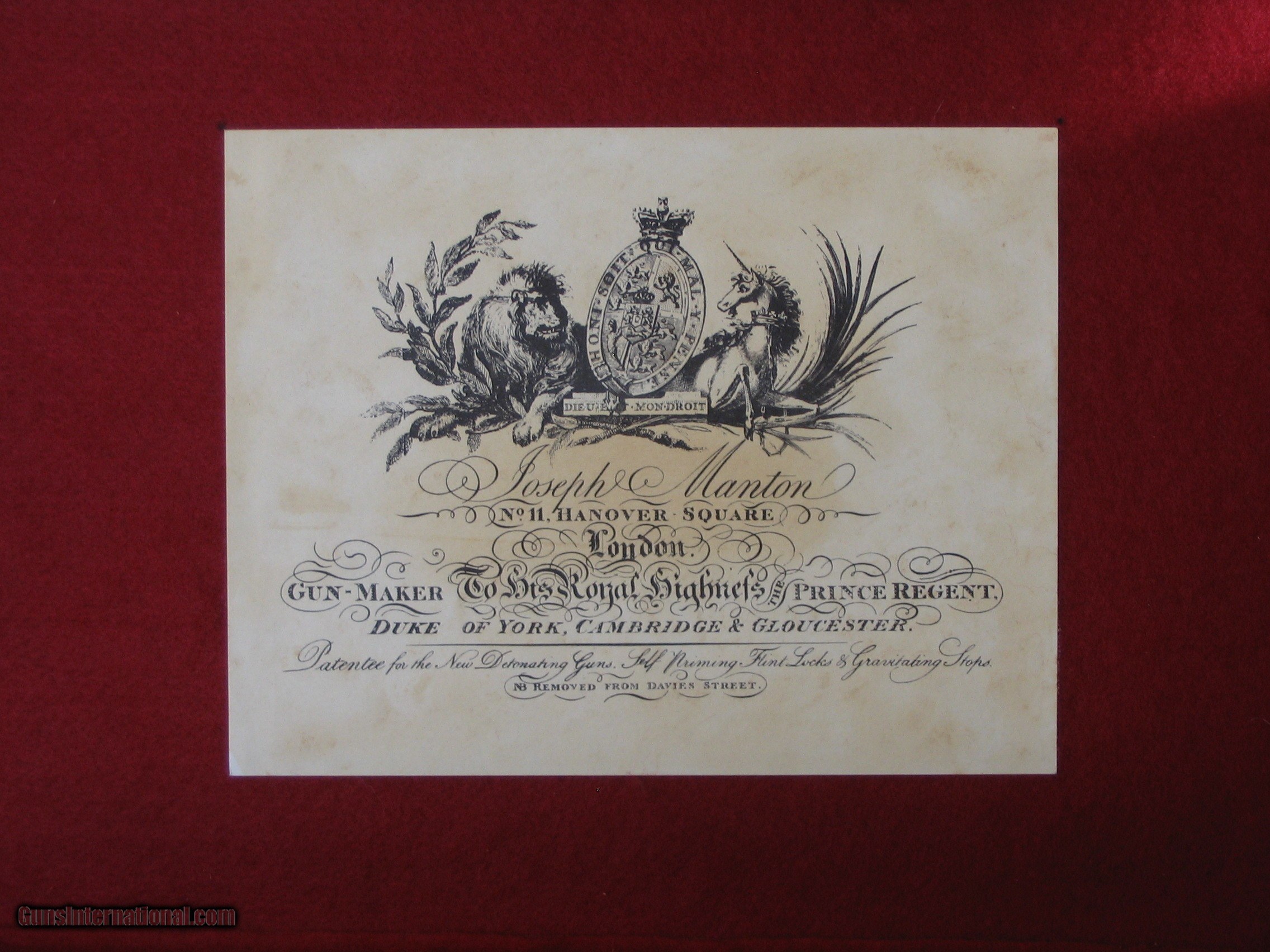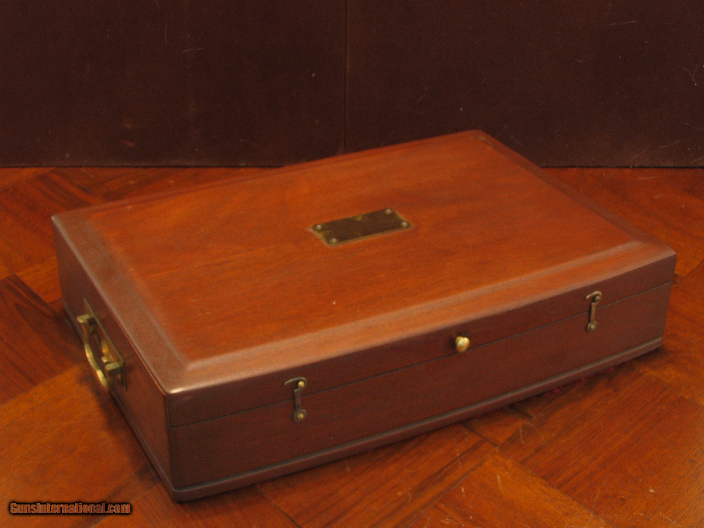 Description: This is a replica .50cal. ca.1850 Percussion Blackpowder Muzzleloader Cap and Ball English Gentlemen`s Manton Dueling Pistol Cased Set with Accessories. Every Gentleman should have a dueling pistol cased set in his den. The pistols and accessories are housed in a 17"x 11.5"x 4" Mahogany Case that weighs 10 lbs. It has a Burgundy Felt Custom Interior. The pistols have been modified from unfired CVA Kentucky pistol kits. The 10" barrels are browned and the stocks are stained walnut, finished with multi coats of True Oil. the bottom of the case is covered with burgundy felt to protect you furniture. It will be shipped to you in the U. S. only after your payment has cleared using PayPal. They can not be shipped to New Jersey or Canada. SOLD |