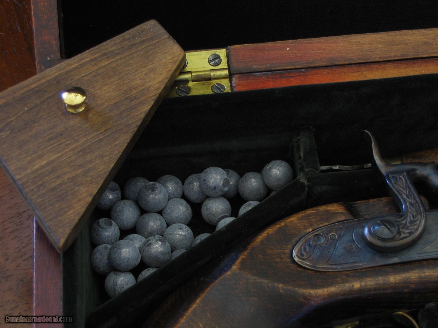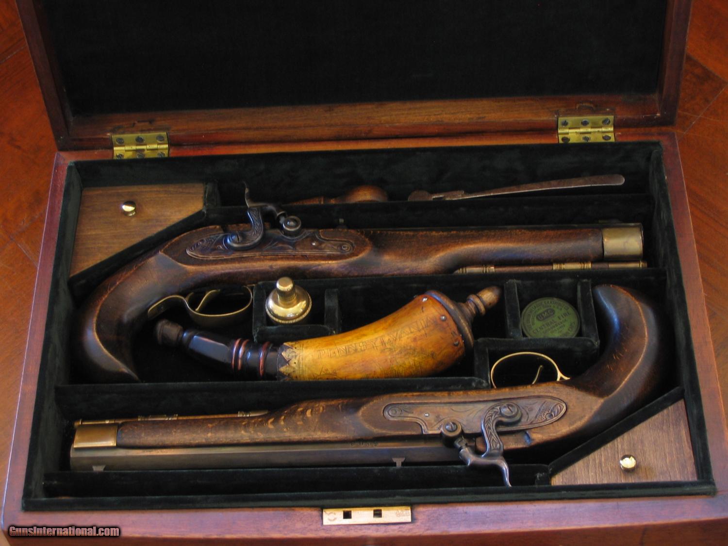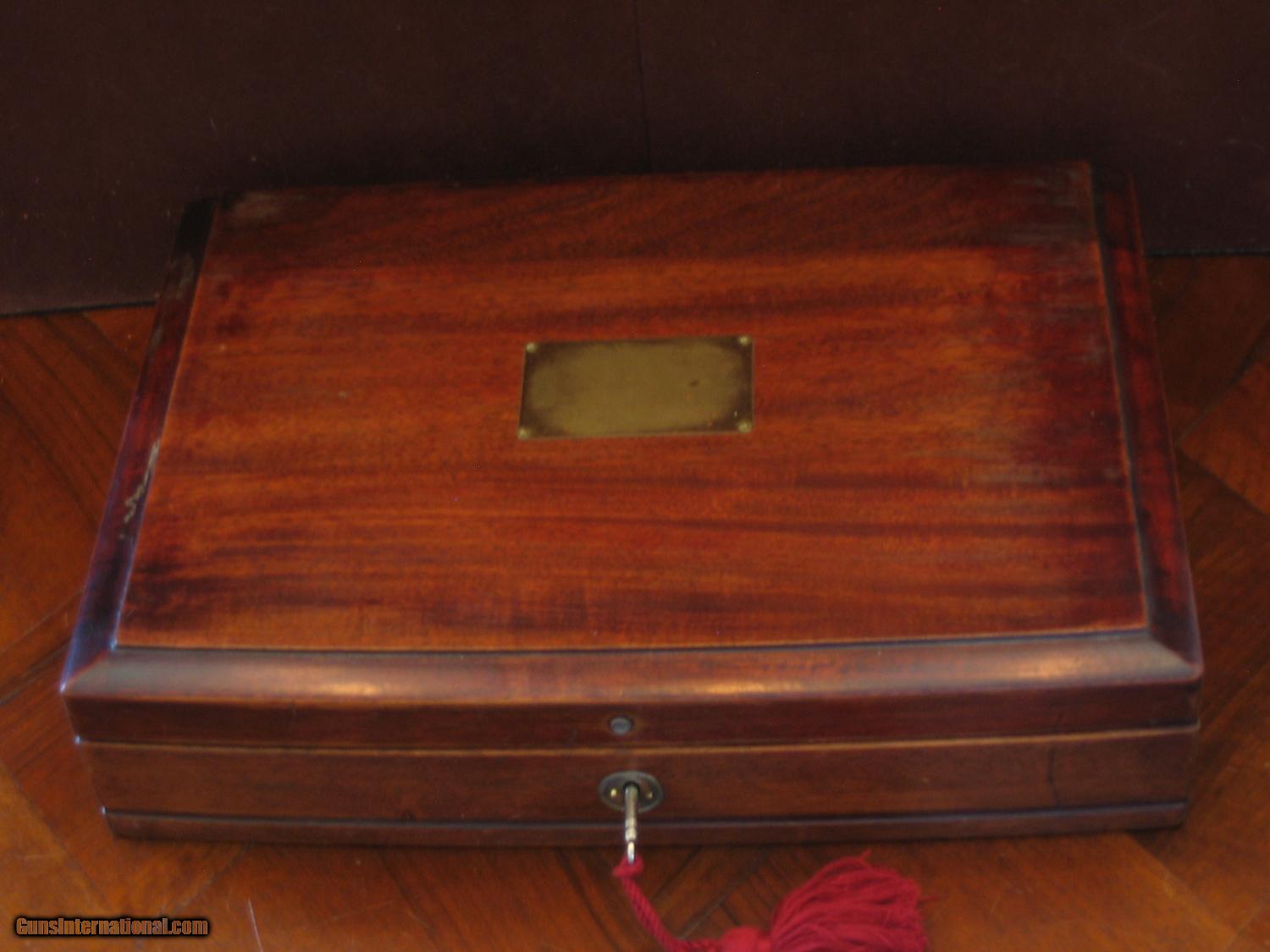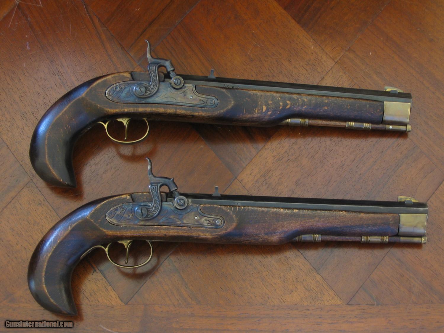Description: This is a .50 cal Kentucky Pistol Cased Set. The case is solid Mahogany with a brass lock and working key. The fitted interior is covered with dark green velvet. It is 17"x 12"x 4"high. The pistols were made from Traditions kits. They have not been fired. The accessories include a turnscrew, .50 bullet mold, cap tin, brass oiler, cleaning rod and .50 cal balls. There is a scrimshawed real 9" powder horn. The bottom is covered with green felt. It will be shipped to you after your payment clears using PayPal only. Offers are welcomed. No shipping to N.J. or Canada. US only. SOLD |