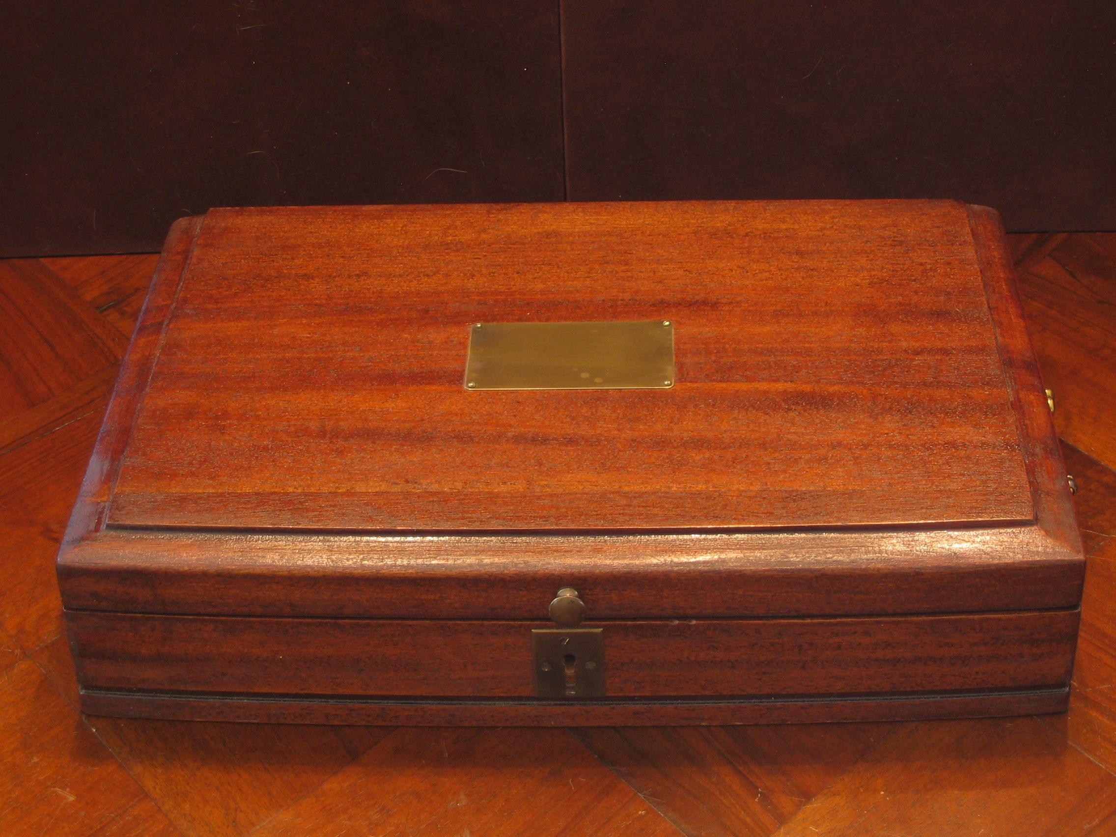 Description: This is a Replication of an Antique ca.1845 English William Moore Grey, London, Percussion Blackpowder Dueling Pistol Cased Set with the proper accessories. Modified .50 cal CVA Kentucky pistol kits were used. The pistols have not been fired. They are housed in a Solid Mahogany 17"x 12"x 4" fully felt lined case. It weighs 13 lbs. The case brass lock and keys were made in England. It will be shipped to you in the U.S. after your payment clears using PayPal only. It can not be shipped to Canada or New Jersey. Offers excepted. SOLD |