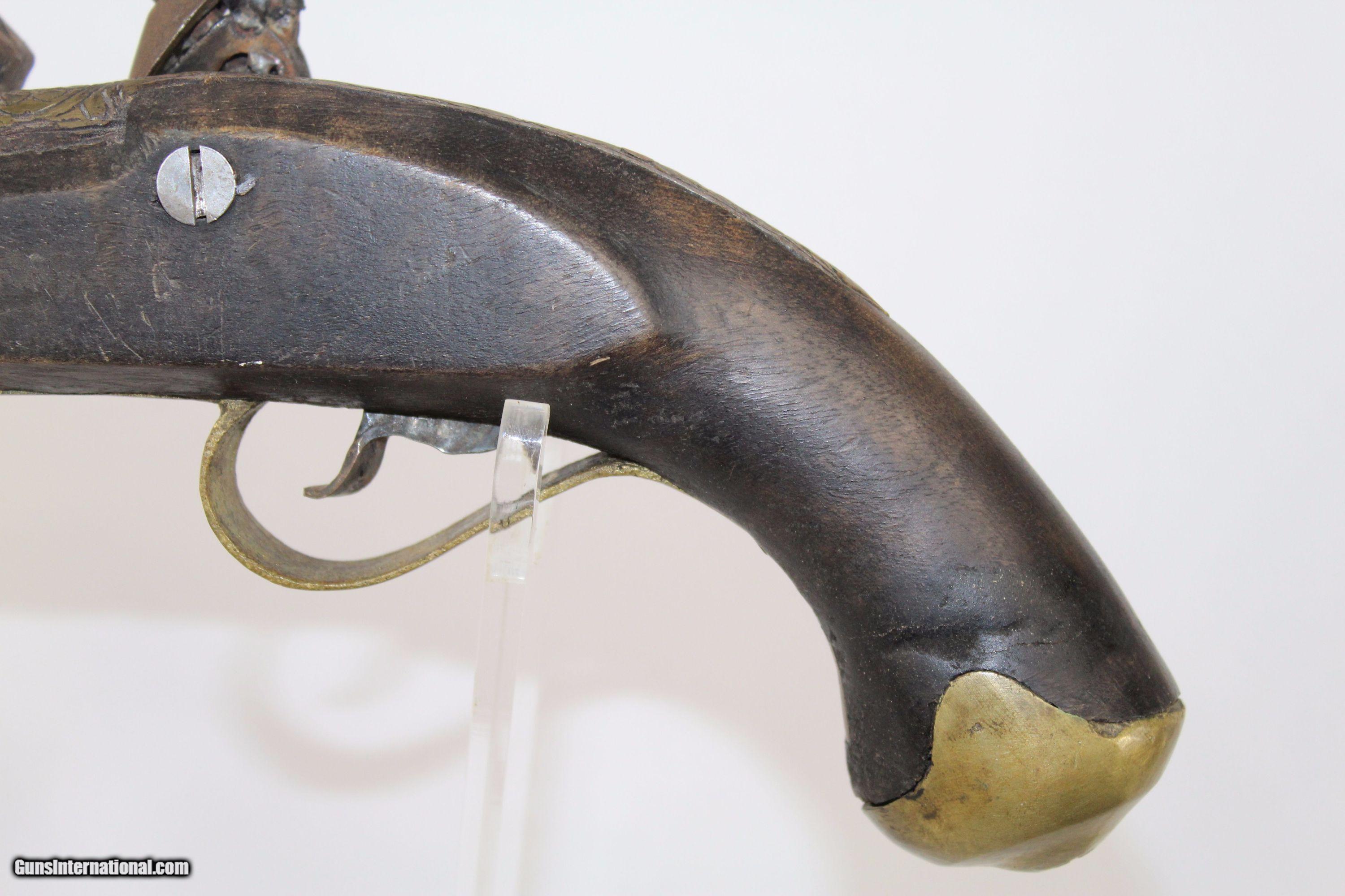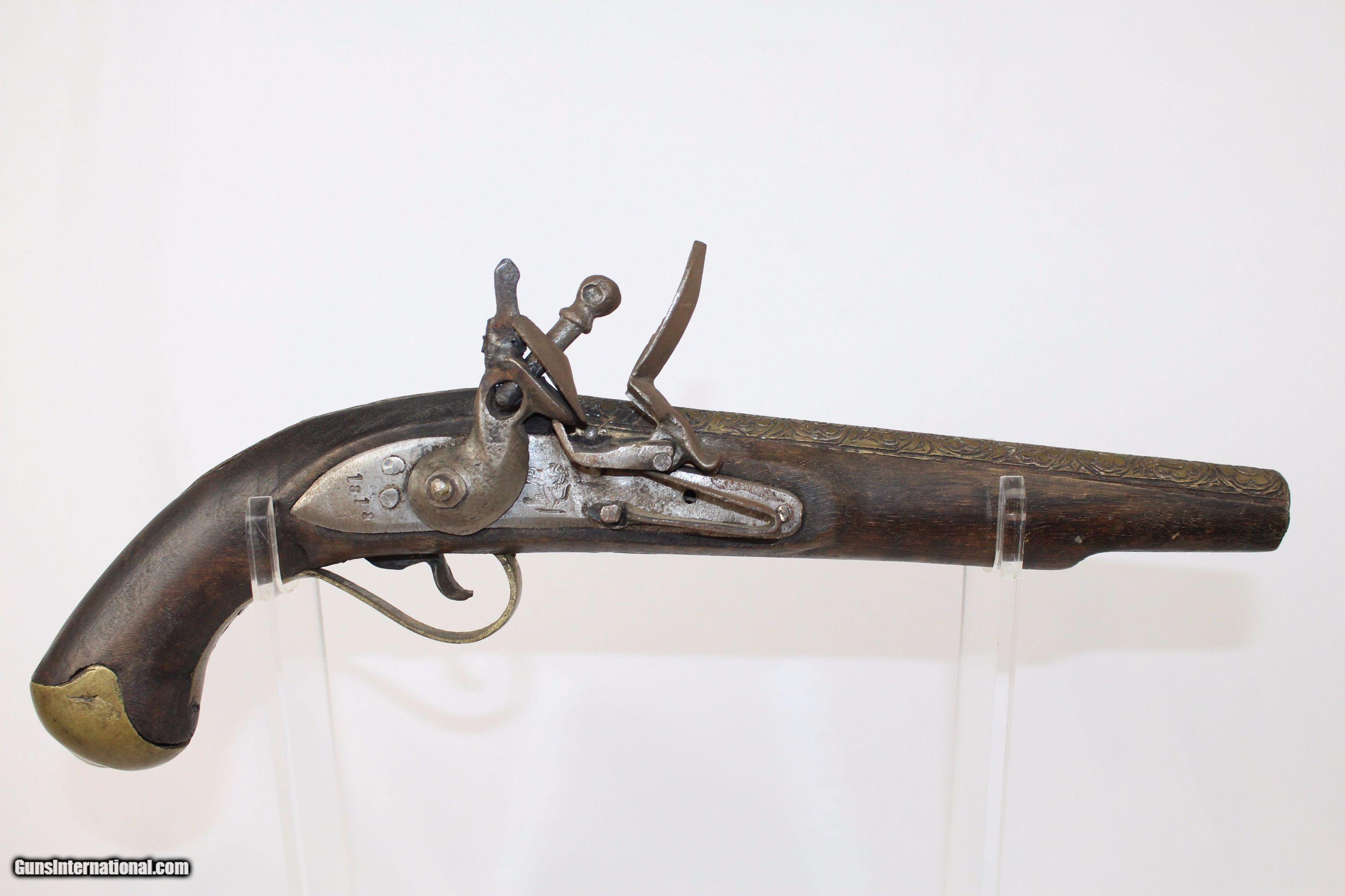 Description: Reproduction BRITISH EAST INDIA CO Flintlock Pistol Dated “1818” Here we present a Reproduction of a British East India Company Flintlock Pistol, stamped with the date “1818”. This piece was likely made in the Middle East to sell to tourists or soldiers. The barrel and tang are engraved. It was not meant to be fired, thus the vent was not completely drilled out. Barrel is 8-1/2 inches. Caliber: .45 Overall condition as seen in photos. Very Fast. Very Safe. FREE SHIPPING WORLDWIDE. Delivered directly to your door by express mail! ancestryguns $600 #5412 SOLD Antique: Yes |