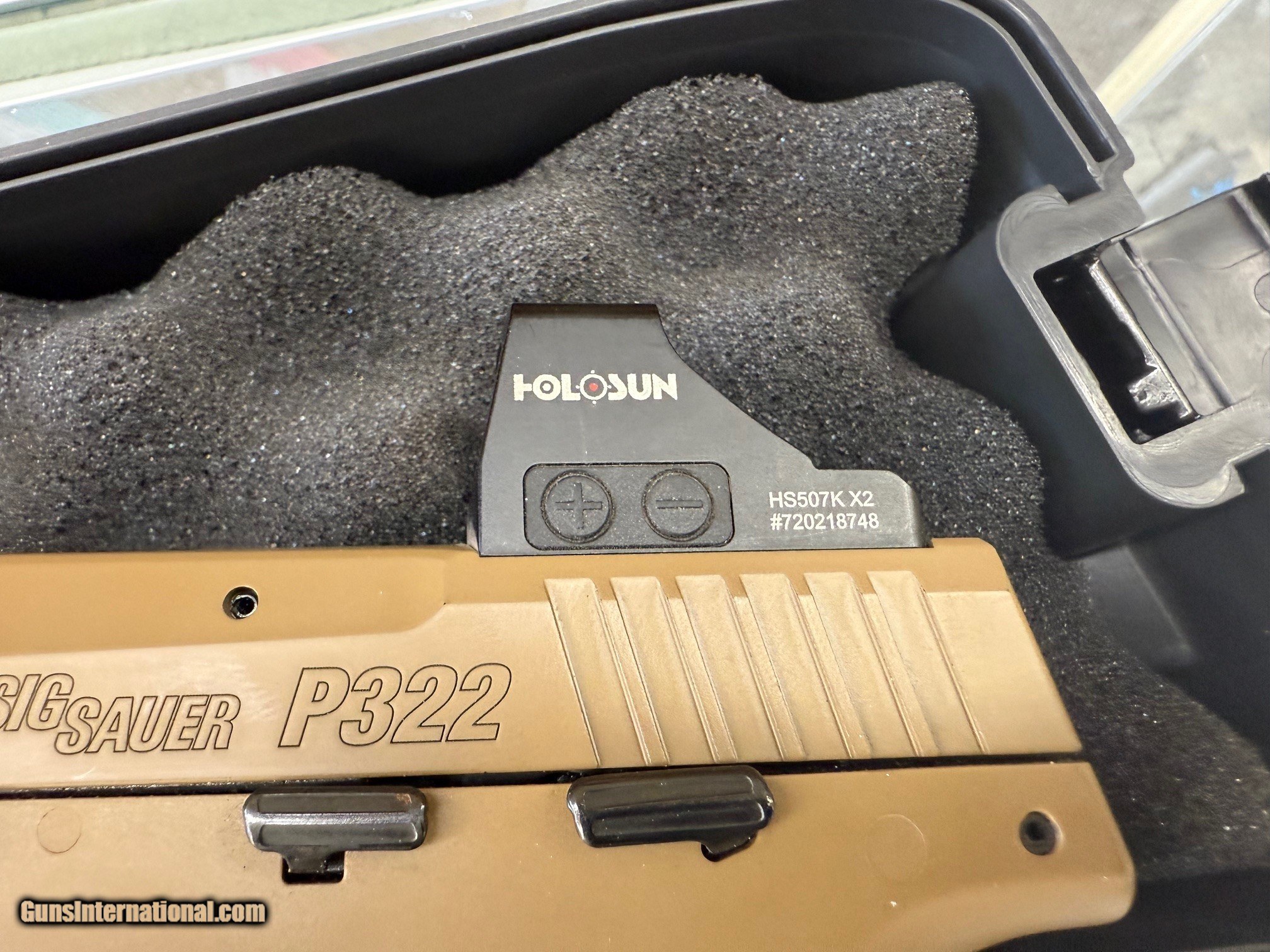 Description: The P322 features a suppressor ready w/threaded barrel adapter; Fiber Optic front and rear sights; interchangeable trigger shoes; ambidextrous controls and reversible magazine catch. Includes rear sight plate, mag loader and three 20rd polymer magazines. and HS 507k HOLOSUN RED DOT Handgun Caliber: .22 Long Rifle Manufacturer: Sig Sauer Model: P322 Barrel Length: 4.5 Condition: Excellent Price: $499.99 Contact Seller |