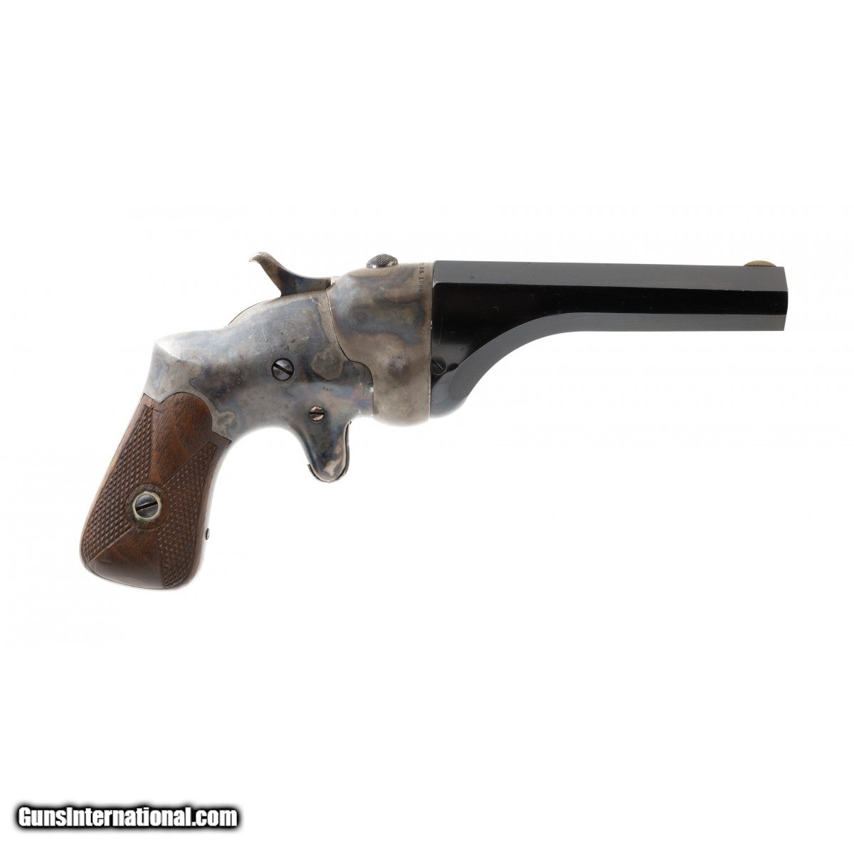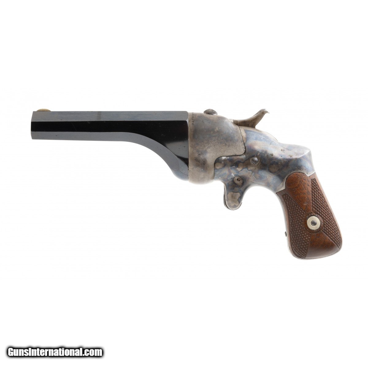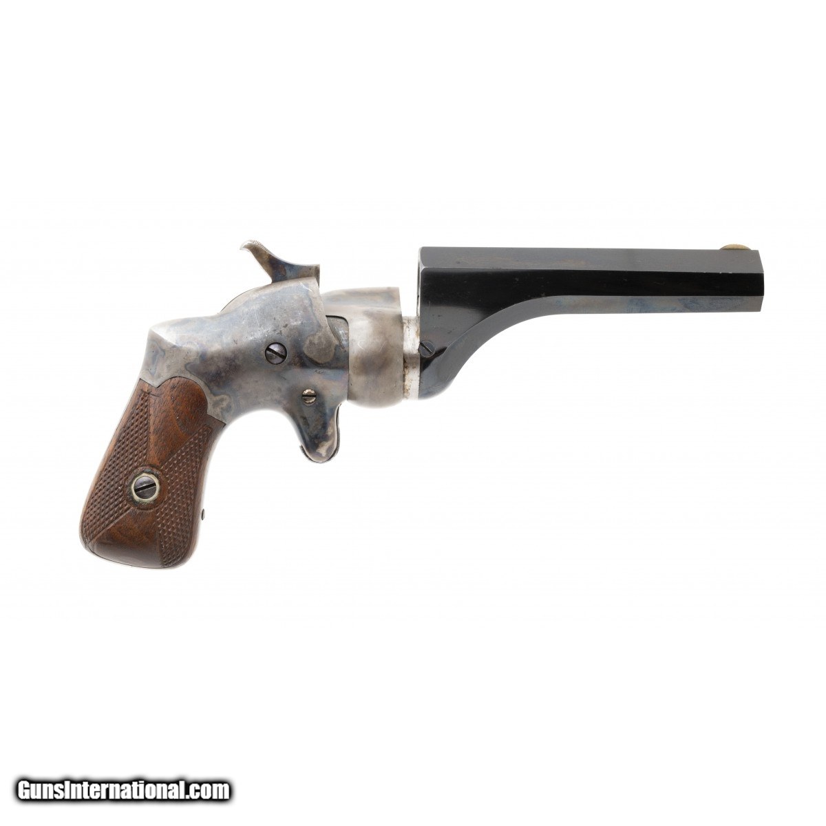 Description: " Beautiful example! Barrel is marked ""Connecticut Arms & Manfucaturing Co. Naubuc Conn"". Barrel is 4"" and has 99% of it's original finish. Frame and breech block have vivid case colors. Walnut grips are checkered and the checkering is sharp and crisp. This is the best condition Hammond Bulldog we have owned! SOLD |