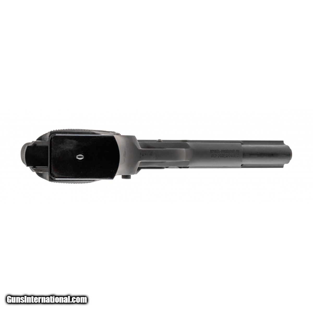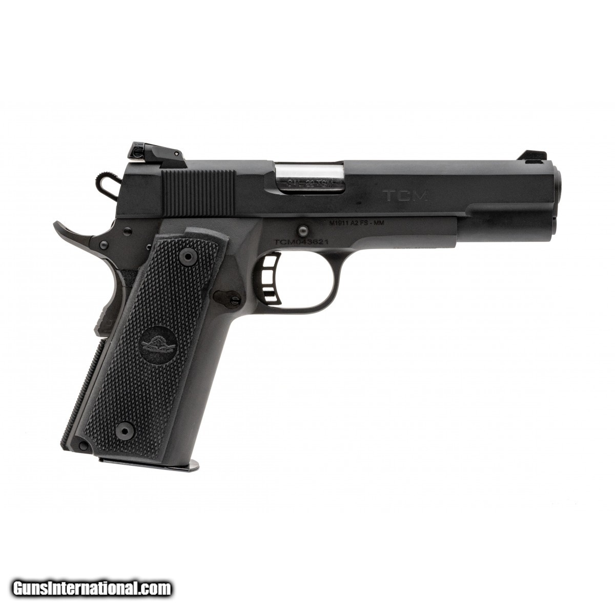 Description: " SN: TCM043621. Modern production. Chambered in .22 TCM with a 5"" barrel, bore is excellent. Full size 1911 with double stack magazine, parkerized finish, adjustable rear sight, extended beavertail and checkered black grips. Overall very good condition. Comes with box, 9mm barrel-spring and 3 boxes of ammo. (Consignment) SOLD |