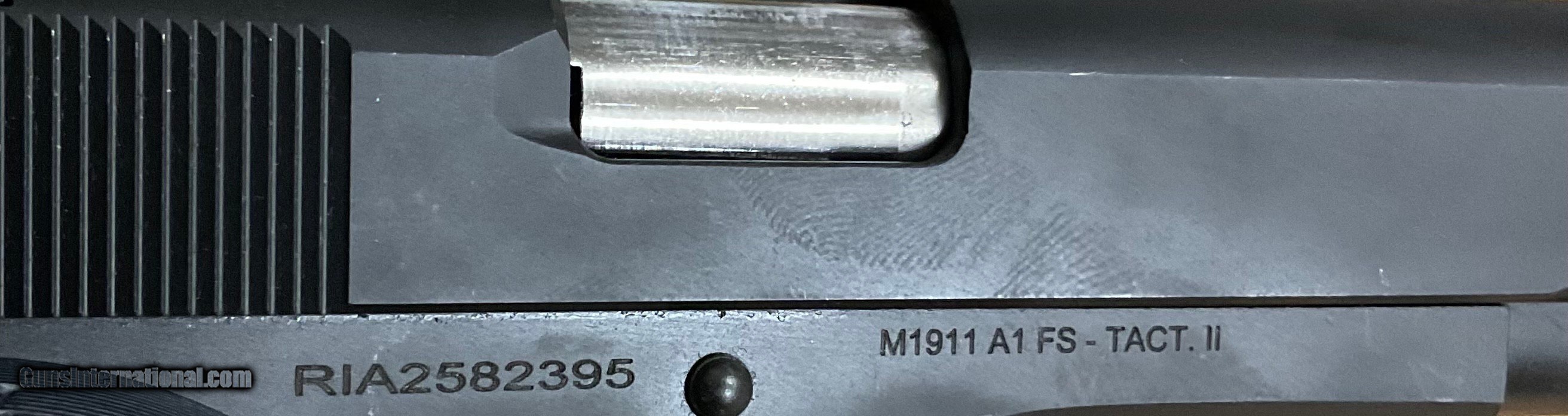Description: Brand New Rock Island Armory M1911 A1 FS Tactical II semi-automatic 10mm pistol. Very nice comfortable grip and all black finish. Buyer is responsible for a 35 shipping charge. SOLD Handgun Caliber: 10mm Auto Manufacturer: Rock Island Armory Model: M1911 A1 FS Tactical II Serial Number: RIA2582395 Condition: New |